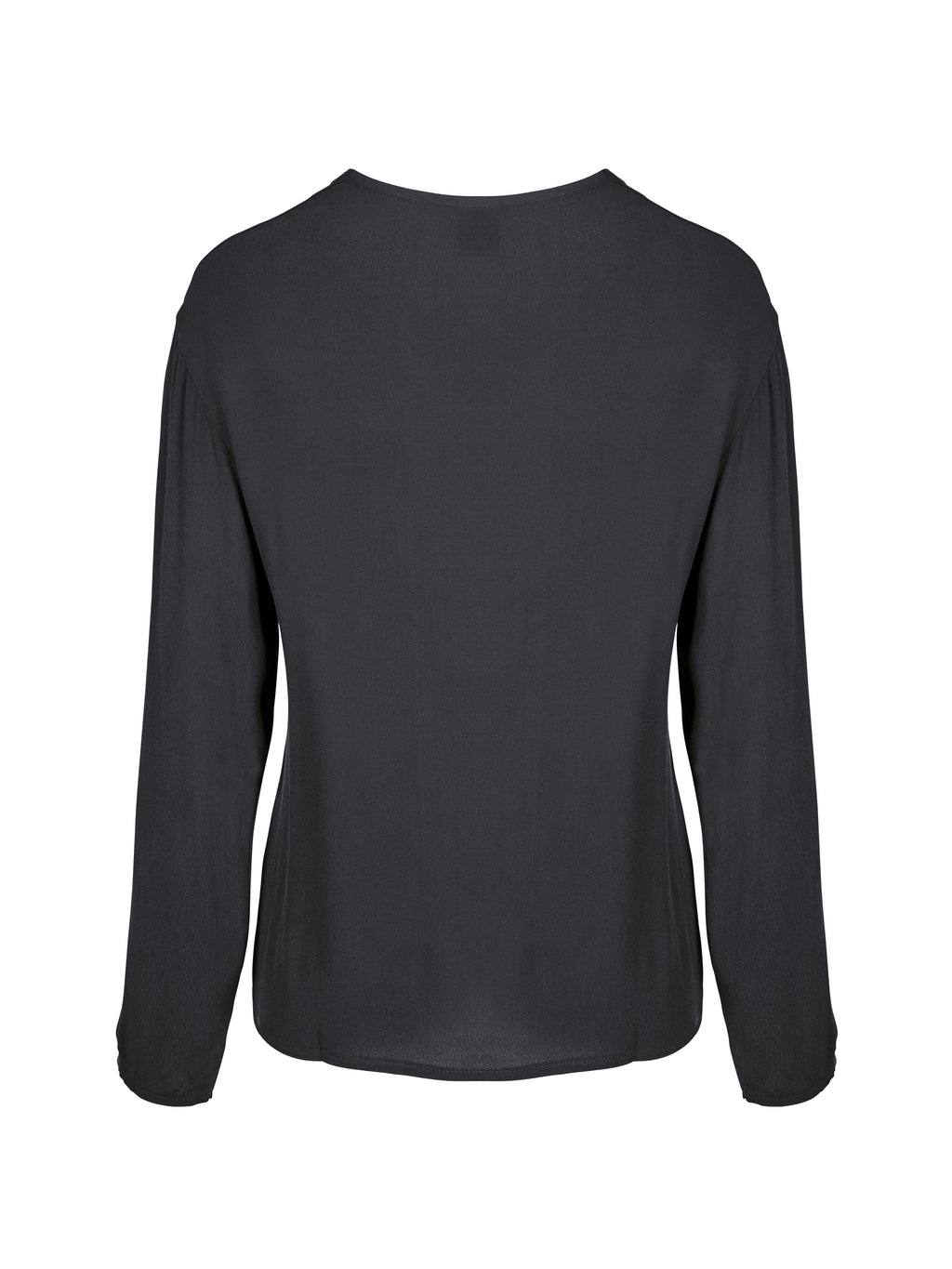 Diese Bluse hat einen lockeren und modernen Schnitt mit einem V-Ausschnitt und langen Ärmeln. Die leichte und weiche Qualität macht sie angenehm zu tragen, während das dekorative Vorderteil der Bluse einen grafischen und eleganten Look verleiht. Die asymmetrische vordere Naht schafft ein interessantes Detail und verleiht dem schlichten Design Tiefe.