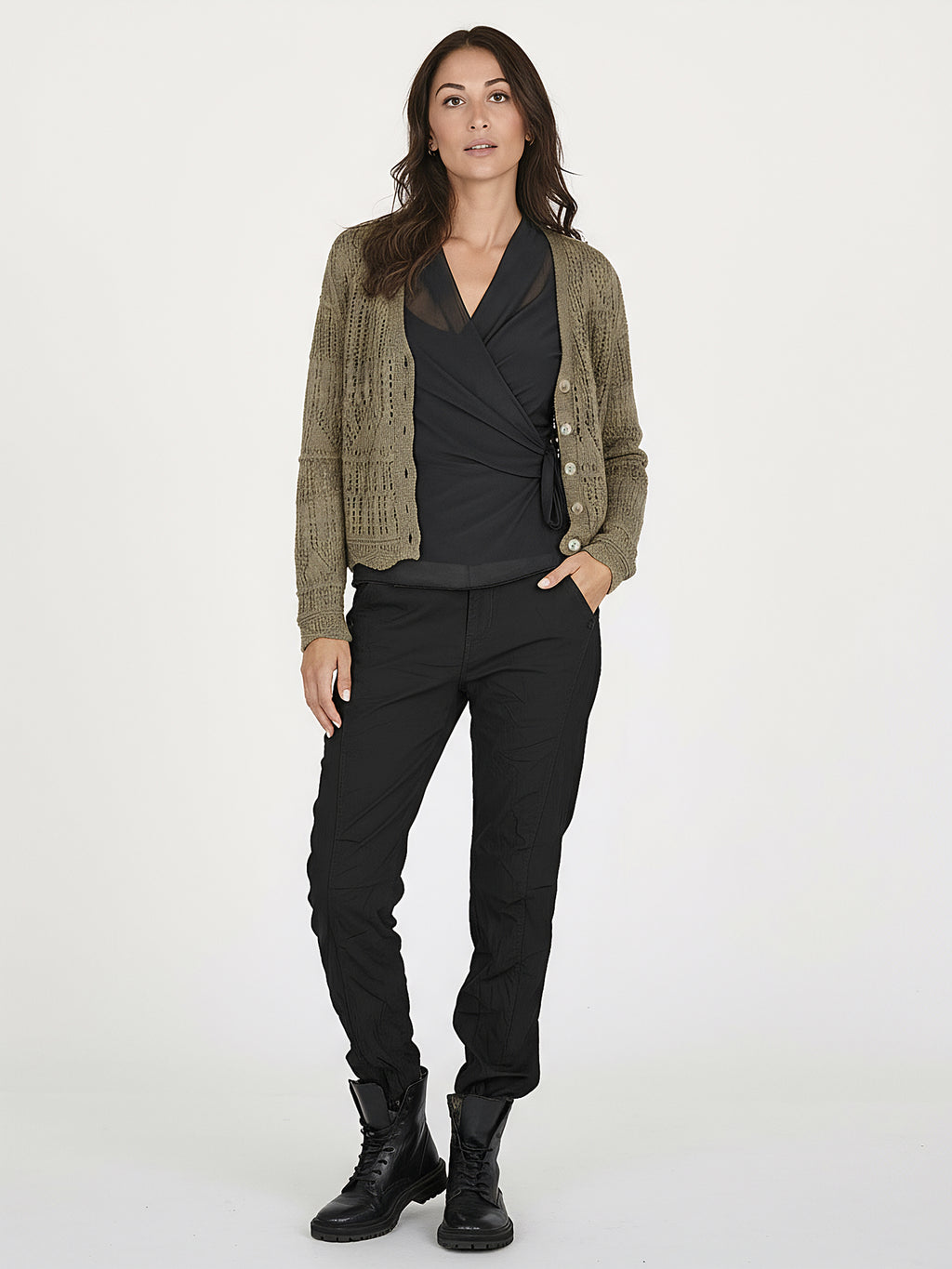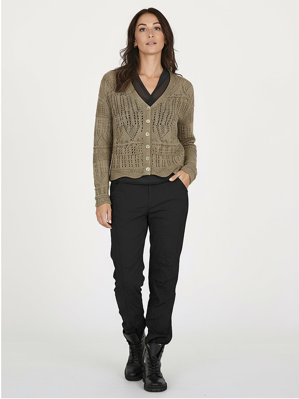 Dieser gestrickte Cardigan bietet eine schöne Kombination aus Musterstricken und femininen Details. Er ist aus einem leichten Material gefertigt, mit Spitzenmustern in verschiedenen Variationen und verfügt über eine elegante V-Ausschnitt. Perlmuttknöpfe auf der Vorderseite und eine Wellenkante am Saum und an den Ärmeln vervollständigen den romantischen Look.