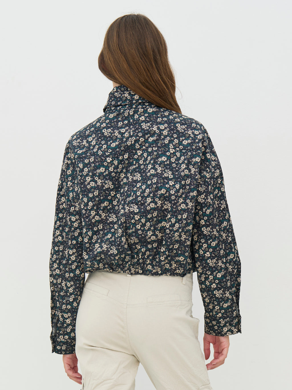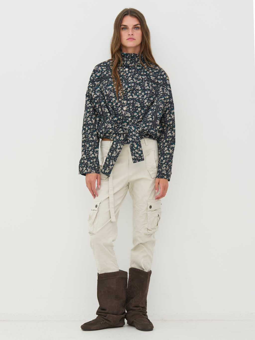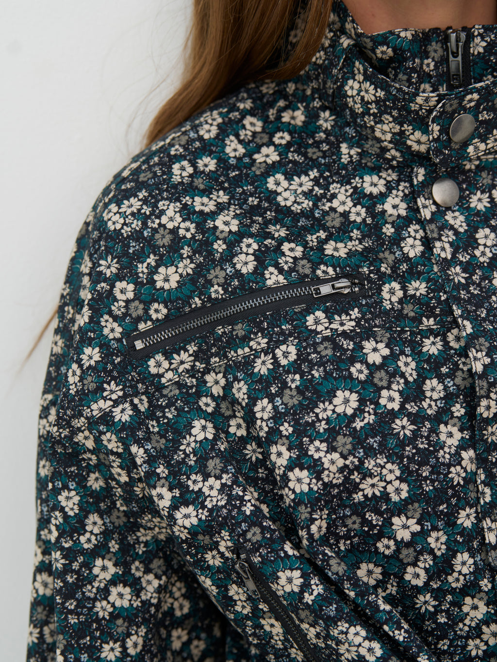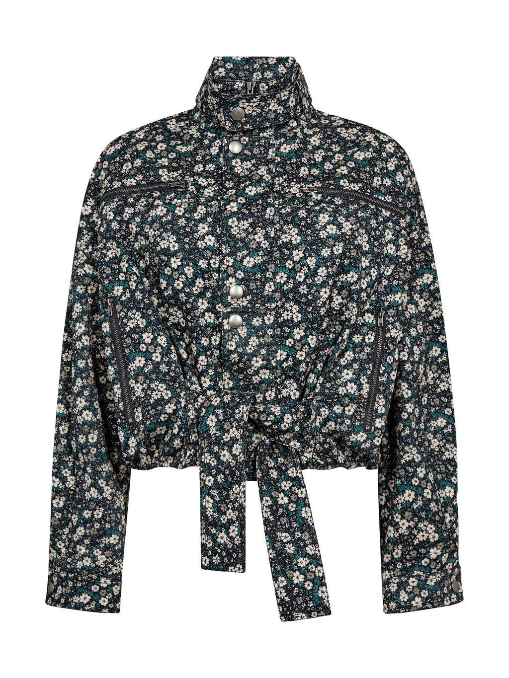 Diese Blumenmusterjacke hat einen femininen, aber coolen Ausdruck mit ihren vielen Details und der kurzen Silhouette. Vorne ist die Jacke mit Reißverschlüssen und Druckknöpfen ausgestattet, die für einen modernen Touch sorgen, während der breite Taillengürtel es ermöglicht, die Passform nach Bedarf zu formen. Der hohe Kragen rundet den Look ab und verleiht der Jacke ein elegantes, stimmiges Erscheinungsbild. Kombinieren Sie sie mit der passenden Hose zu einem Set oder tragen Sie sie über neutralen Stilen, um das Muster hervorzuheben.
