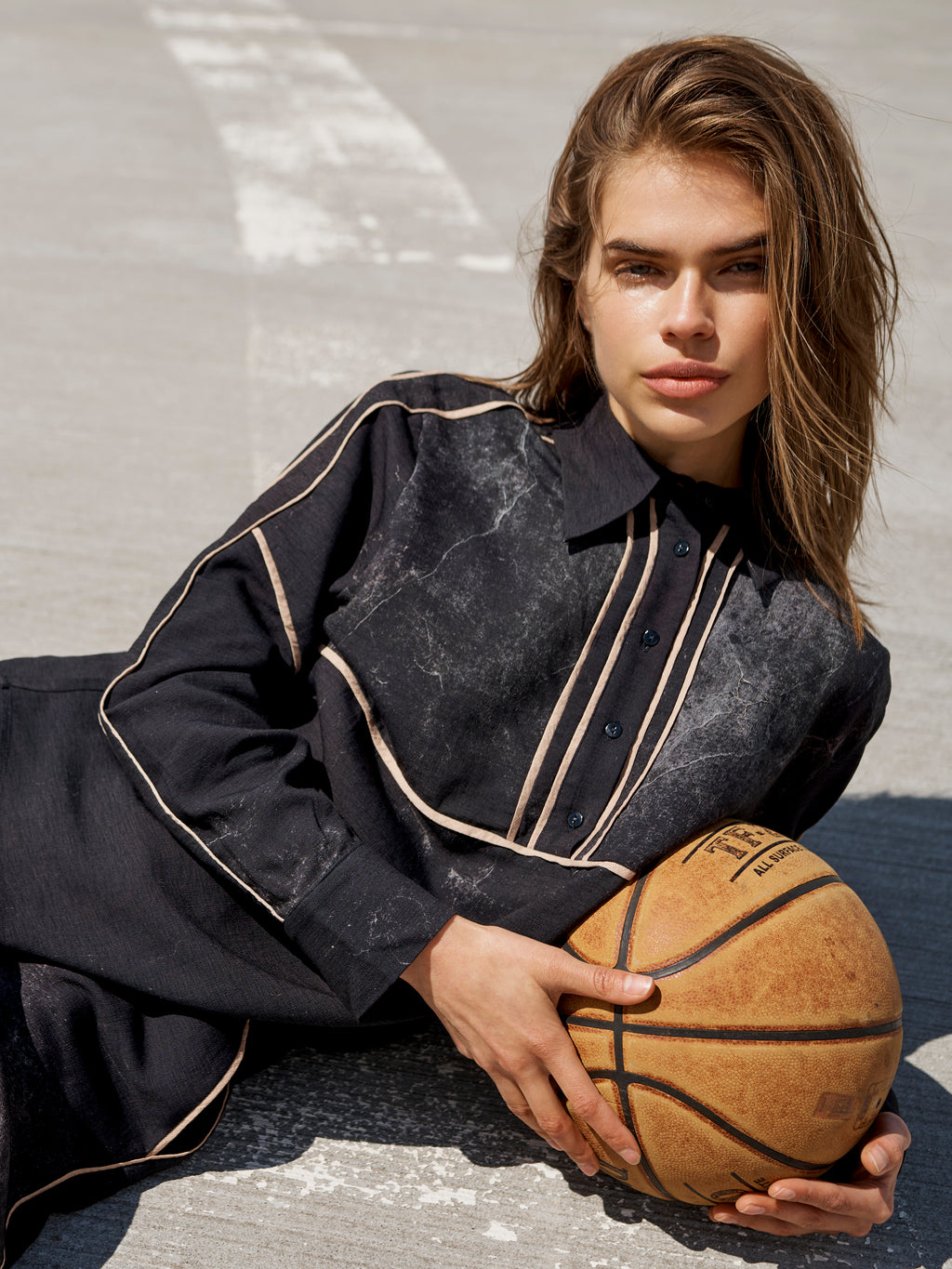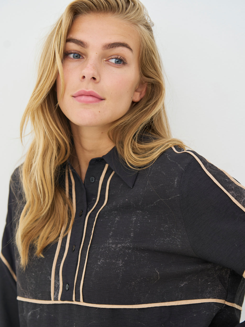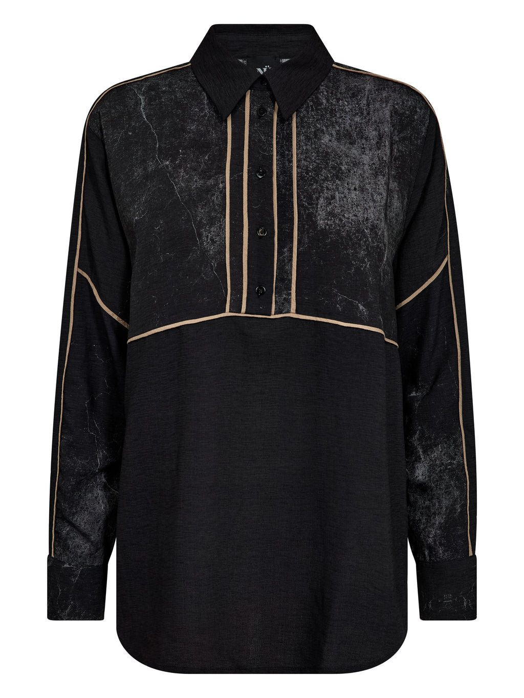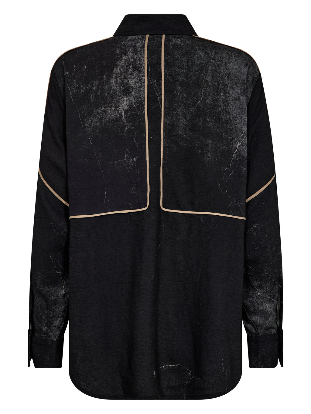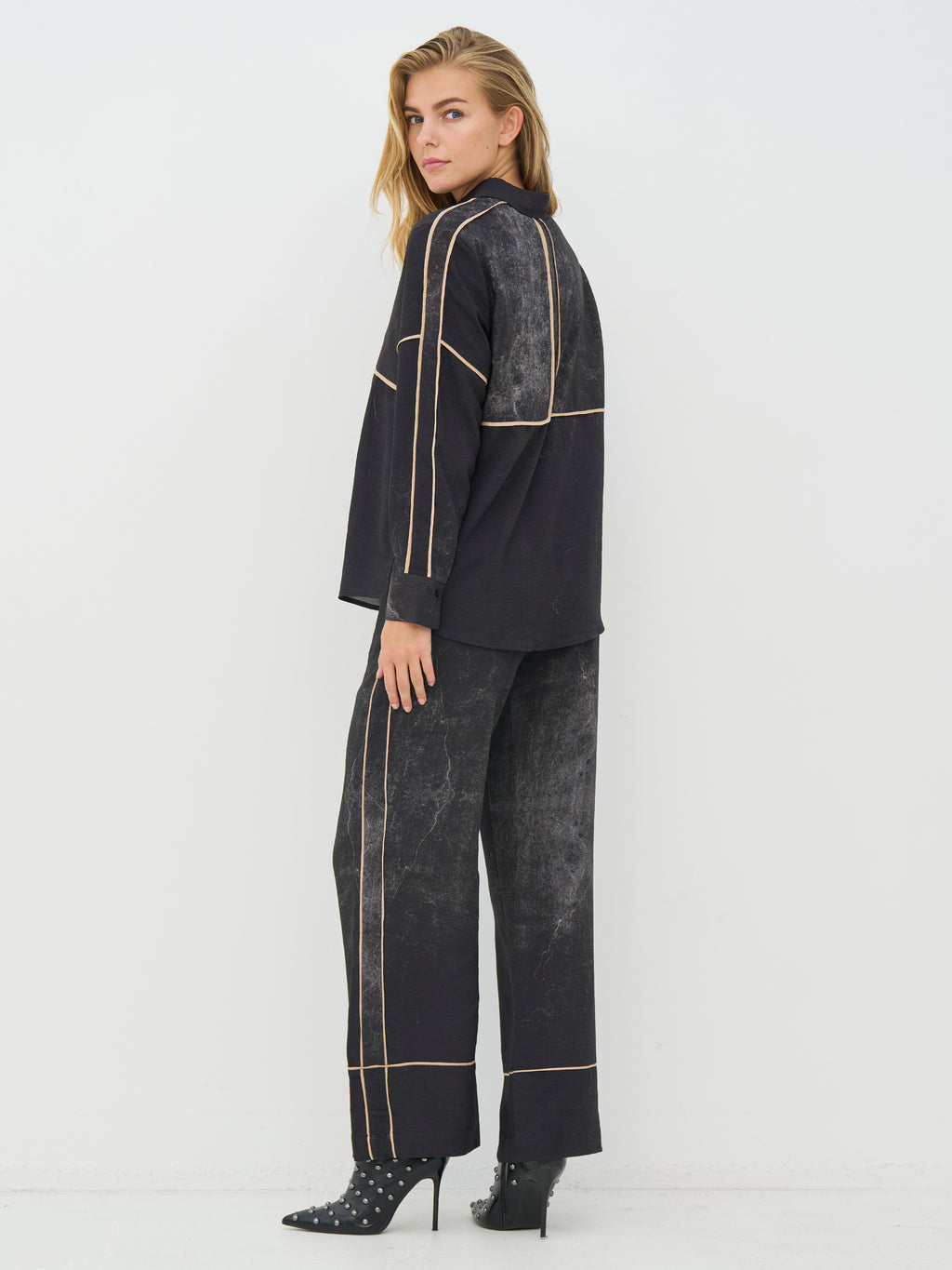 Dieses Hemd hat einen entspannten, aber markanten Ausdruck mit langen Ärmeln und klassischem Kragen. Vorne befindet sich eine Knopfleiste und dekorative Linien, die Struktur und ein grafisches Spiel bieten. Der Stoff hat ein feines Muster, das sich auch auf der Rückseite fortsetzt. Das Hemd lässt sich leicht mit passenden Hosen oder einem Paar schlichter schwarzer Hosen für den Alltag oder festlichere Anlässe kombinieren.