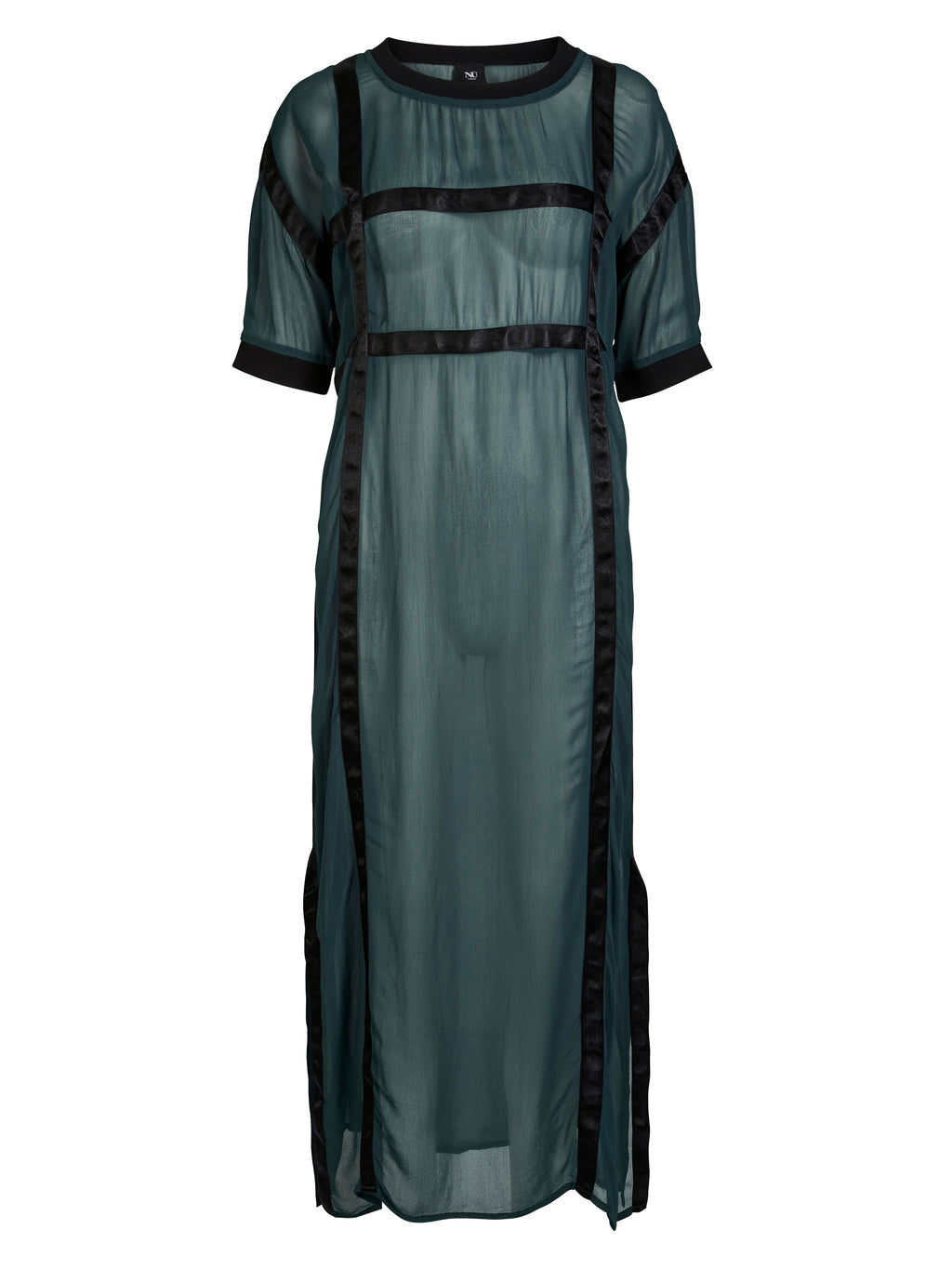 Dieses Kleid sticht mit seinem modernen und grafischen Ausdruck hervor. Es ist aus einem leichten transparenten Material gefertigt und verfügt über kurze Ärmel und einen runden Halsausschnitt. Die schwarzen Bänder entlang des Körpers und der Ärmel erzeugen einen strukturierten Kontrast und verleihen dem Kleid ein kantiges und raffiniertes Aussehen.