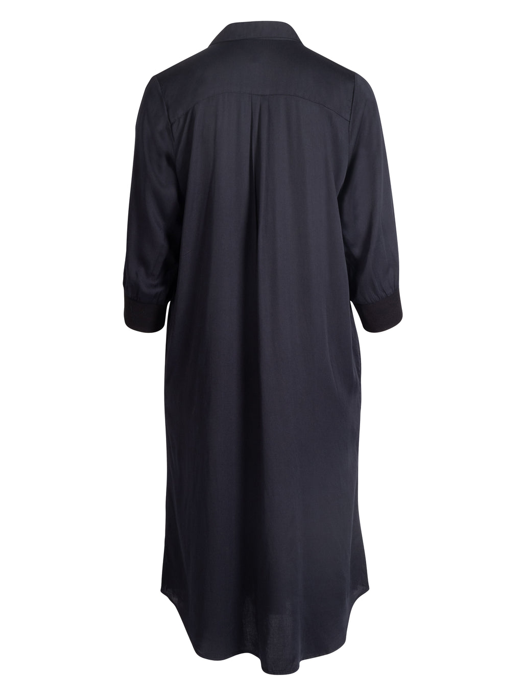 Dieses Kleid vereint Einfachheit und feine Details auf elegante Weise. Es hat eine gerade, lockere Passform mit Knöpfen entlang der gesamten Vorderseite, und die 3/4-Ärmel sind mit breiten Manschetten versehen. Das Oberteil ist mit Ton-in-Ton-Stickereien und kleinen Perlen verziert, was dem Kleid einen raffinierten Ausdruck verleiht. Der weiche Fall des Stoffes macht es bequem und einfach für verschiedene Anlässe zu stylen.