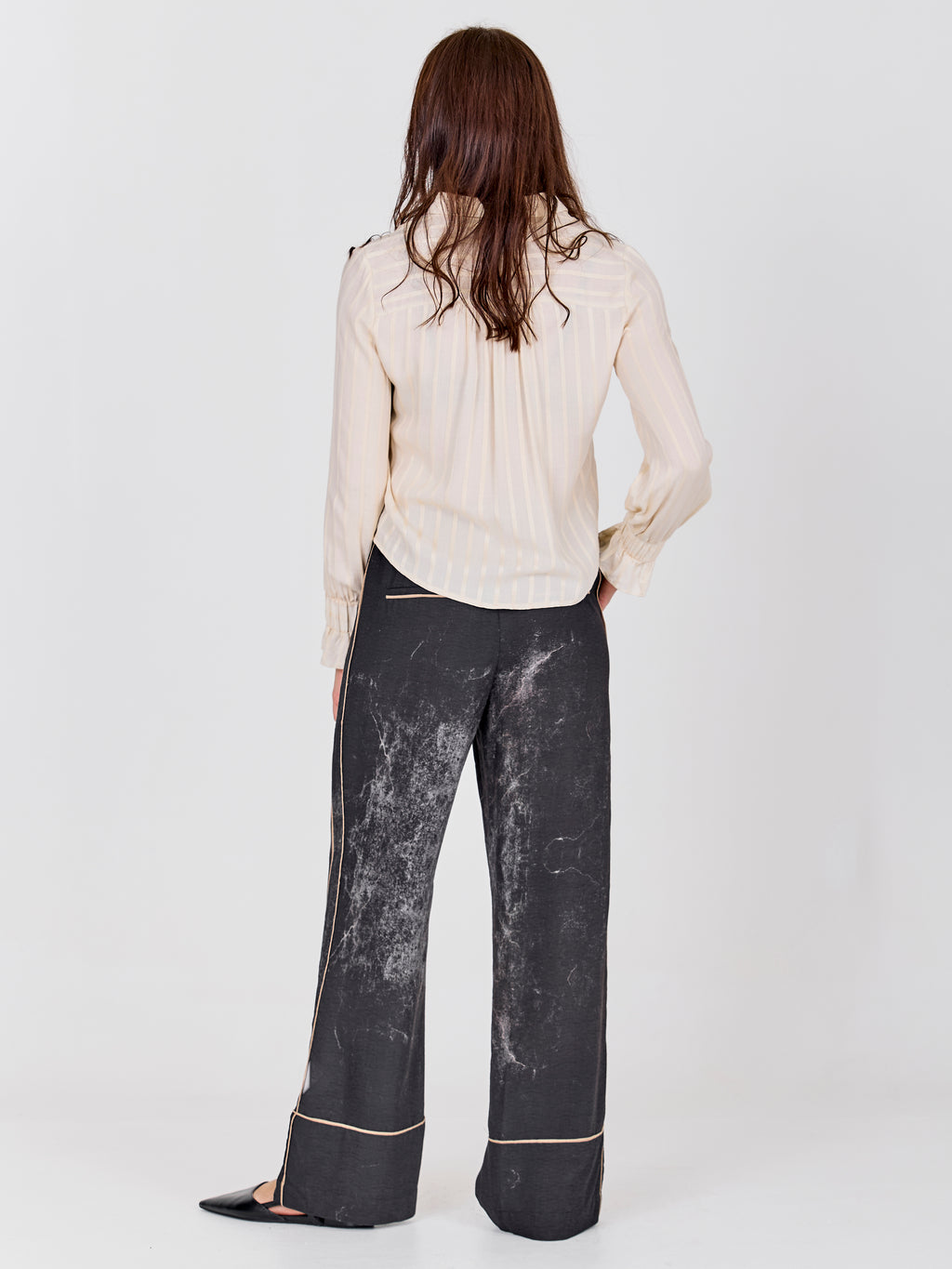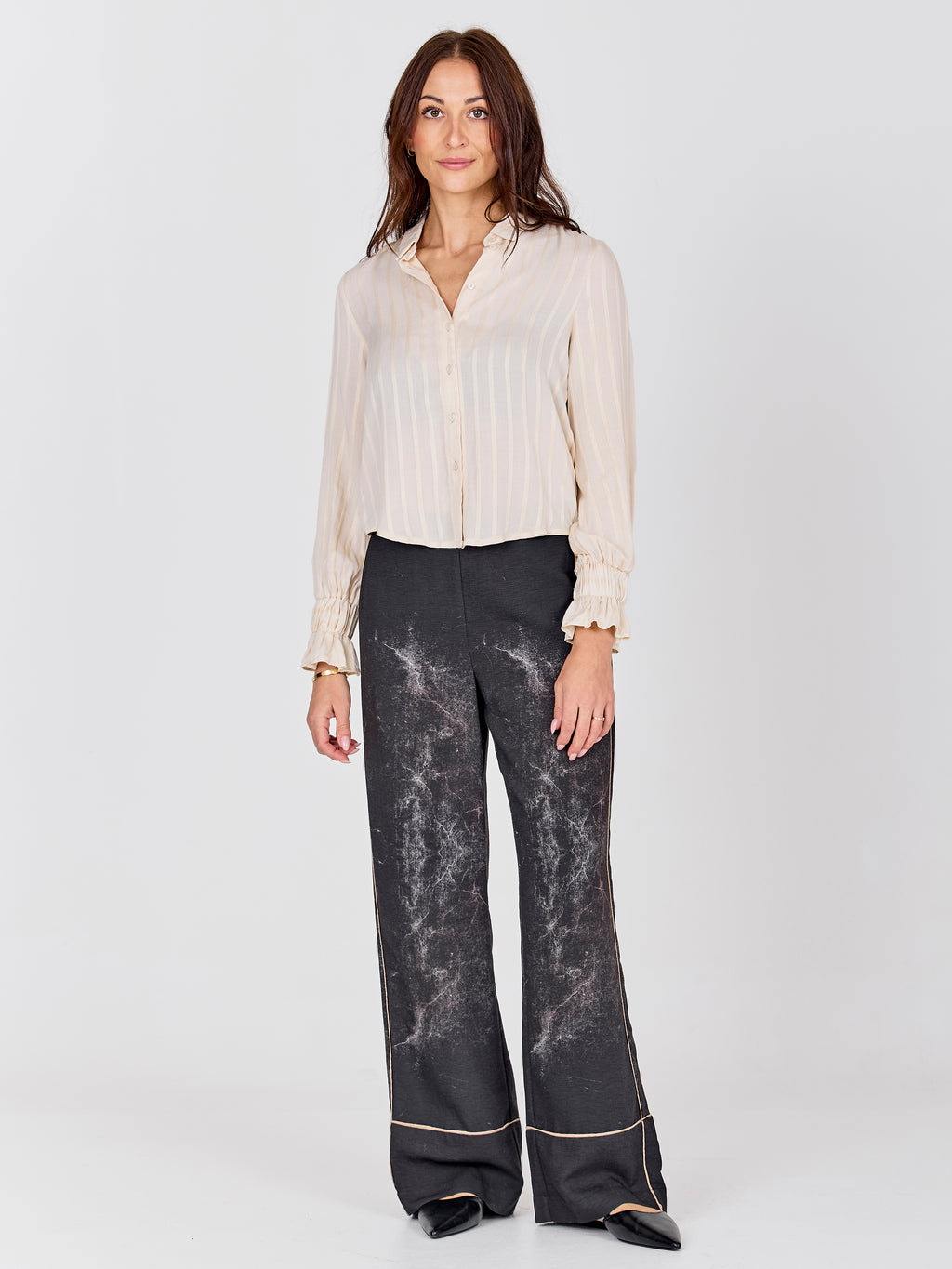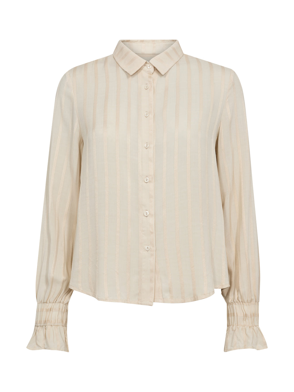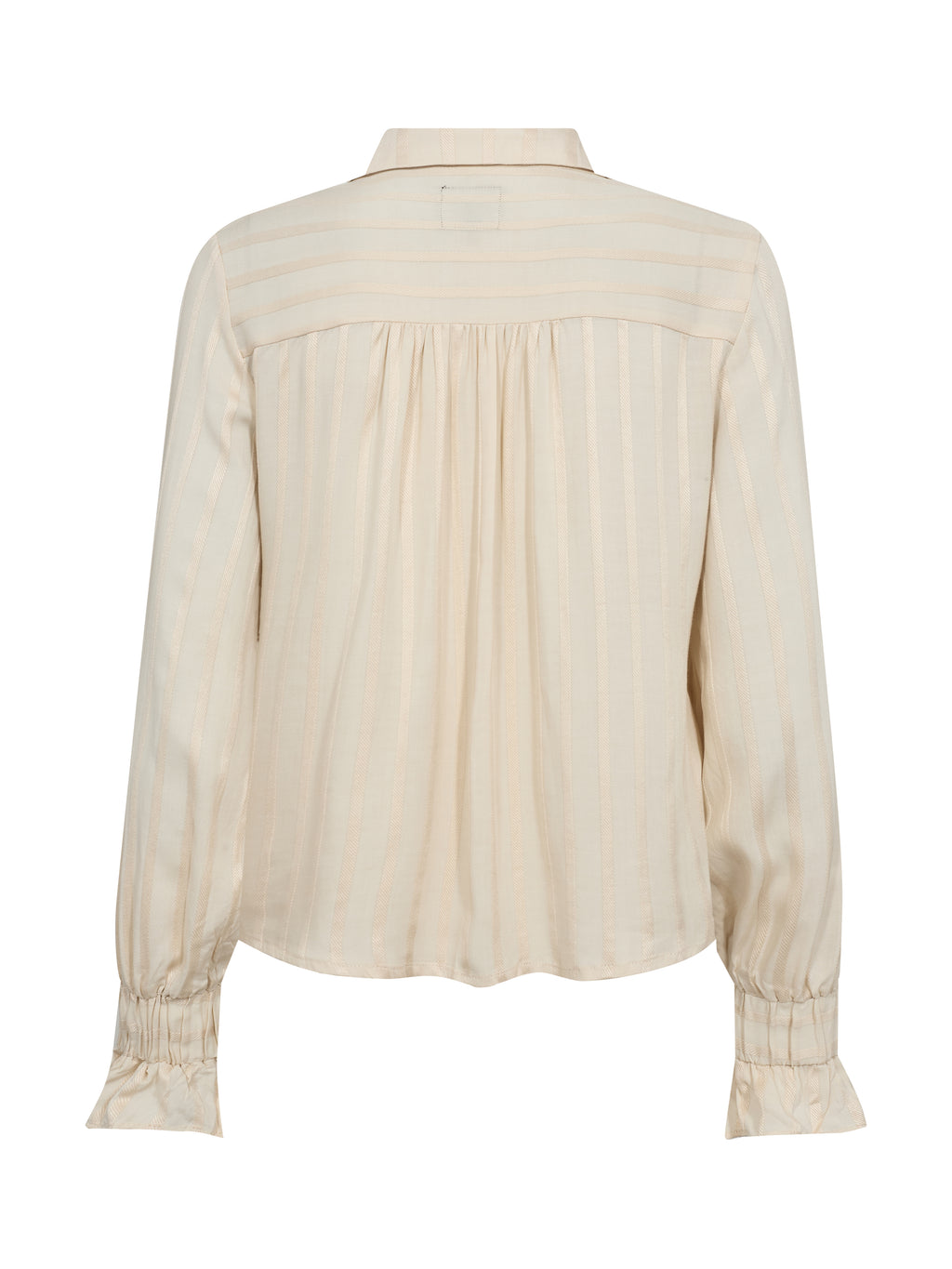 Dieses Hemd hat einen leichten und femininen Ausdruck mit einem klassischen Kragen und einer Knopfleiste vorne. Die dezenten Streifen verleihen dem Stoff Tiefe, während die langen Ärmel mit Gummizug an den Manschetten für eine weiche und bequeme Passform sorgen. Das Design vorne ist schlicht, und hinten fällt das Hemd sanft entlang des Rückens. Es lässt sich sowohl geschlossen als auch leicht geöffnet stylen - ideal für den Alltag und festliche Anlässe.