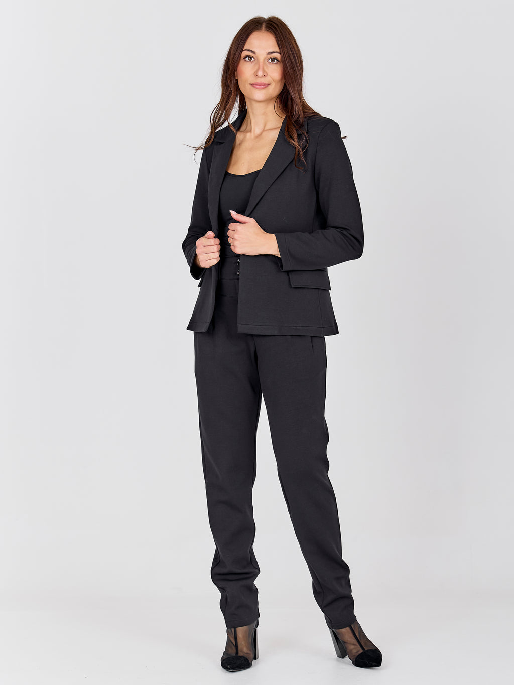 Dieser Blazer hat einen klassischen und schlichten Ausdruck mit einer leicht taillierten Passform, die schön am Körper fällt. Die Front ist klar gehalten mit Reverskragen und vorderer Verschluss, während die Rückseite einfach gehalten ist und einen ruhigen Gesamteindruck vermittelt. Die Passform ermöglicht es, ihn sowohl geschlossen als auch offen zu tragen, je nachdem, welchen Look Sie wünschen. Kombinieren Sie den Blazer mit der passenden Hose für ein komplettes Set oder tragen Sie ihn über ein Top und Jeans für einen entspannteren Alltagslook.