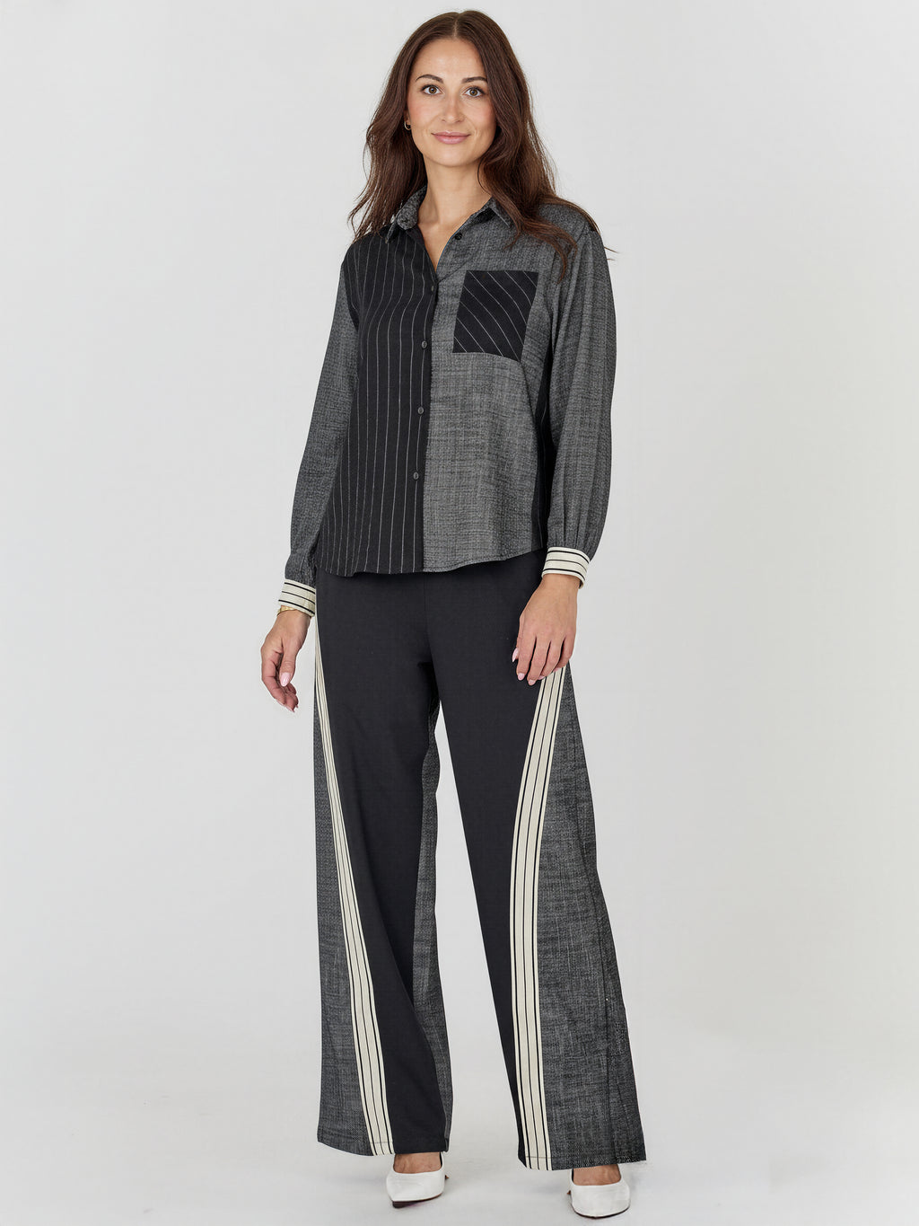 Dieses langärmlige Hemd hat einen modernen Ausdruck mit feinen, abwechslungsreichen Streifen, die ihm einen einzigartigen und coolen Look verleihen. Das Hemd hat eine klassische Knopfleiste und eine einfache Brusttasche, während die gestreiften Manschetten ein dezentes Detail hinzufügen. Es kann problemlos mit der passenden Hose für ein stimmiges Set gestylt oder mit Ihren eigenen Favoriten kombiniert werden.