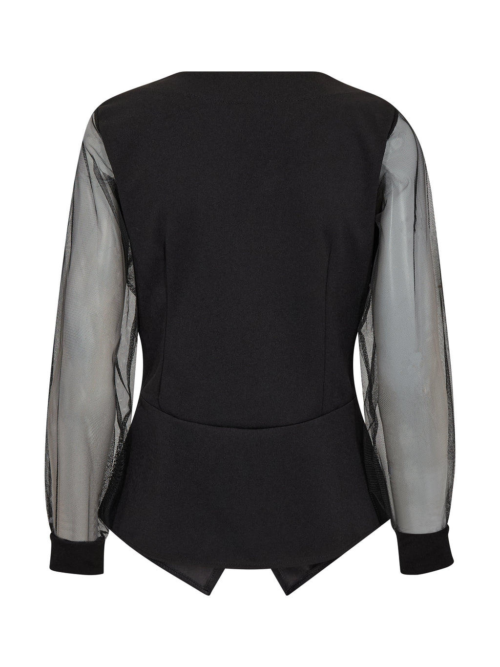 Die Bluse hat einen figurbetonten Schnitt mit schönen Falten vorne und einer betonten Taille, was eine elegante Silhouette ergibt. Der tiefe V-Ausschnitt und der asymmetrische Abschluss vorne verleihen einen modernen Touch, während die langen Mesh-Ärmel mit Manschetten einen leichten und subtilen Kontrast schaffen. Die Rückseite ist schlicht und folgt der Körperform.