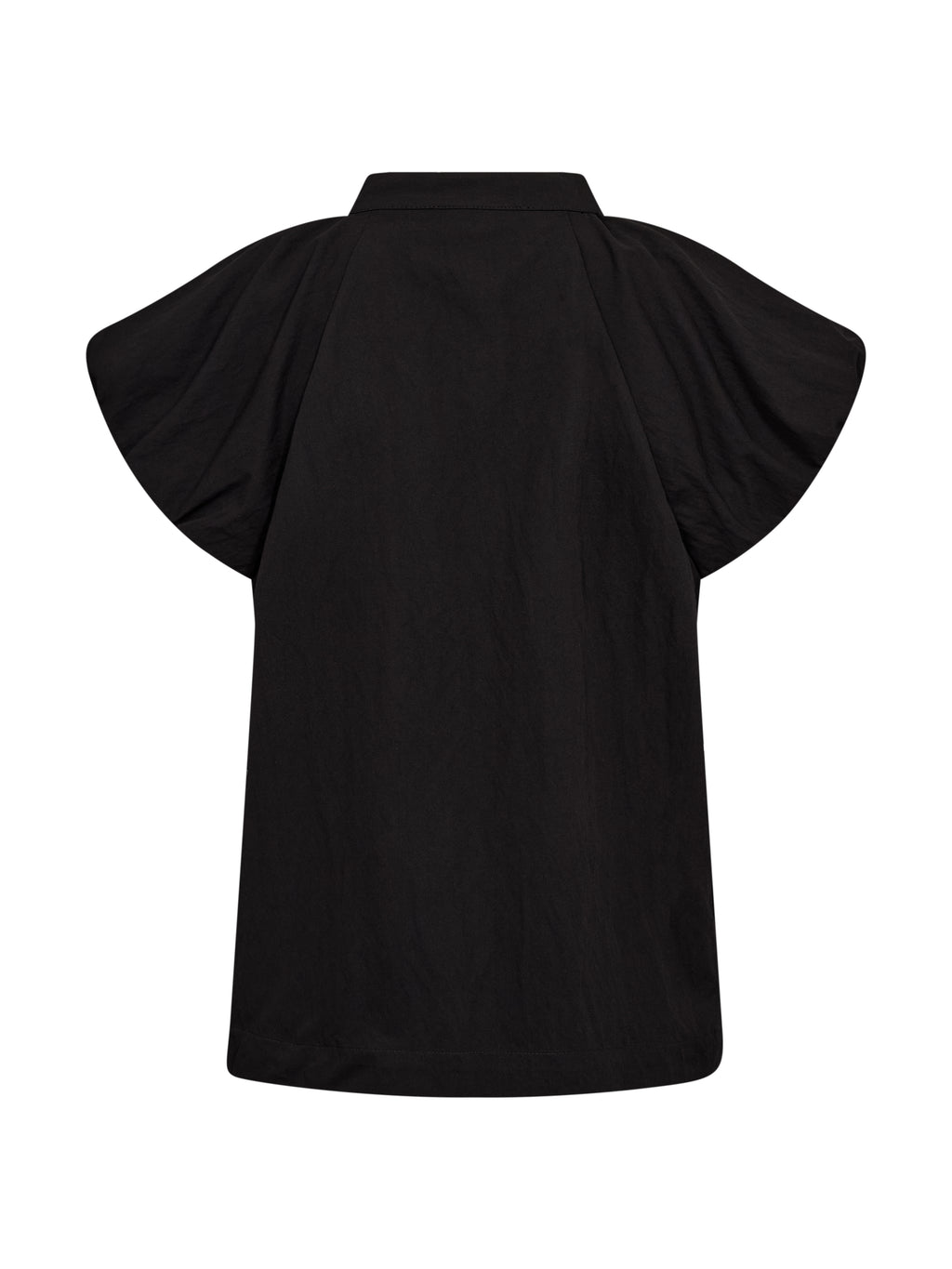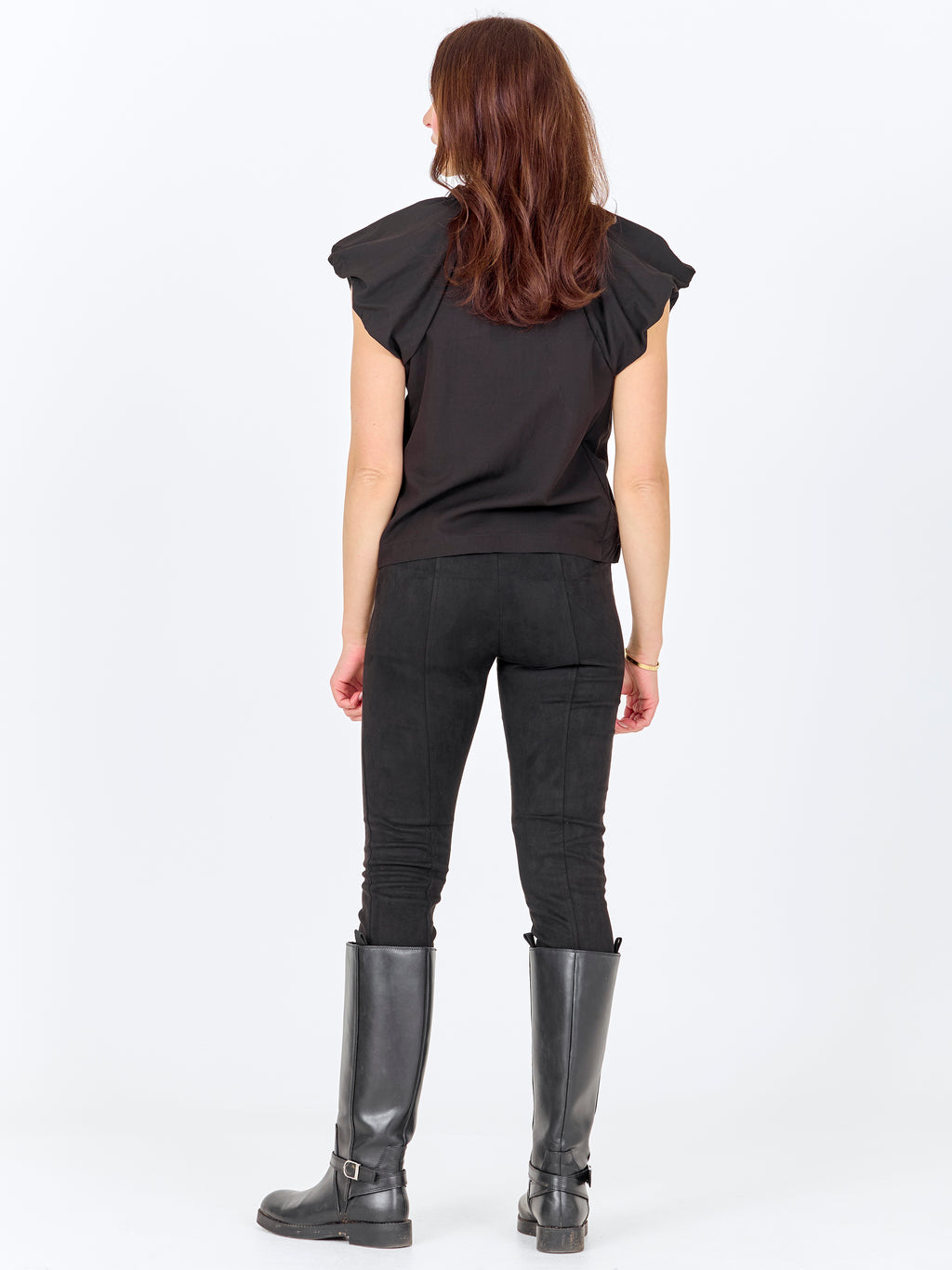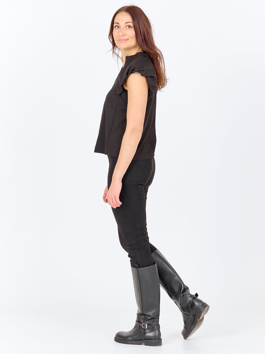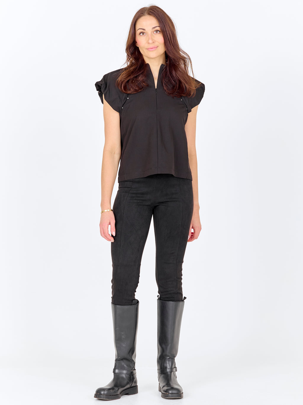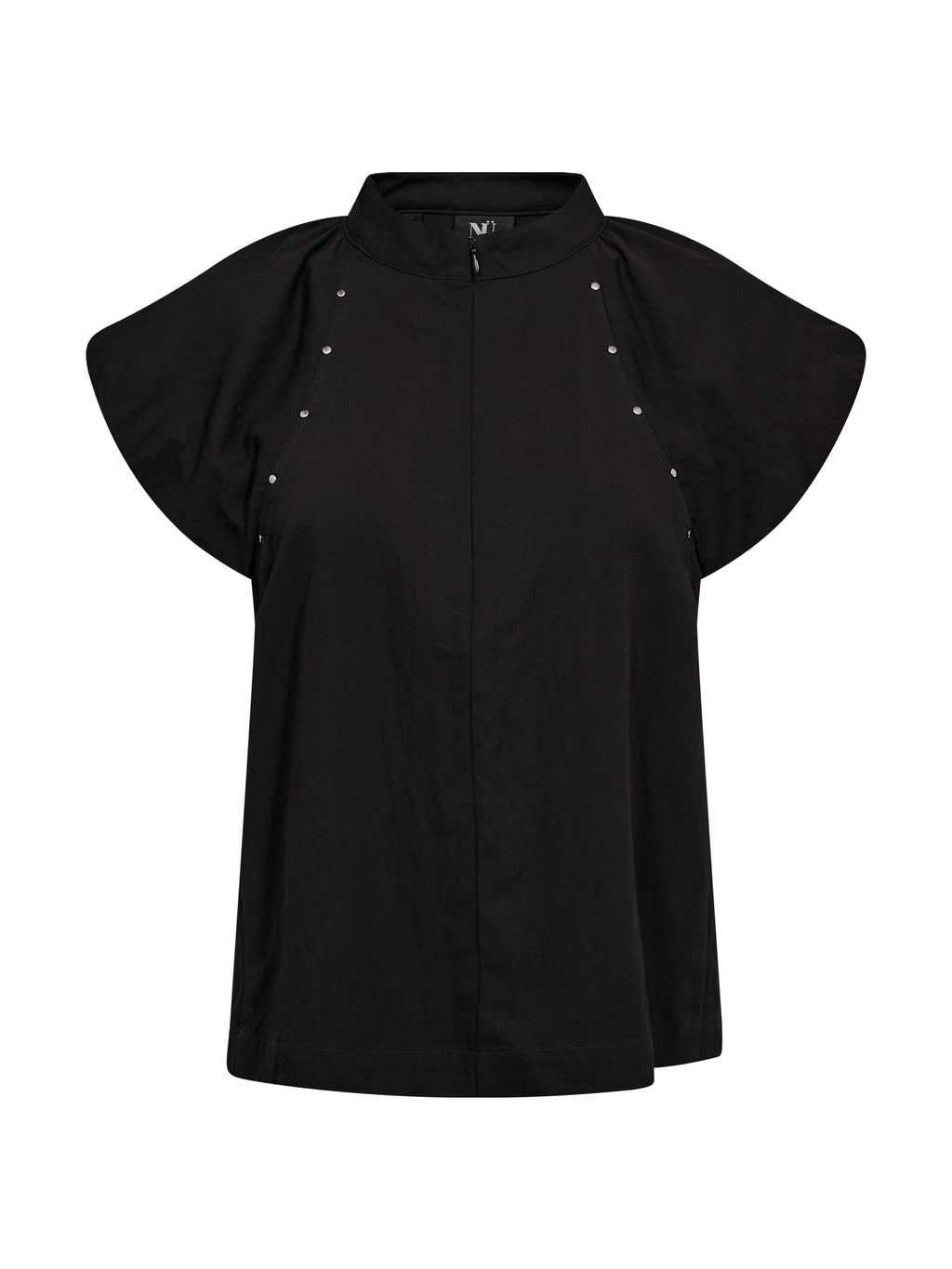 Dieses Top hat einen femininen Ausdruck mit einem weichen, hohen Kragen und kurzen Ärmeln mit einem leichten Flare, der einen schönen Fall über die Schultern verleiht. Die kleinen Nieten an den Ärmellöchern fügen ein dezentes Detail hinzu, das den schlichten Look durchbricht, ohne zu überladen. Die Vorderseite ist sauber und ruhig gestaltet, während die Rückseite locker und bequem fällt. Das Top lässt sich sowohl mit Hosen als auch Röcken leicht stylen und eignet sich sowohl für den Alltag als auch für formellere Anlässe.