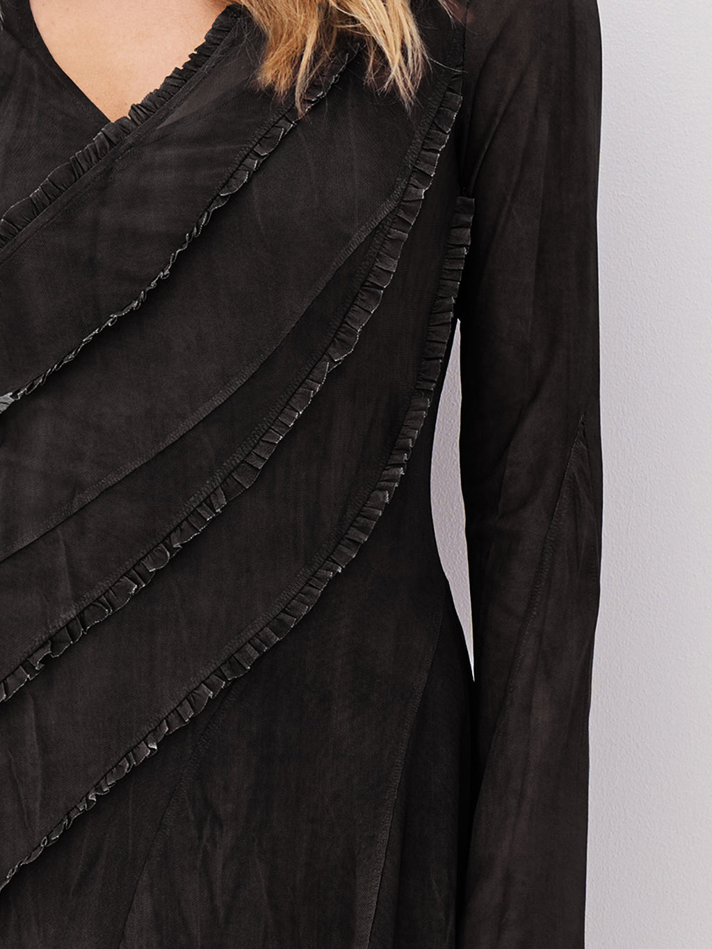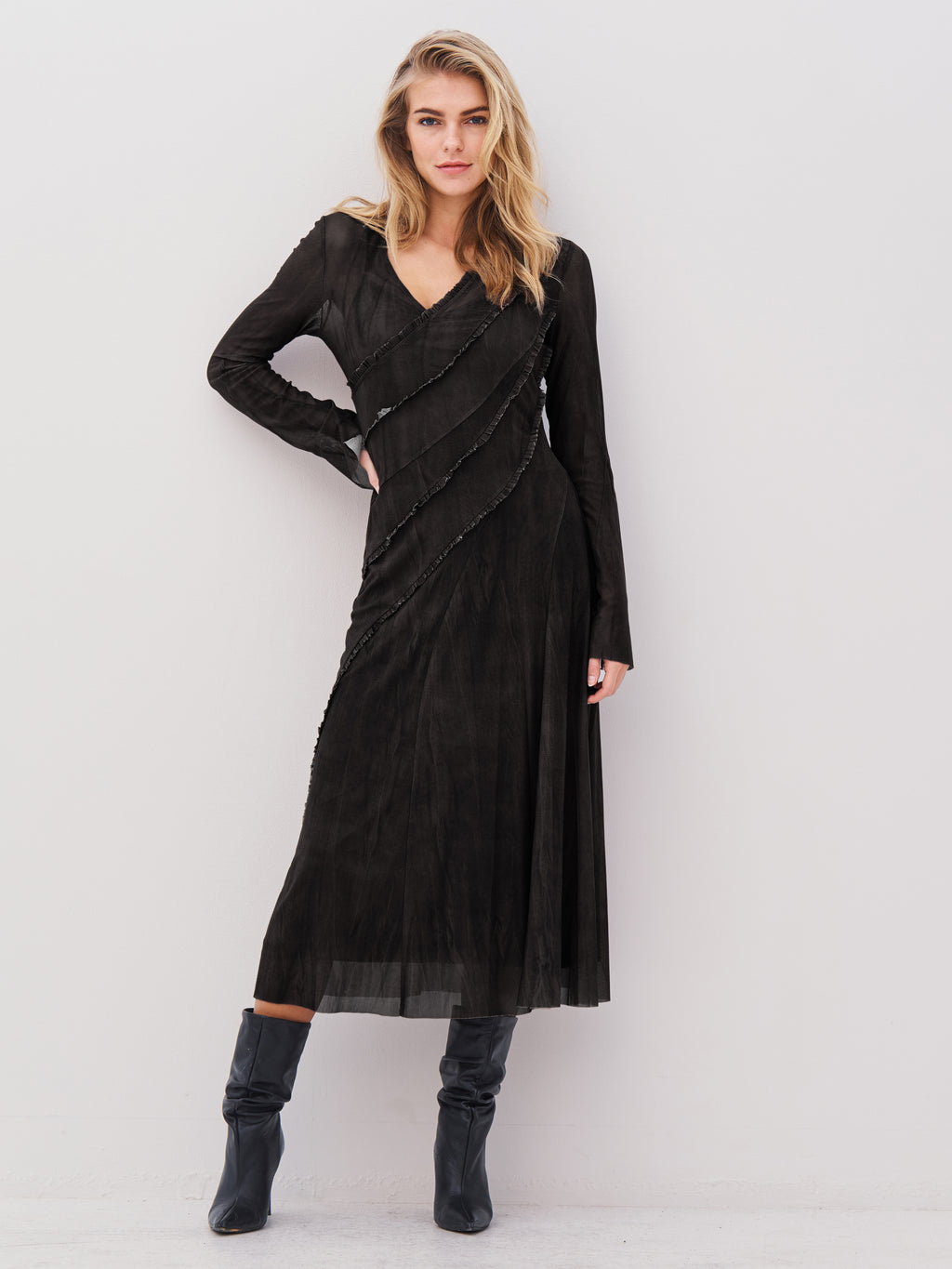 Dieses Kleid hat einen eleganten und luftigen Ausdruck mit transparenten Ärmeln und dekorativen, diagonalen Nähten mit kleinen gekräuselten Details. Die leicht transparente äußere Schicht fällt wunderschön um den Körper und erzeugt eine schöne Bewegung im Rock. Das V-Ausschnitt und die langen Ärmel des Kleides machen es sowohl für Abendgarderobe als auch für besondere Anlässe geeignet.