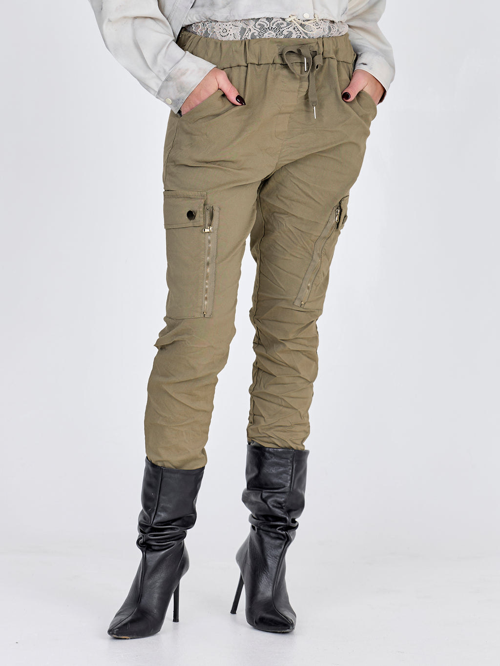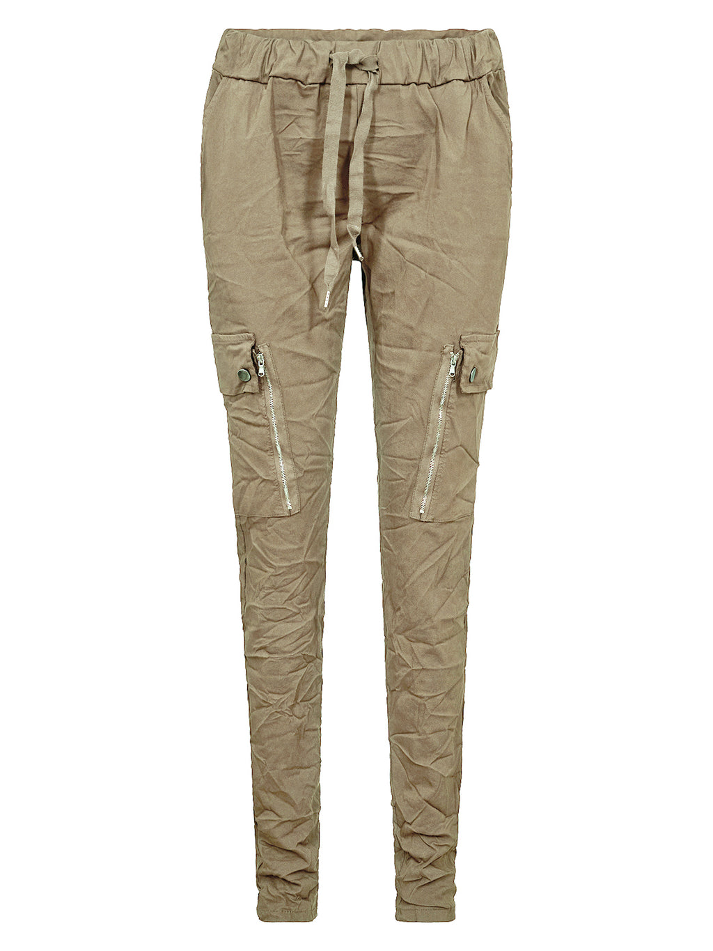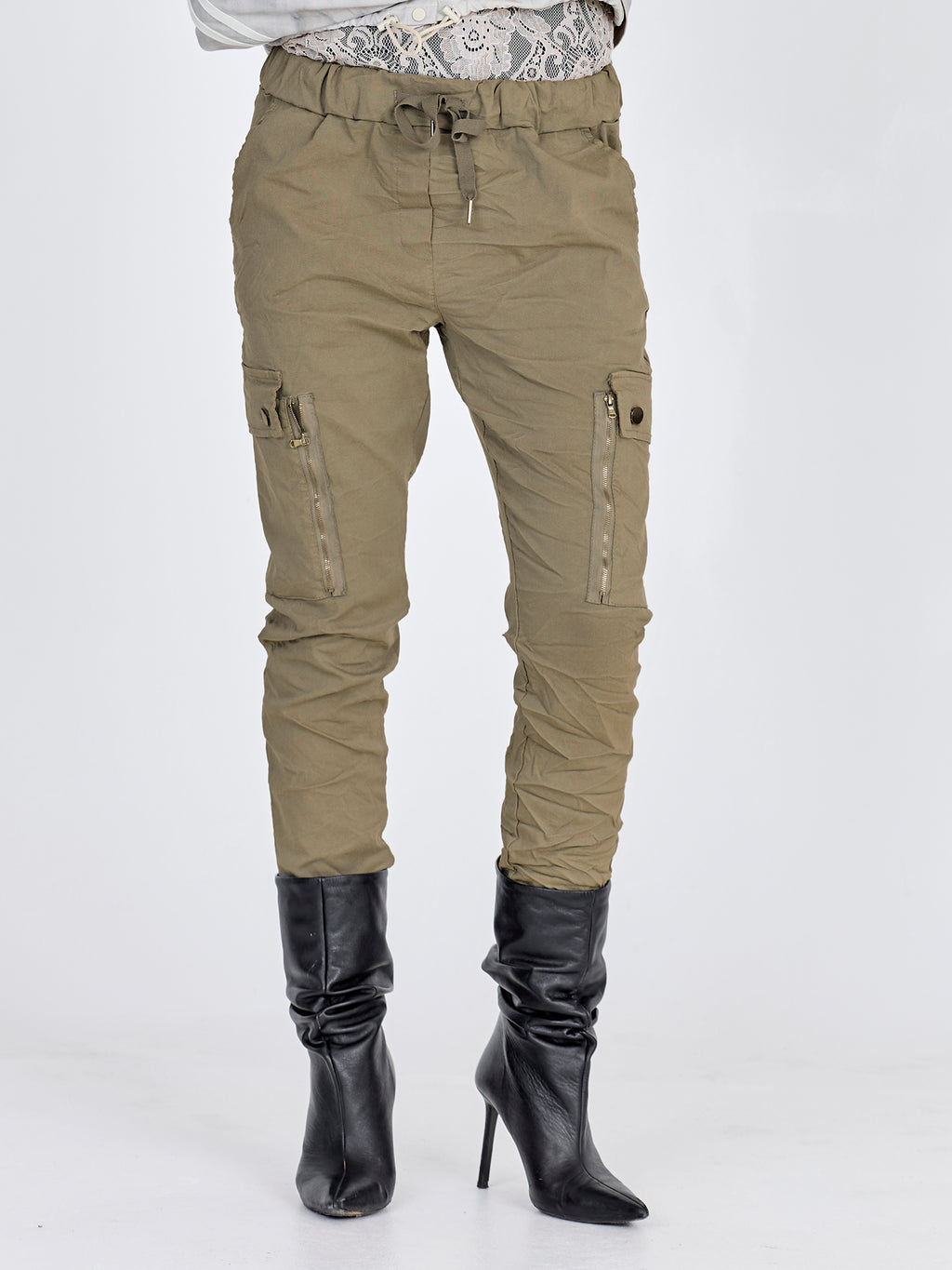 Diese coolen Hosen bestehen aus einer wunderbaren Baumwollqualität mit viel Stretch. Die Hosen haben eine leicht lockere Passform und einen elastischen Bund mit einem Gürtel zum Binden, der für fantastischen Komfort sorgt. In der Mitte der Hosen befinden sich zwei große knöpfbare Taschen und ein langer dekorativer Reißverschluss, der ein raffiniertes Detail hinzufügt.