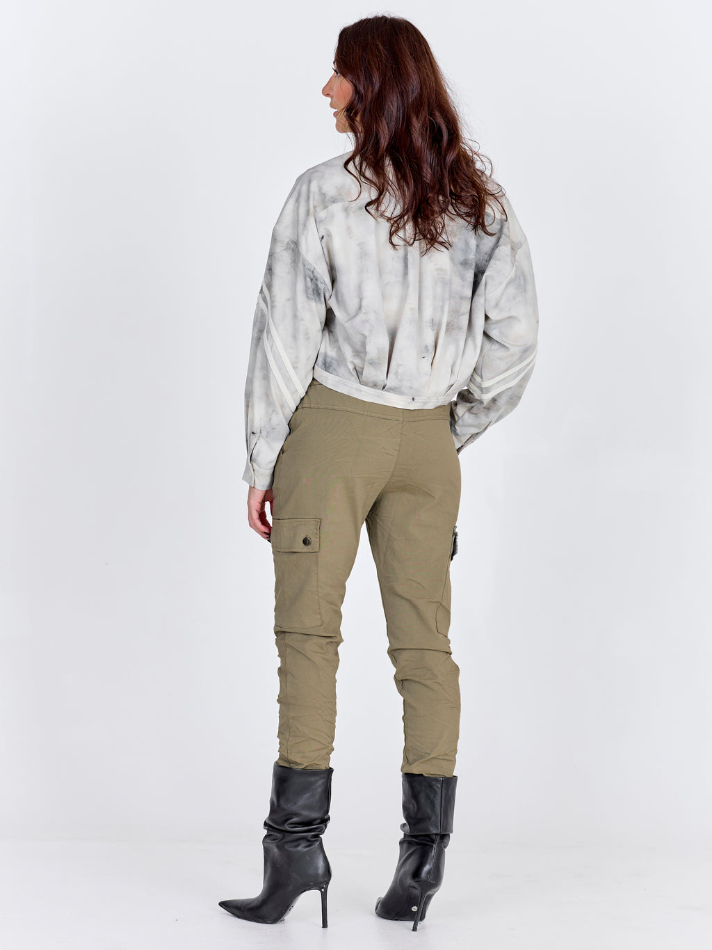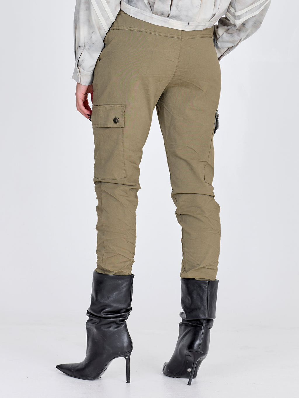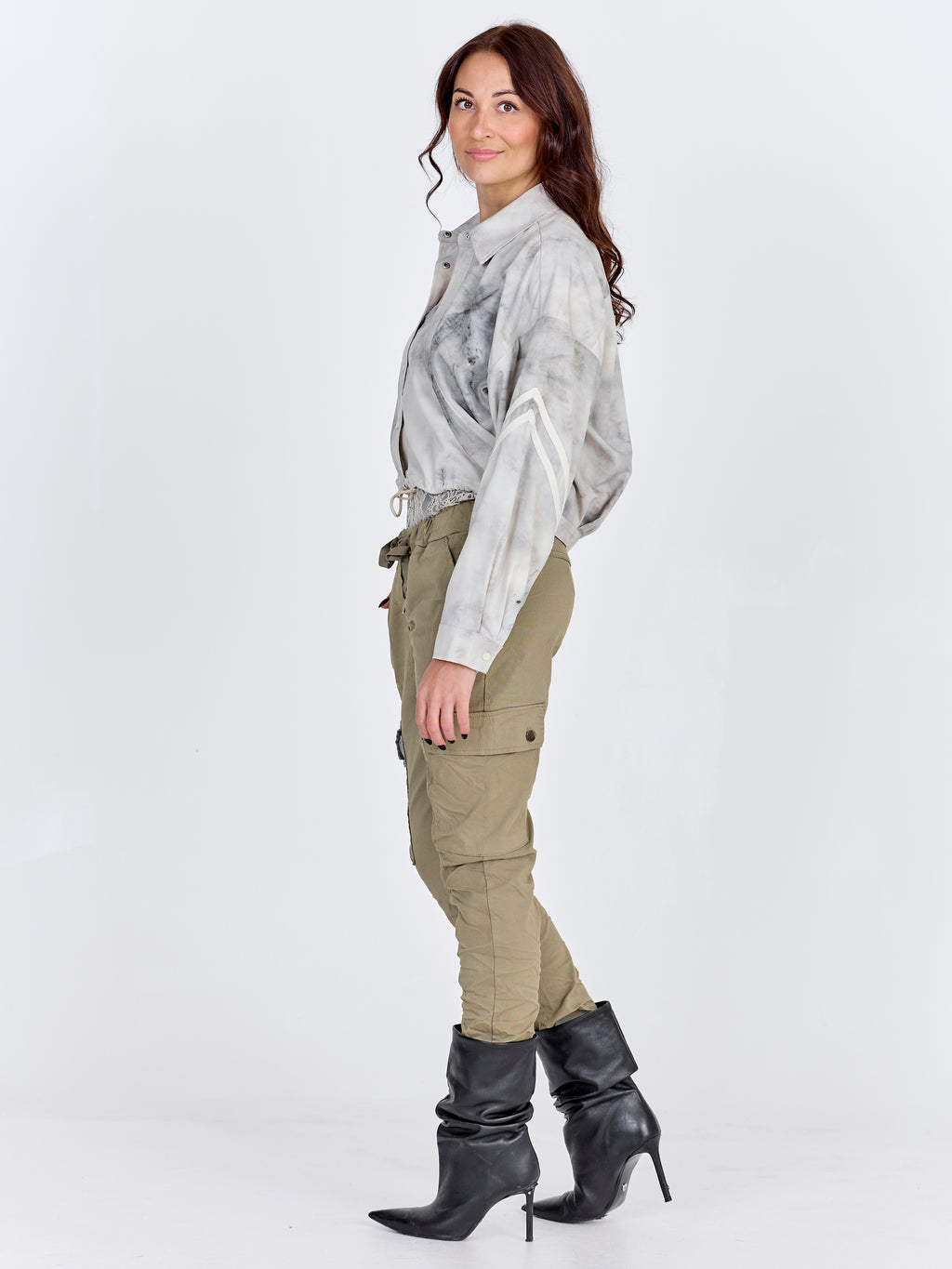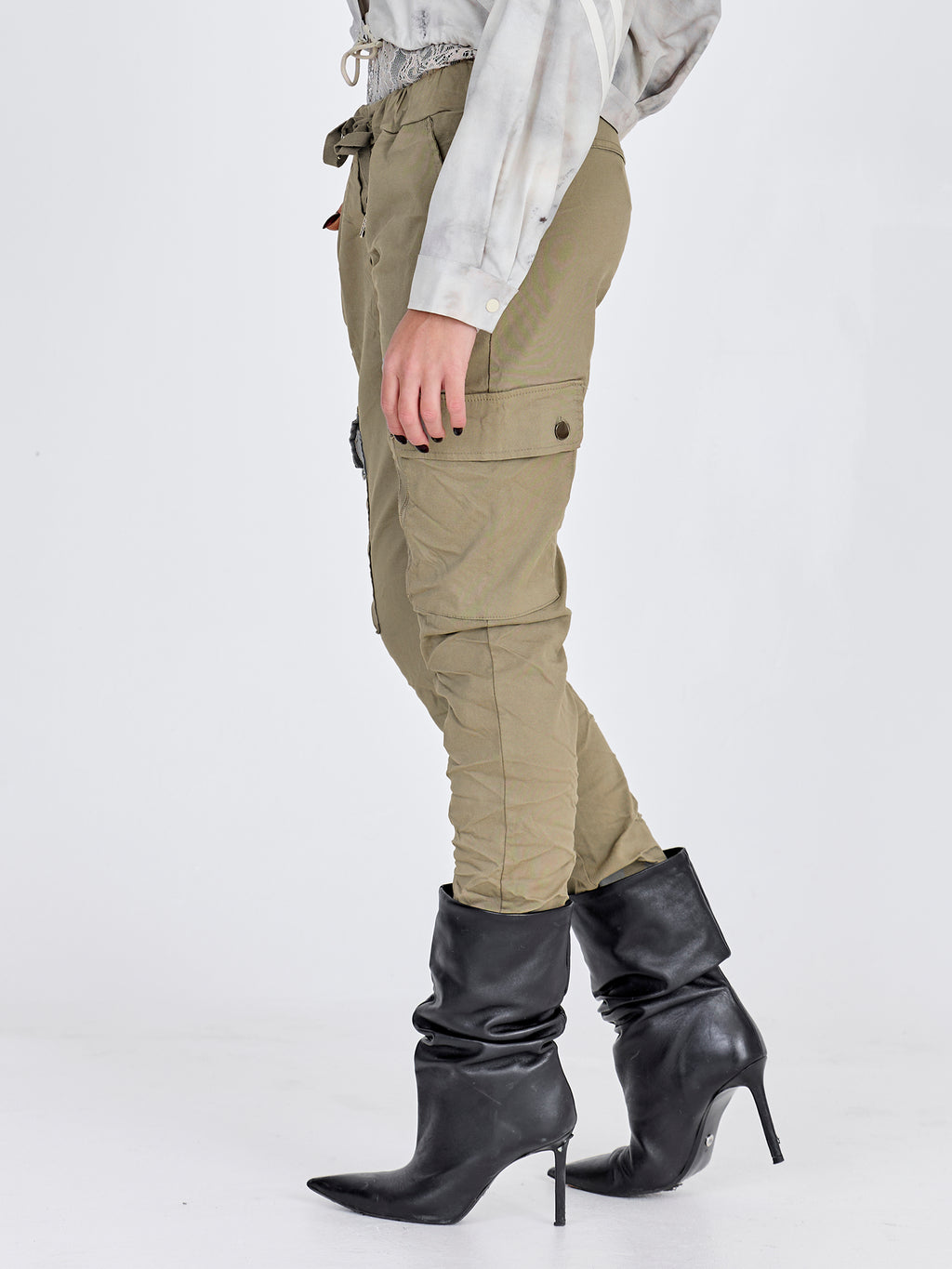 Diese coolen Hosen bestehen aus einer wunderbaren Baumwollqualität mit viel Stretch. Die Hosen haben eine leicht lockere Passform und einen elastischen Bund mit einem Gürtel zum Binden, der für fantastischen Komfort sorgt. In der Mitte der Hosen befinden sich zwei große knöpfbare Taschen und ein langer dekorativer Reißverschluss, der ein raffiniertes Detail hinzufügt.