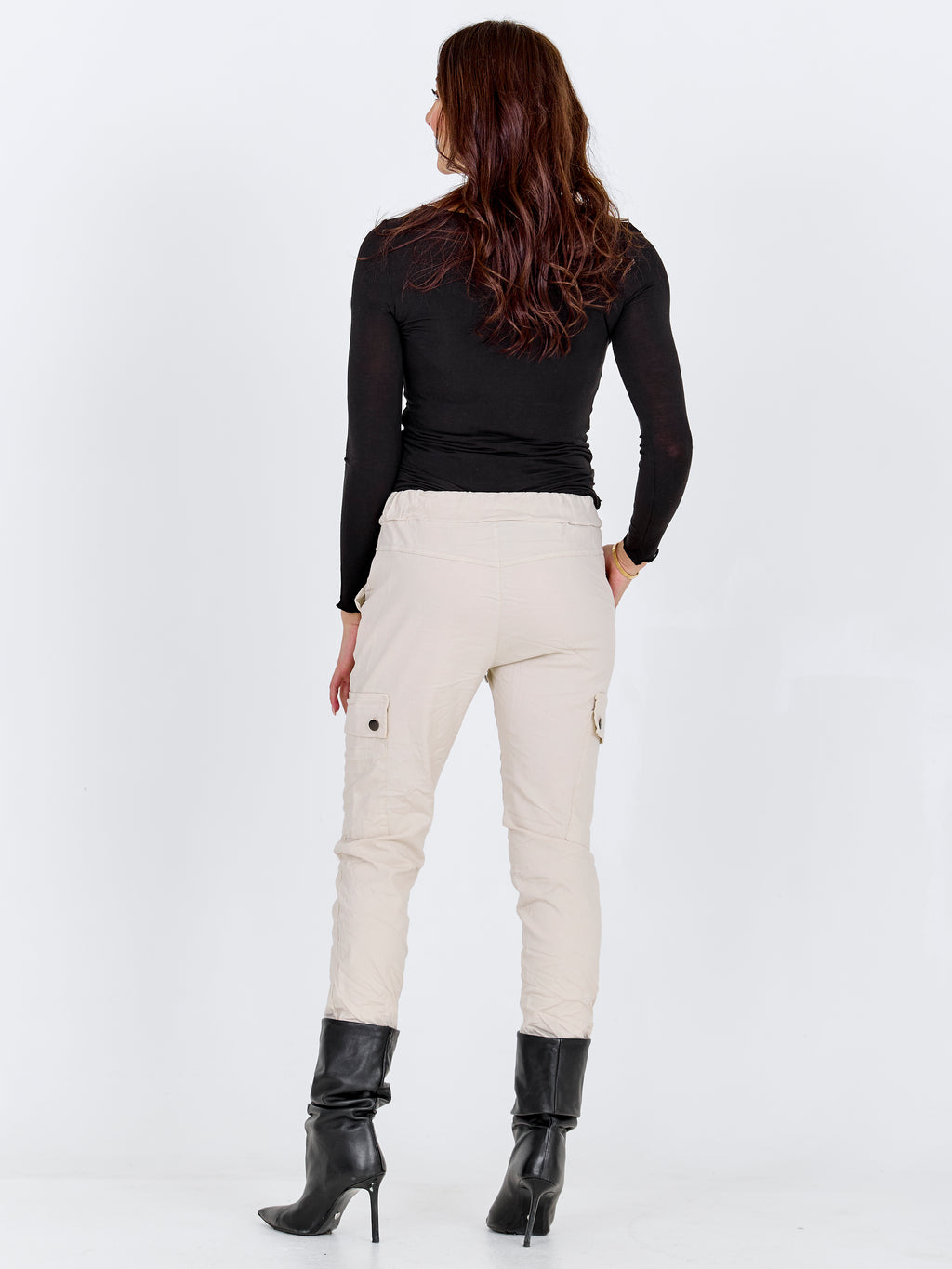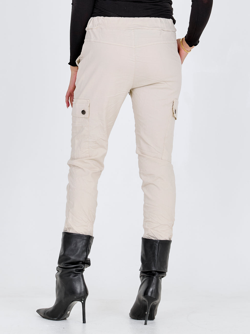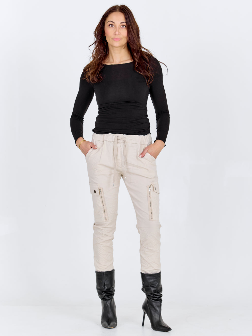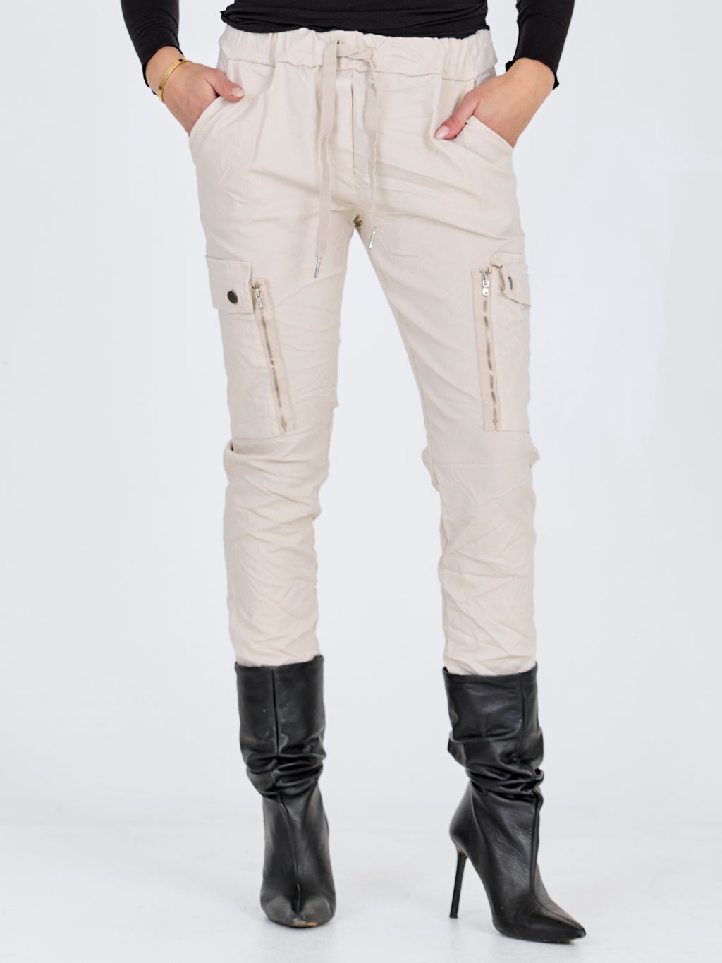 Diese coolen Hosen bestehen aus einer wunderbaren Baumwollqualität mit viel Stretch. Die Hosen haben eine leicht lockere Passform und einen elastischen Bund mit einem Gürtel zum Binden, der für fantastischen Komfort sorgt. In der Mitte der Hosen befinden sich zwei große knöpfbare Taschen und ein langer dekorativer Reißverschluss, der ein raffiniertes Detail hinzufügt.