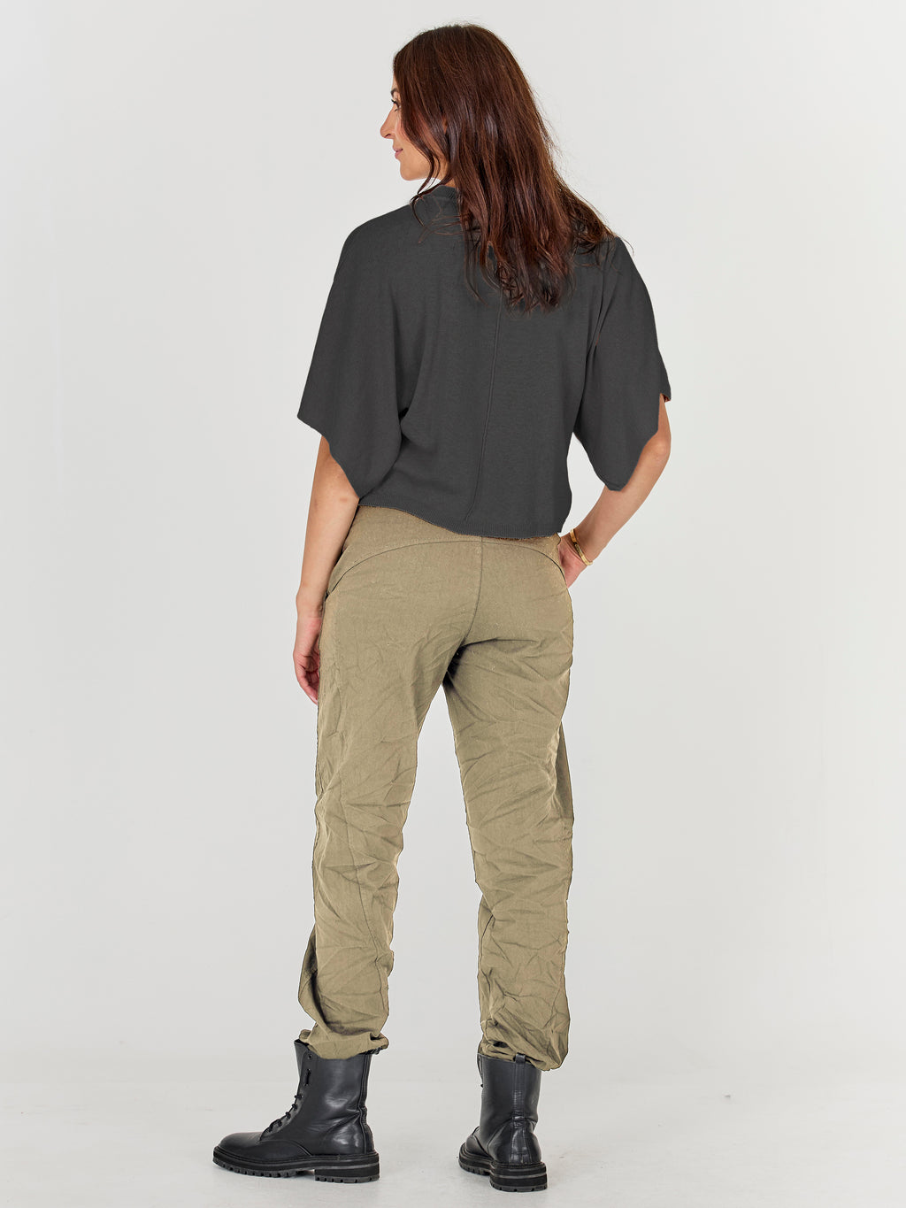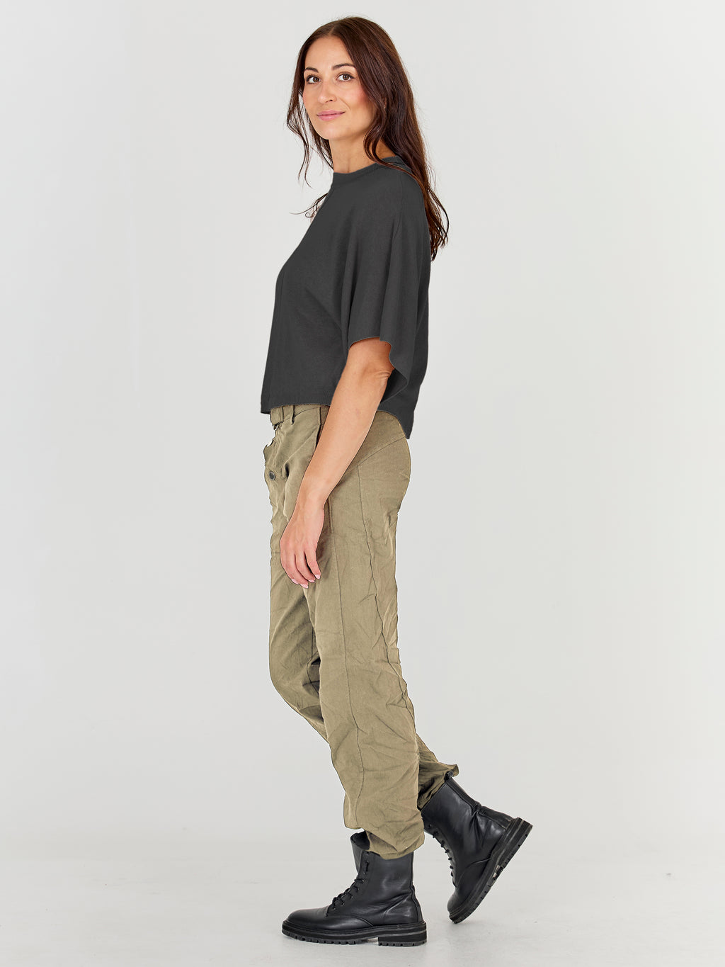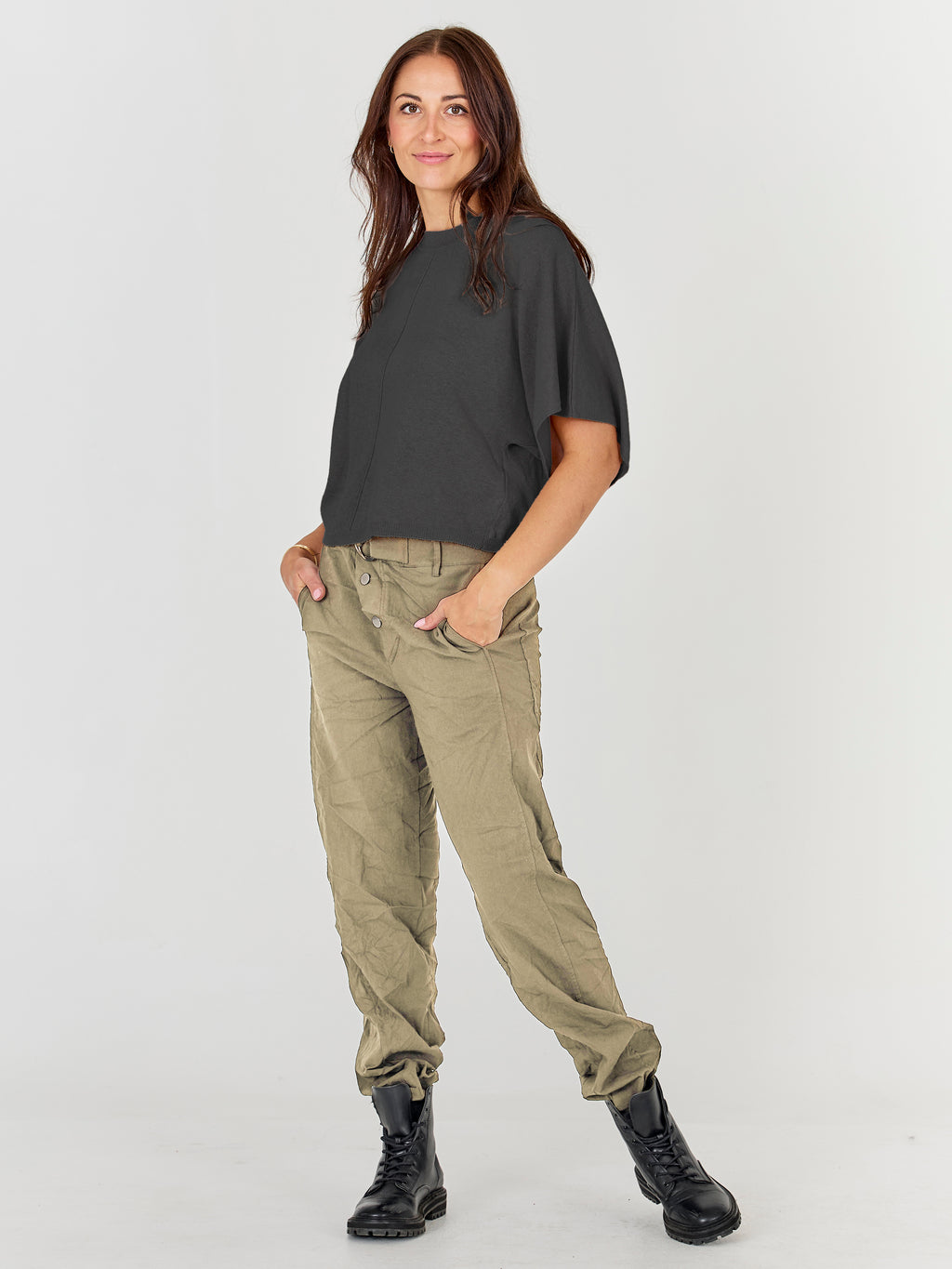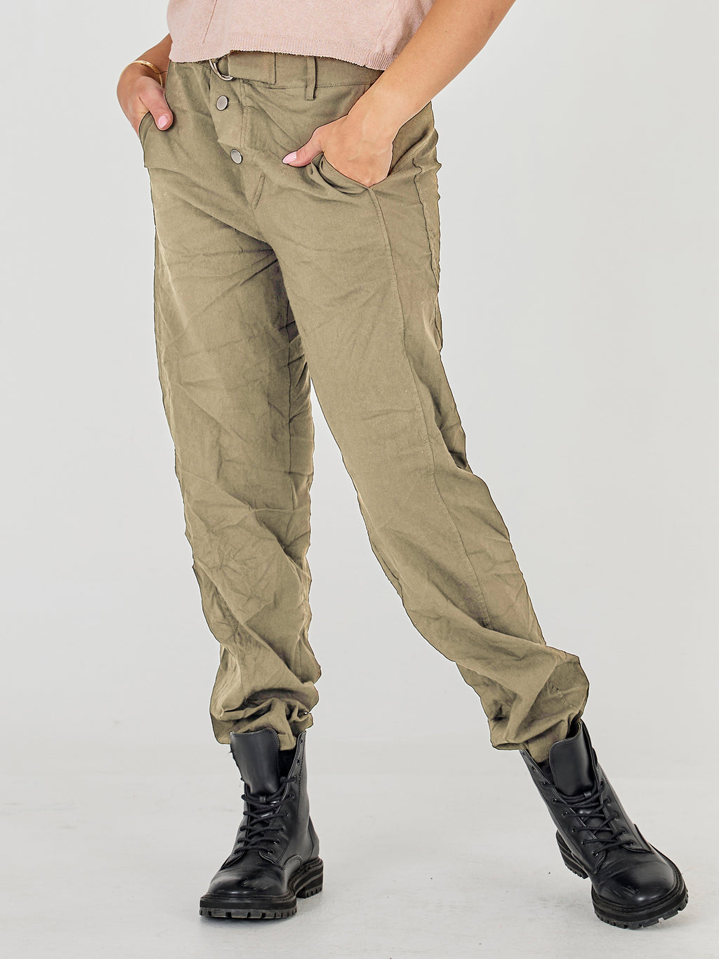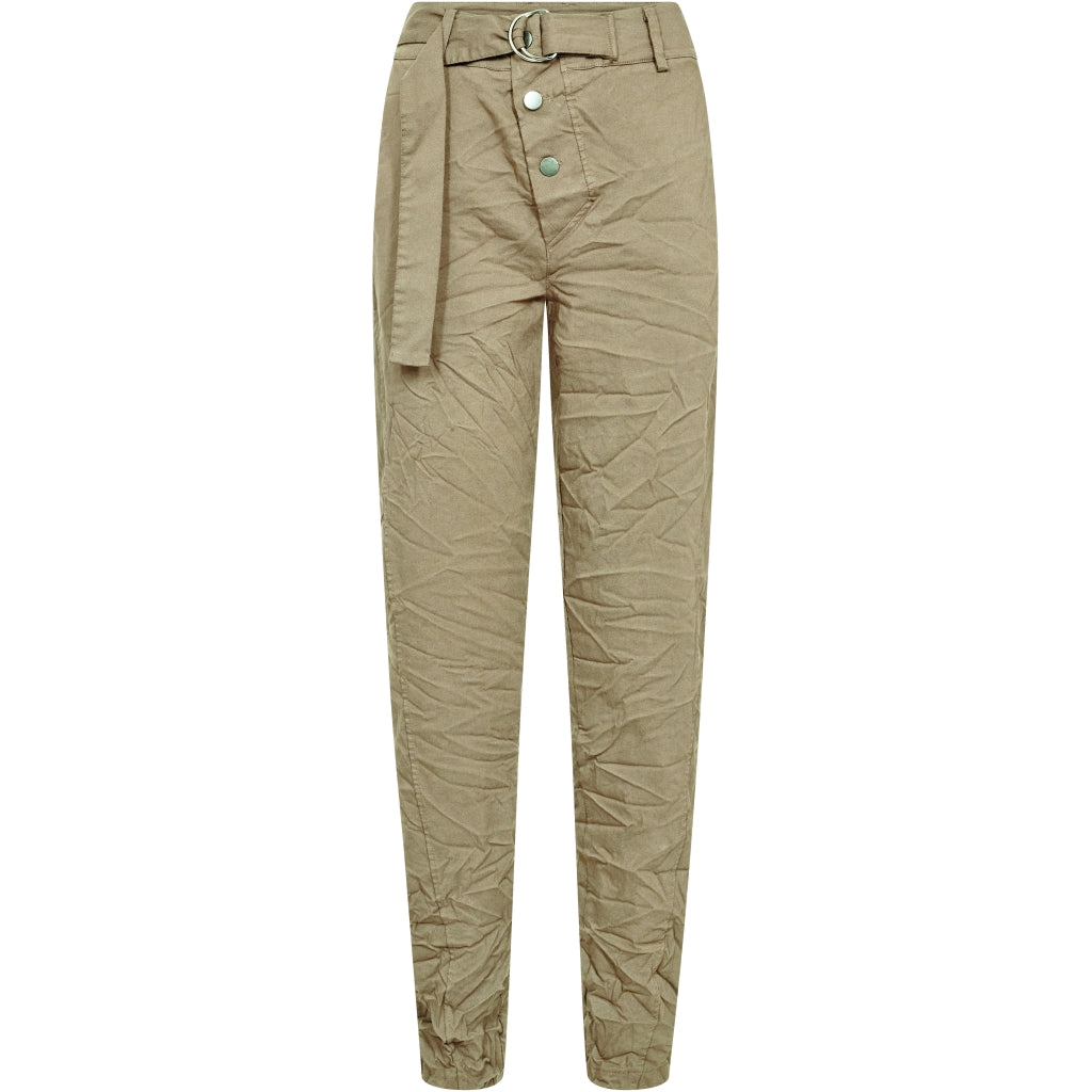 Diese Hose ist mit einem schmalen Bein und einem markanten Bund gestaltet, was einen einfachen und zeitlosen Look verleiht. Vorne haben sie einen schrägen Knopfverschluss und einen Gürtel mit Metallring, der ein sauberes und stilvolles Detailspiel hinzufügt. Hinten ist der Schnitt sauber mit Gürtelschlaufen und Markierungen, die die Passform betonen. Kombinieren Sie sie mit einem leichten Strick oder einem Hemd für einen lässigen, aber durchdachten Look für den Alltag.
