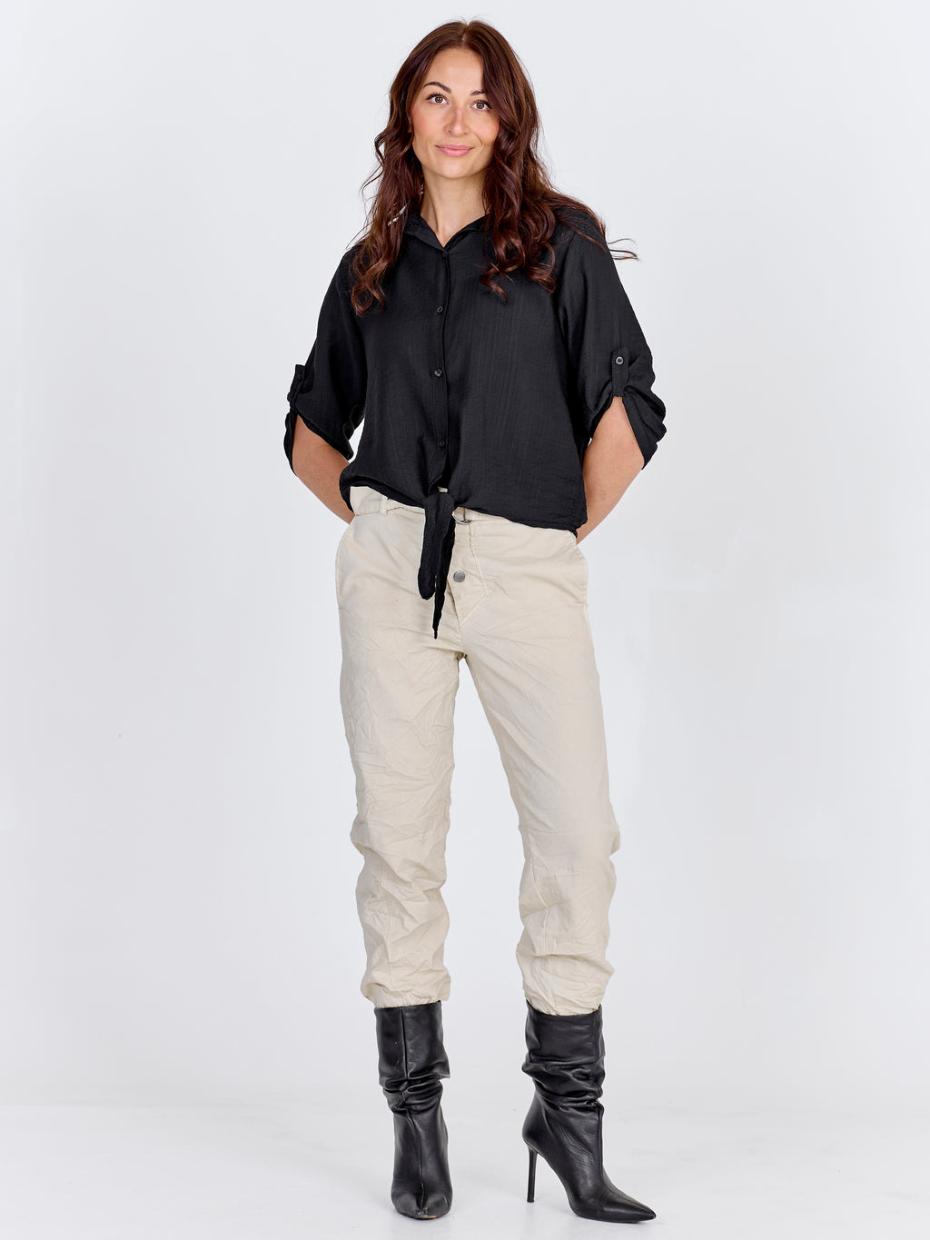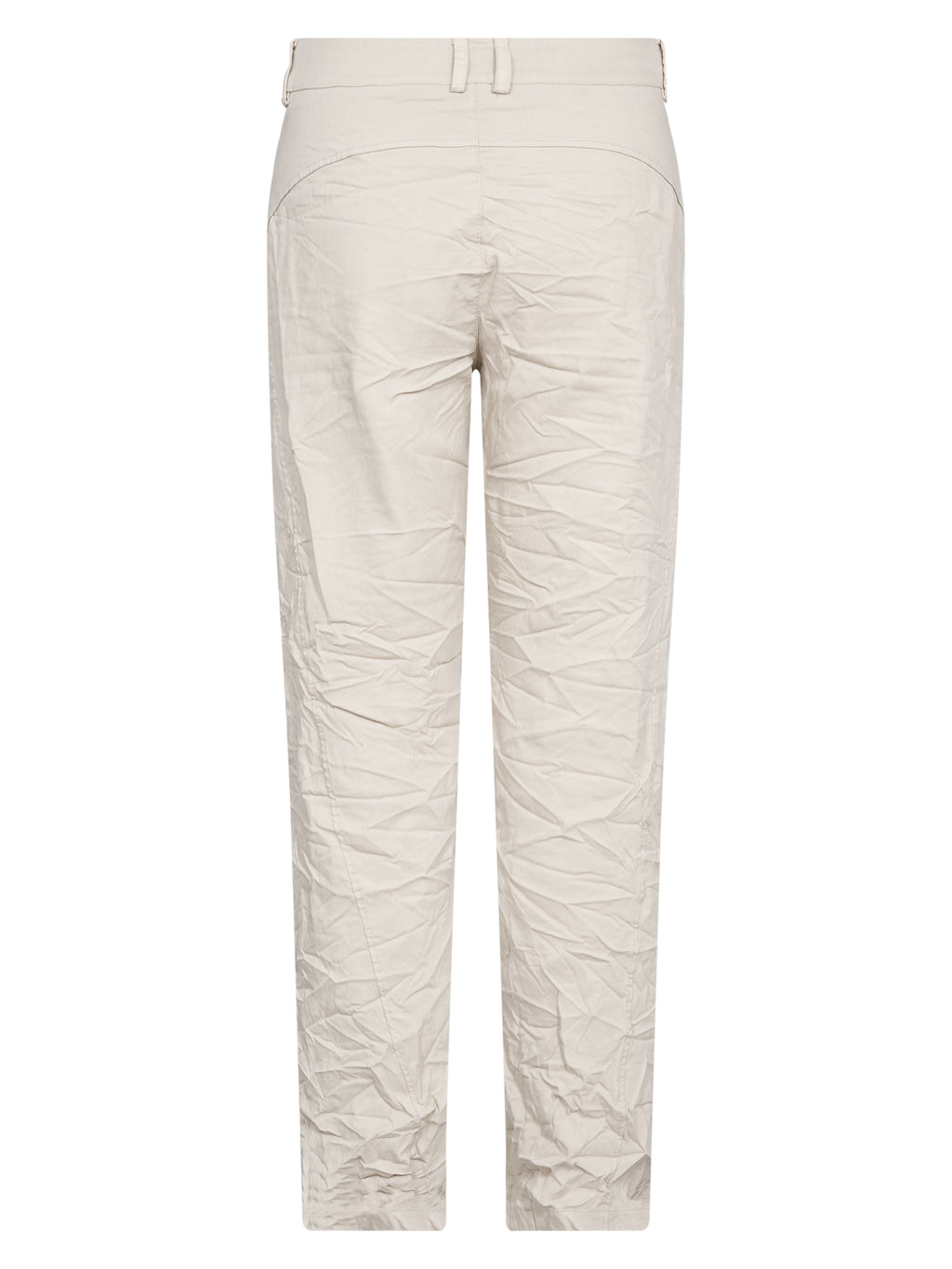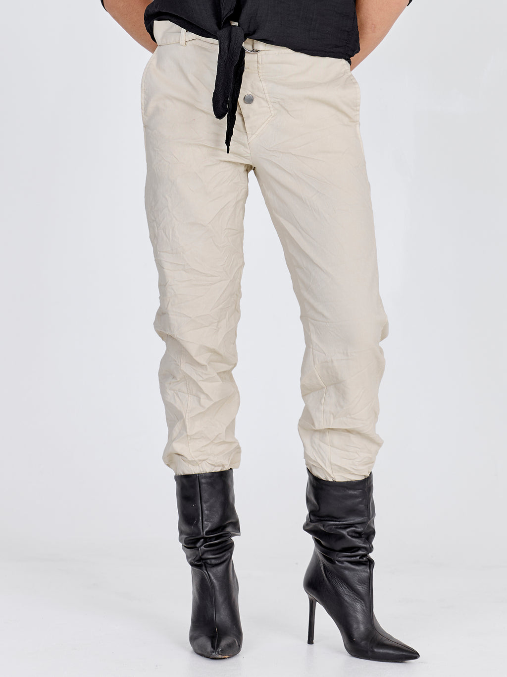 Diese Hose ist mit einem schmalen Bein und einem markanten Bund gestaltet, was einen einfachen und zeitlosen Look verleiht. Vorne haben sie einen schrägen Knopfverschluss und einen Gürtel mit Metallring, der ein sauberes und stilvolles Detailspiel hinzufügt. Hinten ist der Schnitt sauber mit Gürtelschlaufen und Markierungen, die die Passform betonen. Kombinieren Sie sie mit einem leichten Strick oder einem Hemd für einen lässigen, aber durchdachten Look für den Alltag.