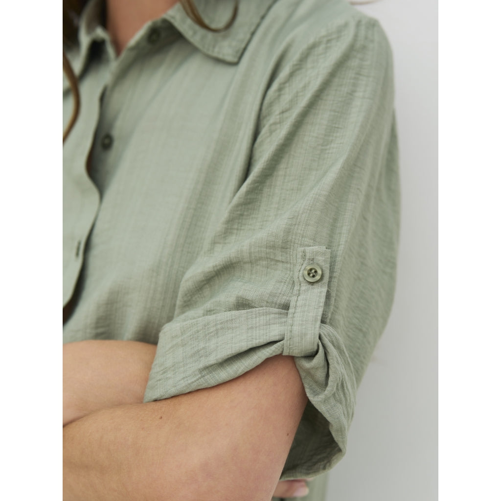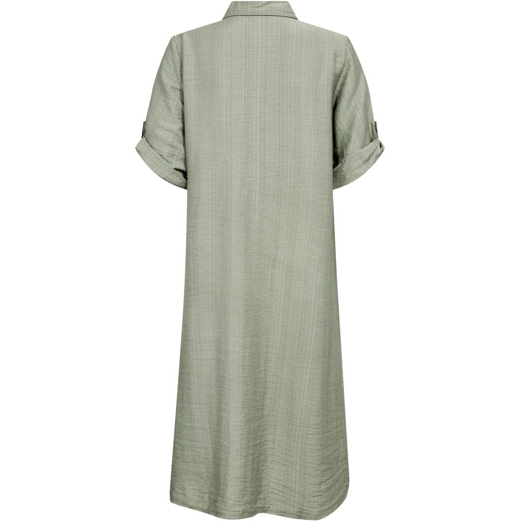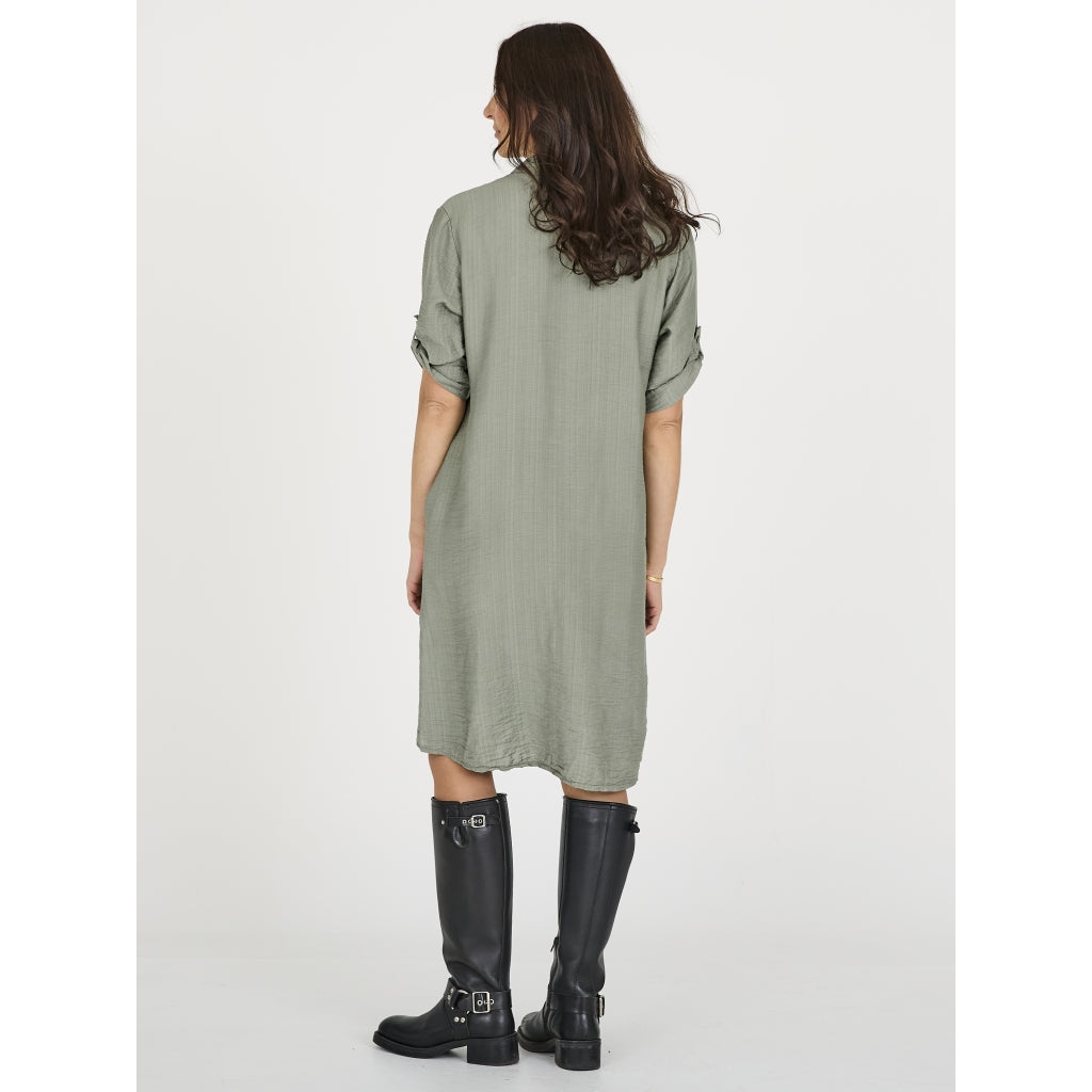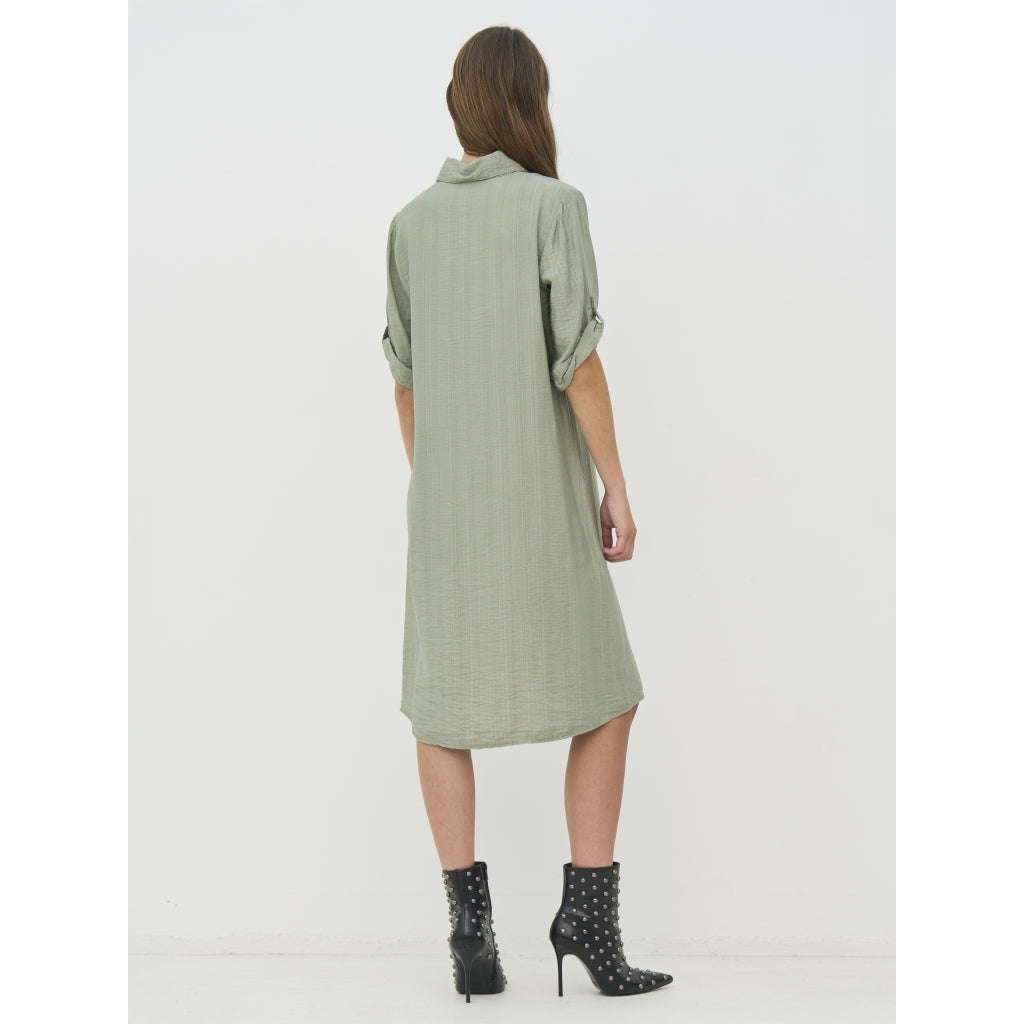 Dieses Hemdkleid vereint Einfachheit und Funktionalität in einem lockeren und bequemen Schnitt. Es verfügt über einen vollständigen Knopfverschluss vorne, einen klassischen Hemdkragen und umgeschlagene Ärmel, die mit Knopfriemen angepasst werden können. Das Kleid hat Seitentaschen, die ein praktisches Element hinzufügen, und die leicht strukturierte Qualität vervollständigt den entspannten Look.