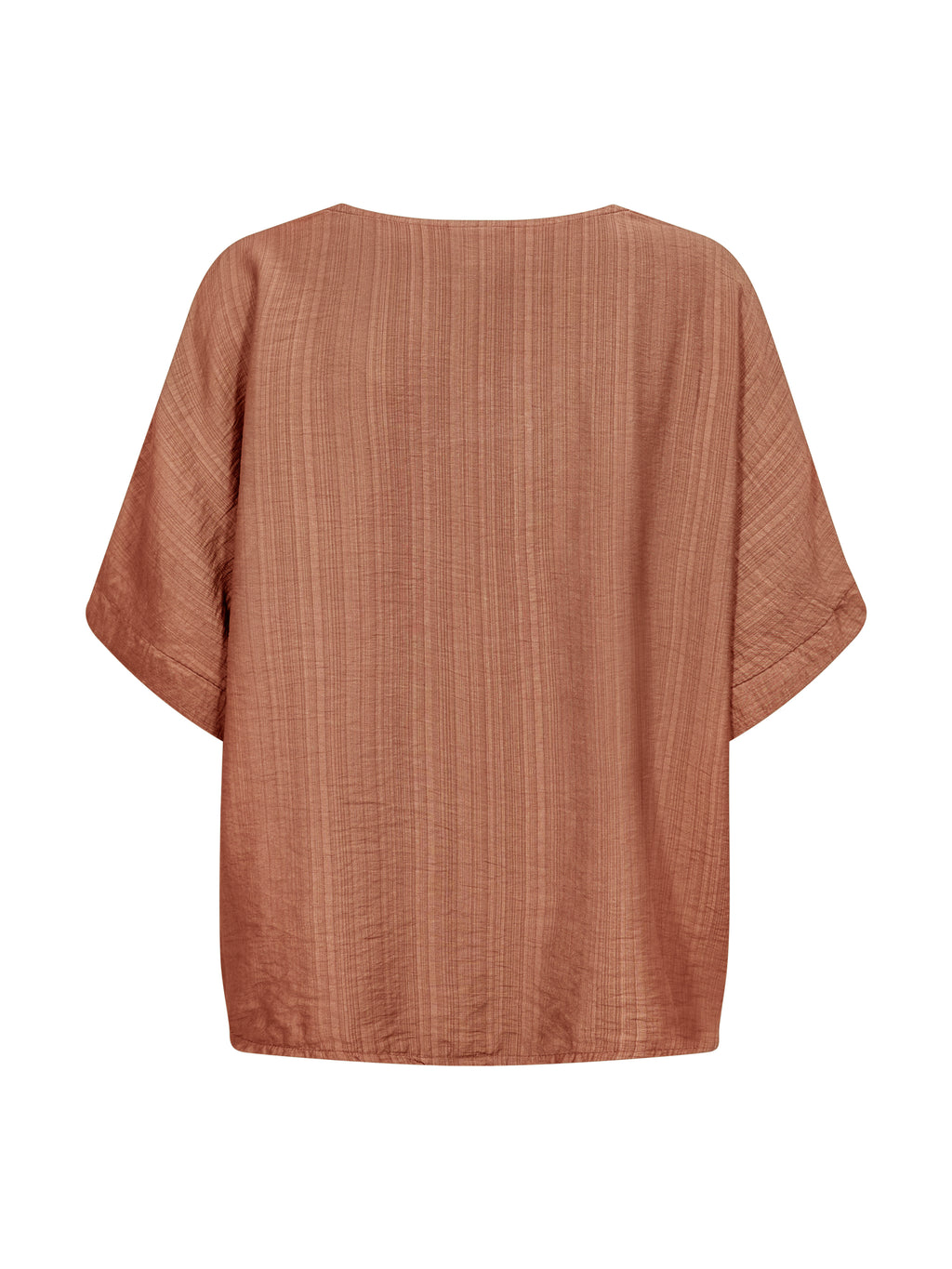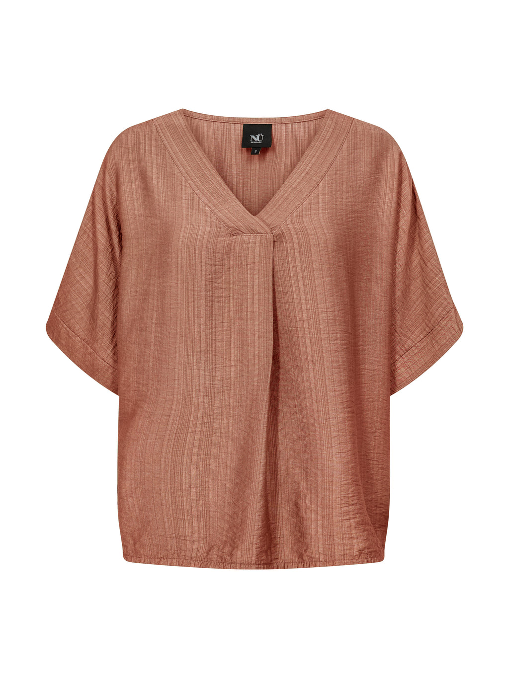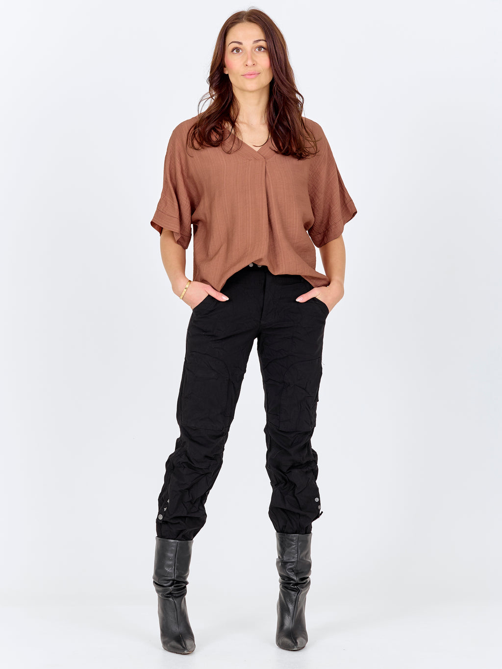 Diese luftige Bluse vereint Komfort und Einfachheit mit ihrem leicht strukturierten Material und lässiger Passform. Sie verfügt über kurze, locker sitzende Ärmel und einen V-Ausschnitt mit einer dekorativen Falte vorn, die einen weichen Mittelpunkt des Designs bildet. Der weite Ärmelabschluss verleiht der Bluse einen subtilen Touch und rundet den lässigen Look ab.