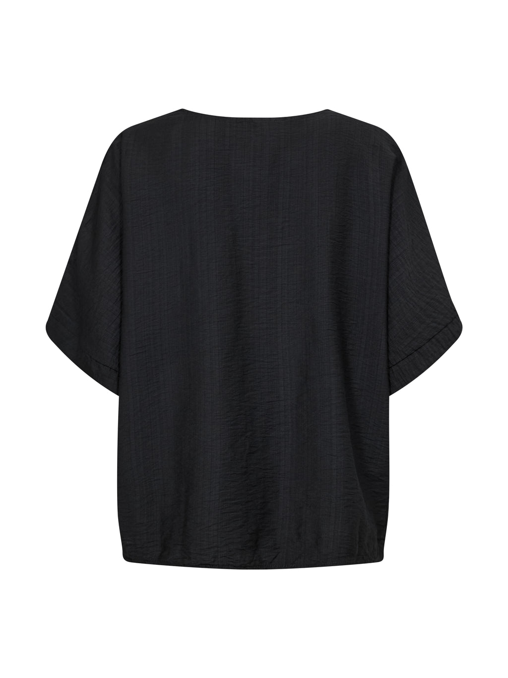 Diese luftige Bluse vereint Komfort und Einfachheit mit ihrem leicht strukturierten Material und lässiger Passform. Sie verfügt über kurze, locker sitzende Ärmel und einen V-Ausschnitt mit einer dekorativen Falte vorn, die einen weichen Mittelpunkt des Designs bildet. Der weite Ärmelabschluss verleiht der Bluse einen subtilen Touch und rundet den lässigen Look ab.