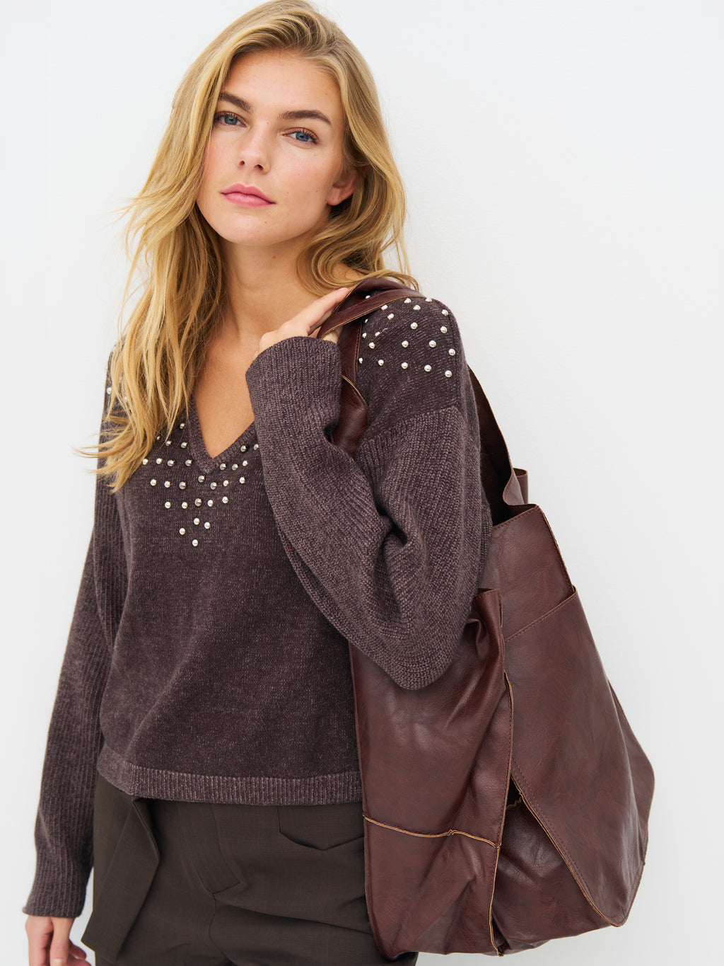 Kombinieren Sie die Tasche mit einer langen Strickjacke und Sneakers für einen entspannten und funktionalen Look.