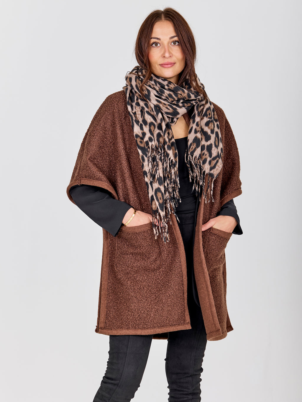 Ein auffälliges Tuch mit Leopardenmuster, das jedem Outfit Kante und Charakter verleiht. Die glatte Oberfläche fühlt sich angenehm auf der Haut an, und die dichten Fransen an den Enden runden das Design ab. Das Tuch hat eine gute Länge, was es einfach macht, es auf verschiedene Arten zu stylen - entweder locker hängend oder eng um den Hals gewickelt.