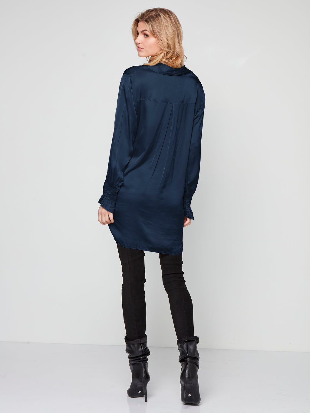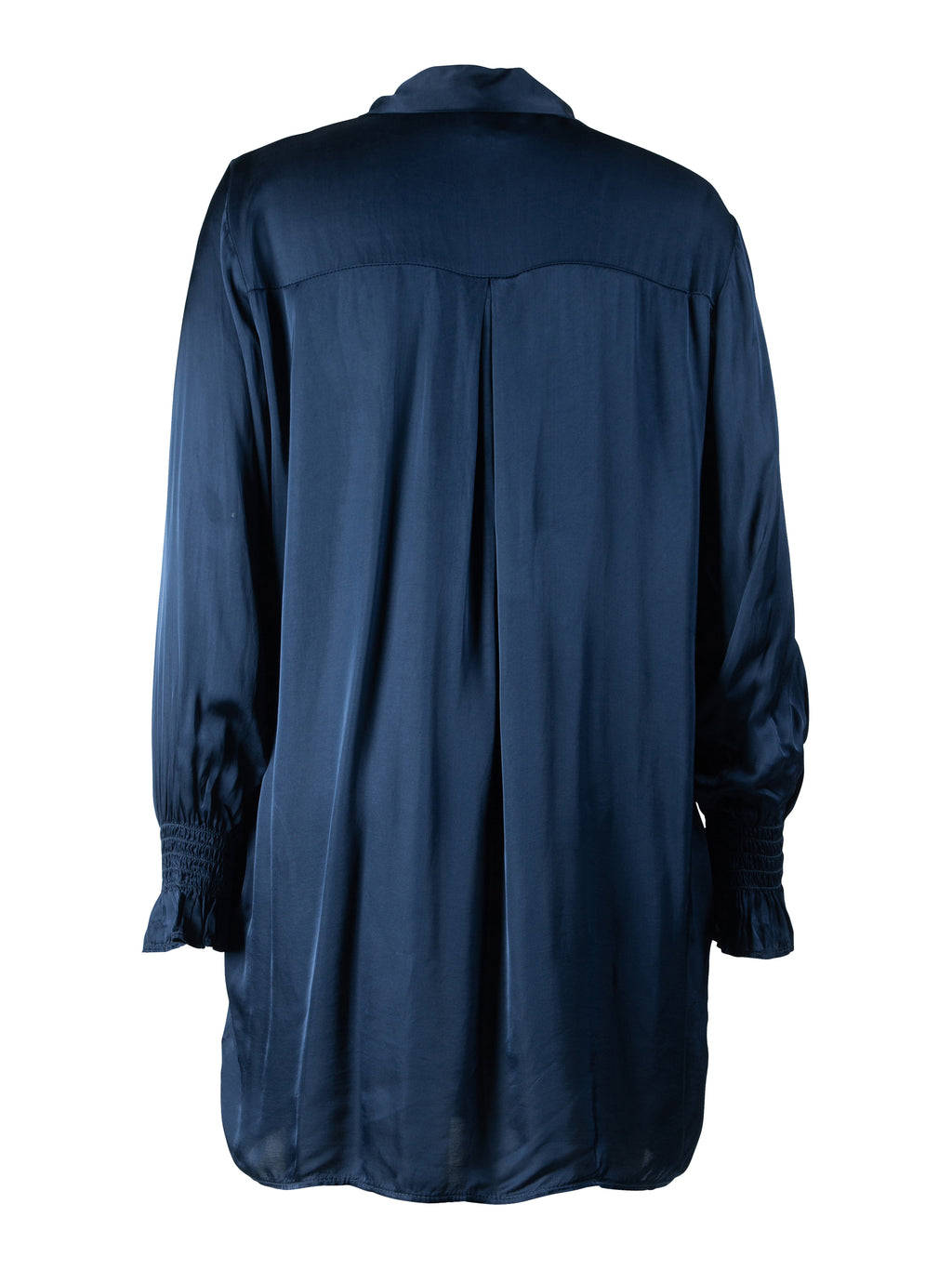 Diese Tunika ist die perfekte Kombination aus Komfort und Stil. Hergestellt aus einer glänzenden Viskose, die sie zu einem luxuriösen Style für jedes Outfit macht. Die Tunika hat eine lockere Silhouette, mit femininem V-Ausschnitt, klassischem Hemdkragen und langen Ärmeln mit feinem Smok-Detail. Verleihen Sie Ihrem Outfit mit dieser Tunika einen Hauch von Glamour – tragen Sie sie zu einer Alltagshose oder Leggings.