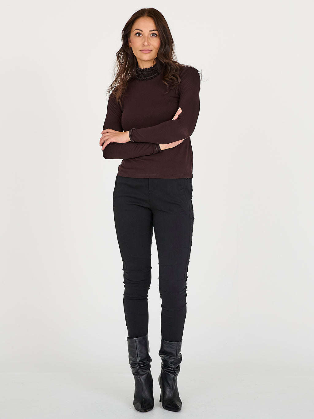 Dieses Langarm-T-Shirt hat einen einfachen und femininen Ausdruck mit einer körperbetonten Passform und feinen Details. Der hohe Halsausschnitt ist mit dekorativen Rüschen verziert, was einen leicht romantischen Look schafft. Das Material ist weich und dehnbar, was sowohl Komfort als auch eine glatte Silhouette bietet. Die Ärmelabschlüsse haben einen subtilen welligen Rand, der das zarte Design vervollständigt.
