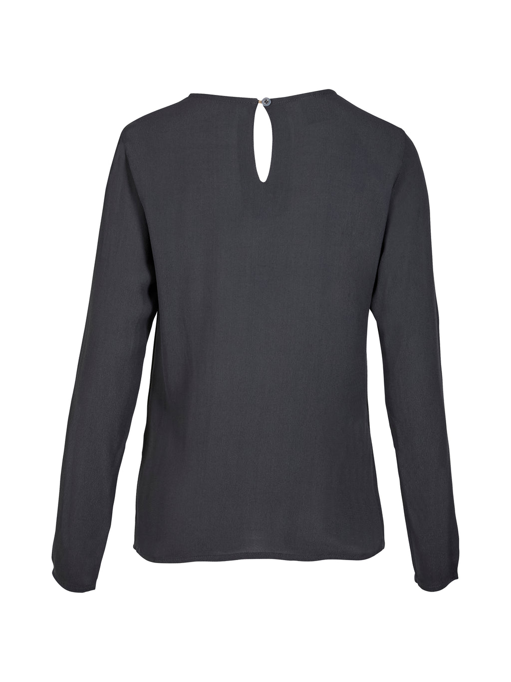 Werten Sie Ihr Outfit mit dieser eleganten Bluse auf, die Einfachheit und raffinierte Details verbindet. Vorne weist sie weiche Falten und einen breiten Einsatz an der Taille auf, die eine schmeichelhafte Silhouette schaffen. Der runde Ausschnitt und die langen Ärmel machen sie sowohl für den Alltag als auch für formelle Anlässe geeignet. Ein kleiner Schlüssellochausschnitt mit einem Knopfverschluss auf der Rückseite vervollständigt den femininen Ausdruck.