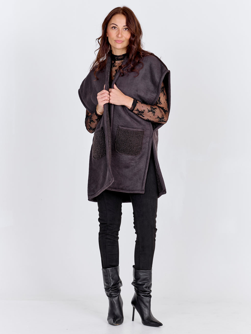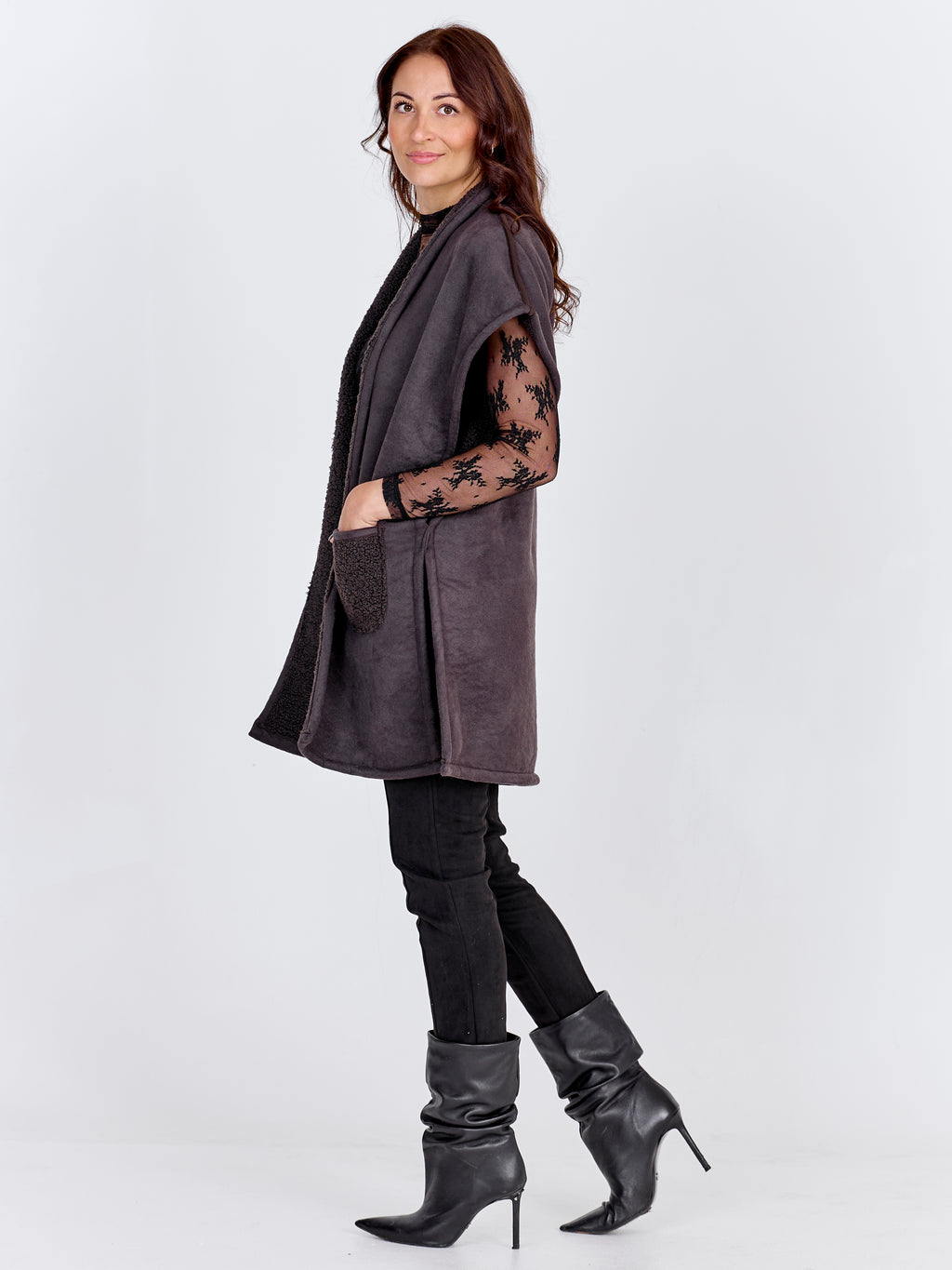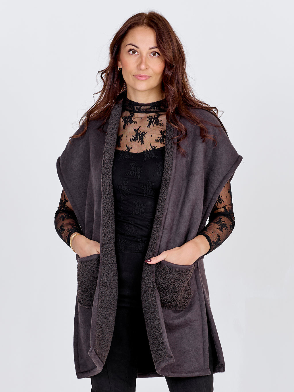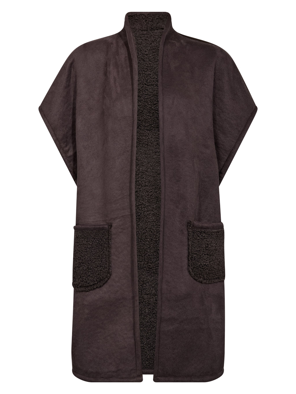 Diese wendbare Weste vereint weichen Komfort mit einem einfachen und funktionalen Design. Eine Seite verfügt über eine glatte Oberfläche mit zwei vorderen Taschen in Teddyfell, während die andere Seite komplett aus Teddyfell besteht und für einen lässigeren und warmen Look sorgt. Die Weste hat eine offene Vorderseite und eine lockere Passform, die es einfach macht, sie über alles von Strickwaren bis Hemden zu stylen.
