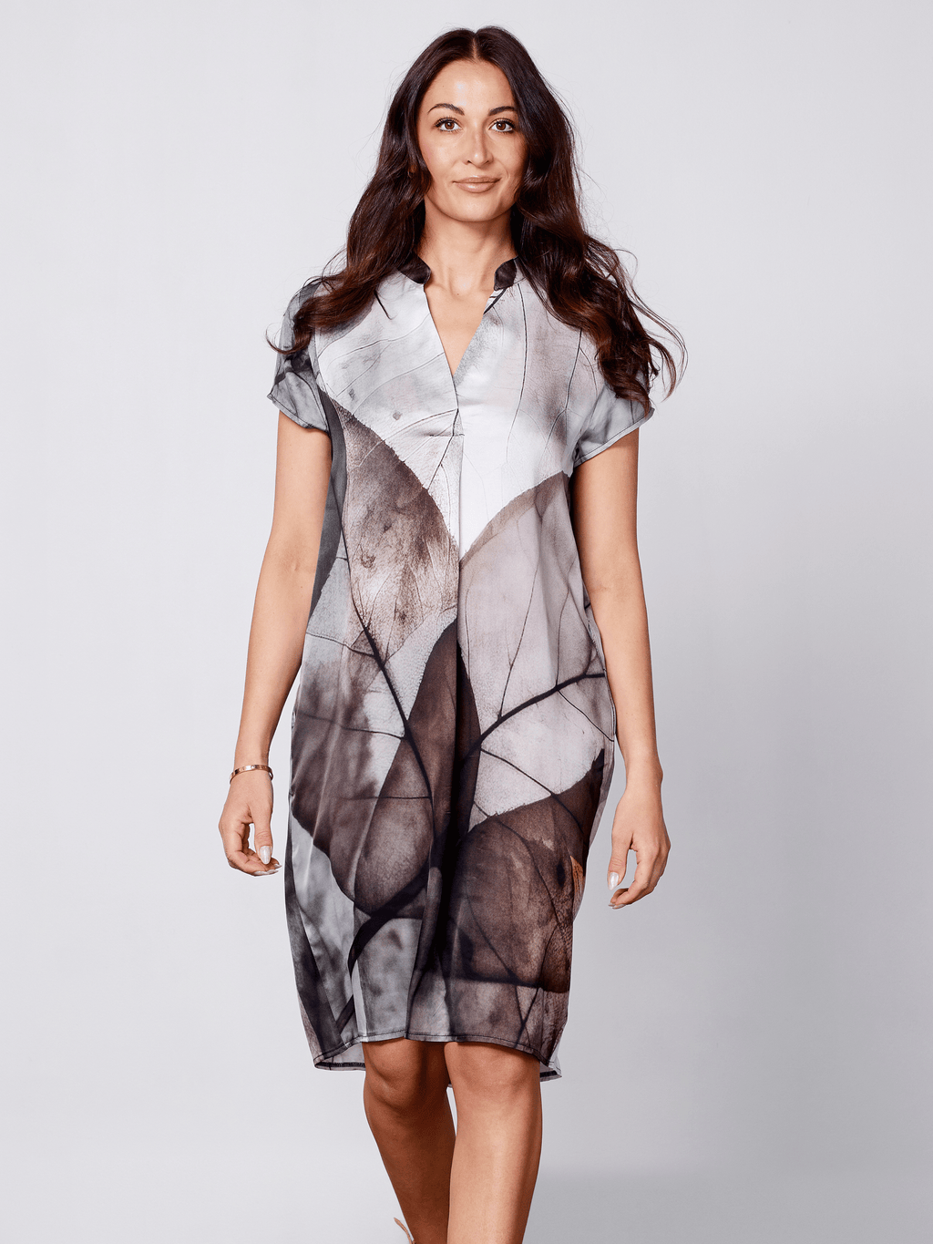 Das Kleid hat eine lockere, gerade Passform mit kurzen Ärmeln und einem eleganten V-Ausschnitt mit kleinem Kragen. Es hat eine weiche Silhouette und eine leichte Struktur mit einer dekorativen Falte auf der Rückseite, die zusätzlichen Komfort bietet. Das Modell ist in verschiedenen Drucken erhältlich, sodass Sie leicht eine Variante finden können, die Ihrem Stil entspricht.