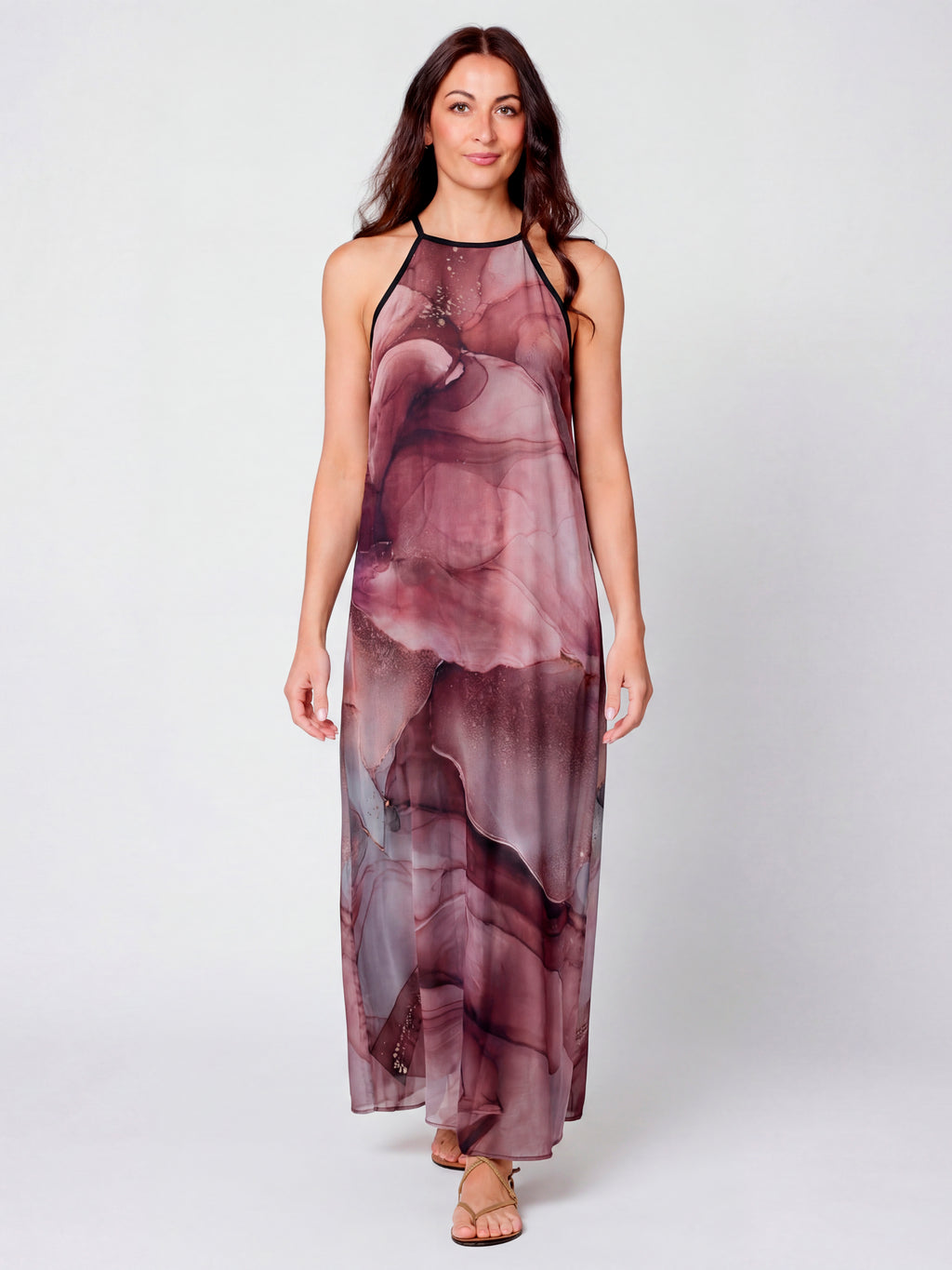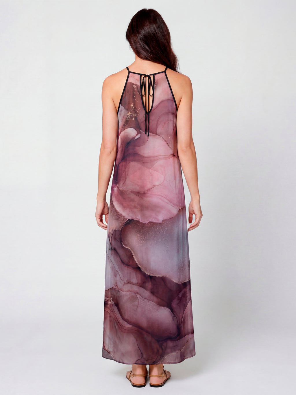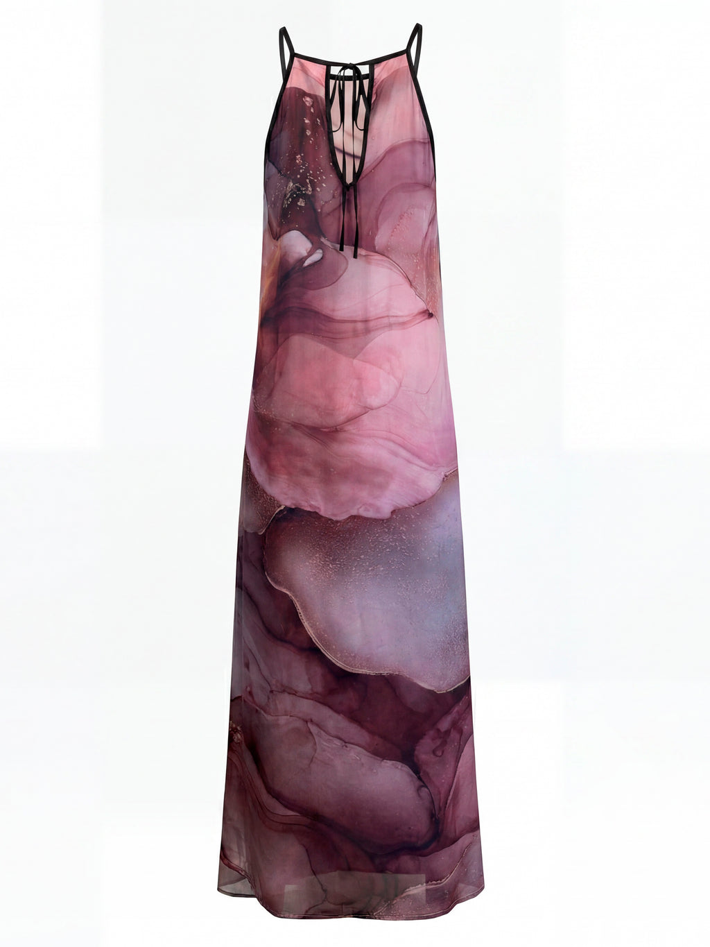 Das Kleid zeichnet sich durch eine elegante, lange A-Linie-Silhouette mit dünnen Trägern und einer leicht ausgestellten Passform aus, die einen luftigen Ausdruck schafft. Es schließt am Hals mit einem verstellbaren Bindedetail und bildet eine schöne Öffnung im Rücken. Das Modell ist in verschiedenen Drucken erhältlich, die jeweils einen einzigartigen und femininen Ausdruck bieten.