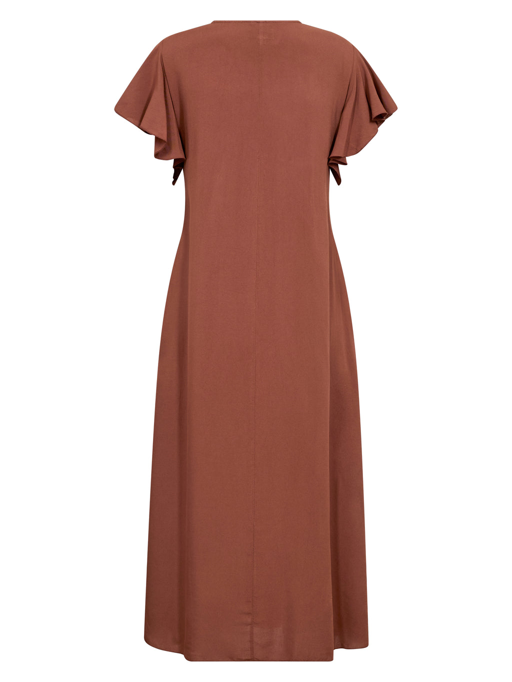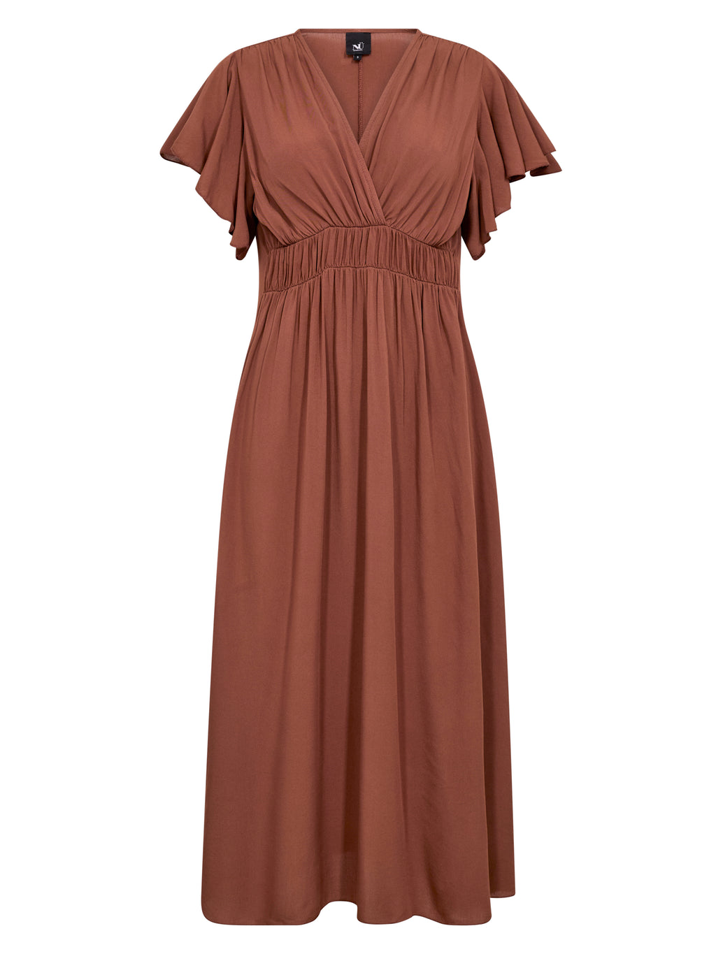 Das Kleid hat einen weichen und femininen Schnitt mit einem V-Ausschnitt und einem kleinen zarten Ärmel. Ein schmaler elastischer Bund vorne sorgt für eine schmeichelhafte Silhouette und verleiht einen natürlichen Fall. Der Rücken ist schlicht und glatt und betont den cleanen Look des Kleides. Die leichten Materialien und die lockere Passform machen es den ganzen Tag über angenehm zu tragen.