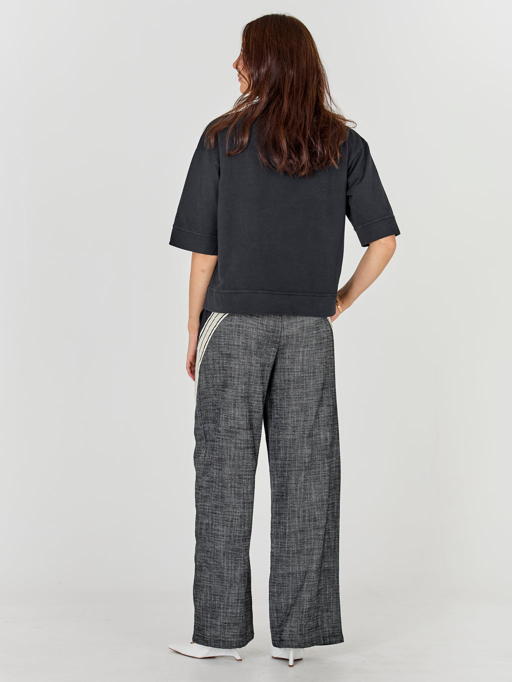 Dieses kastige T-Shirt ist aus einem weichen Sweatmaterial mit leichter Struktur gefertigt, das einen entspannten, aber stilvollen Look verleiht. Es hat eine lockere Passform, überschnittene Schultern und weite Ärmel - perfekt für entspannte Tage und coole Alltagslooks.