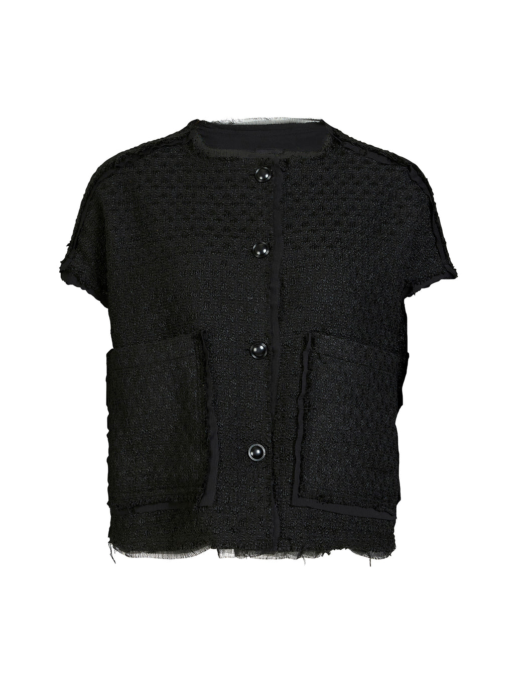 Diese Weste hat mit ihrem Bouclé-Material und den sichtbaren, ausgefransten Kanten einen rohen und charaktervollen Ausdruck. Das Design ist einfach, aber voller Kante - die offenen Fäden und losen Schnüre betonen den unpolierten Look und verleihen der Weste eine ganz besondere Haltung. Die großen aufgesetzten Taschen vorne bieten Funktionalität und unterstützen das entspannte, aber markante Design.