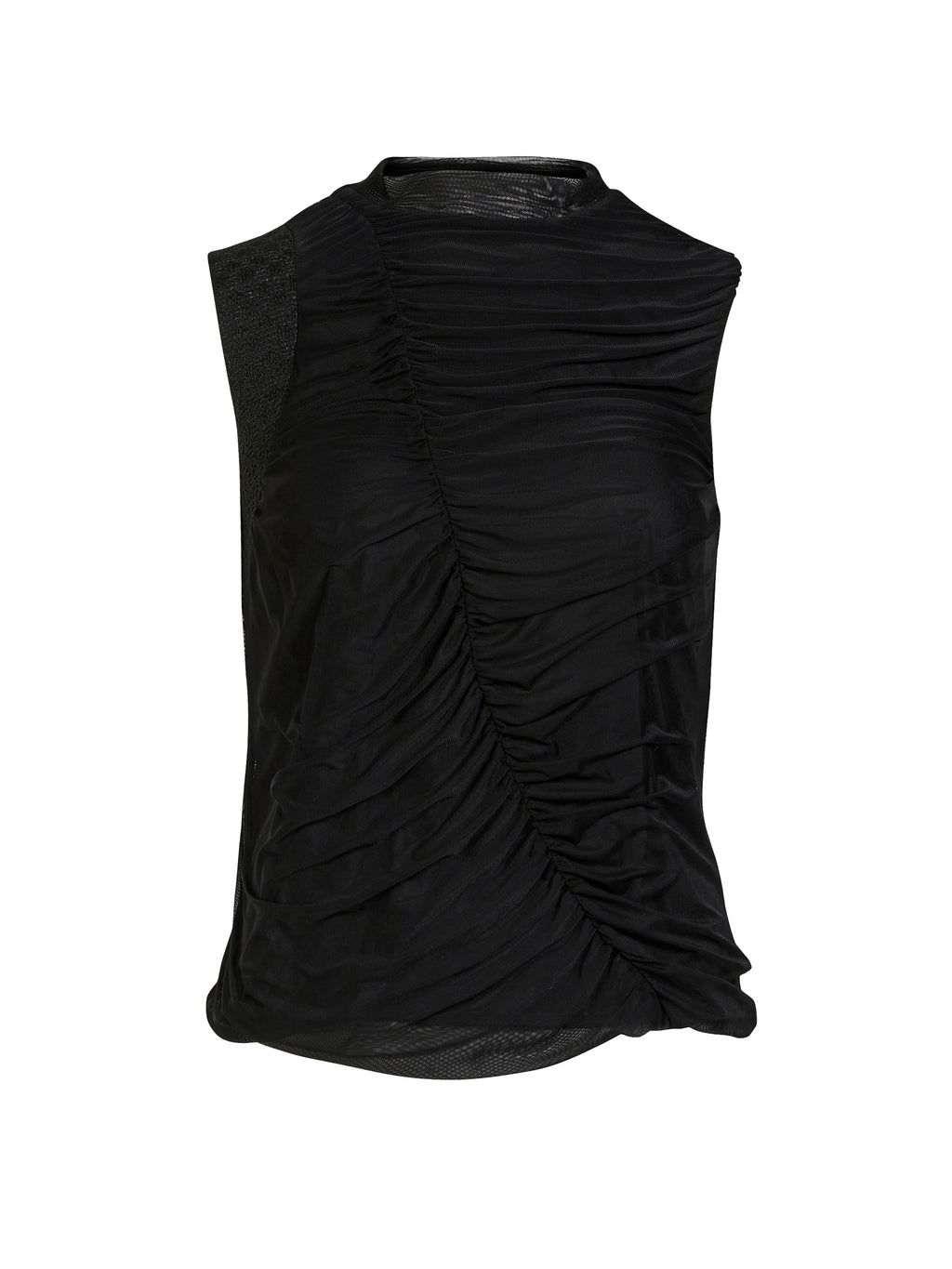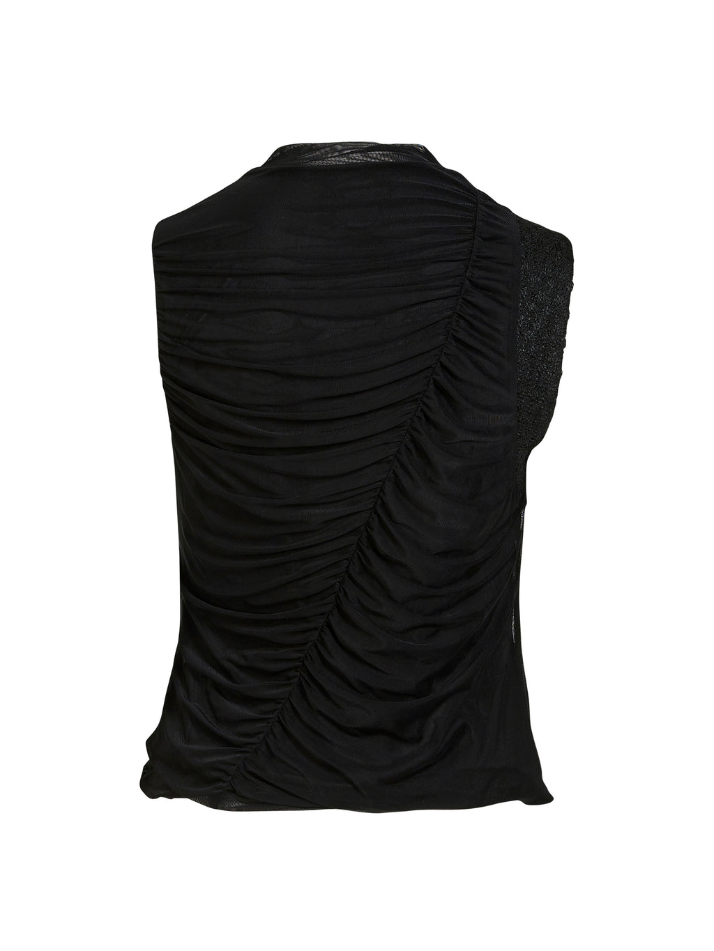 Eine moderne Variante des klassischen Oberteils - dieses ärmellose Modell fällt durch sein mutiges, diagonales gerüschtes Design sowohl vorne als auch hinten auf. Ein glänzendes Detail am Ausschnitt verleiht dem Ganzen Charakter, während die leicht durchsichtige Mesh-Struktur einen raffinierten Look verleiht. Die figurbetonte Silhouette macht es ideal unter einem Blazer oder solo als Statementstück.