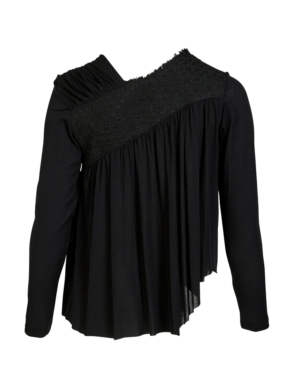 Diese Bluse sticht durch ihren asymmetrischen Reißverschluss und aufregende Kombination von Texturen hervor. Der obere Teil besteht aus einem strukturierten Stoff und bildet einen Kontrast zu dem leichten, plissierten Fall am unteren Saum. Die langen Ärmel und die weiche Qualität sorgen für Komfort, während der schräge Schnitt zusätzlichen Schwung und Bewegung verleiht.