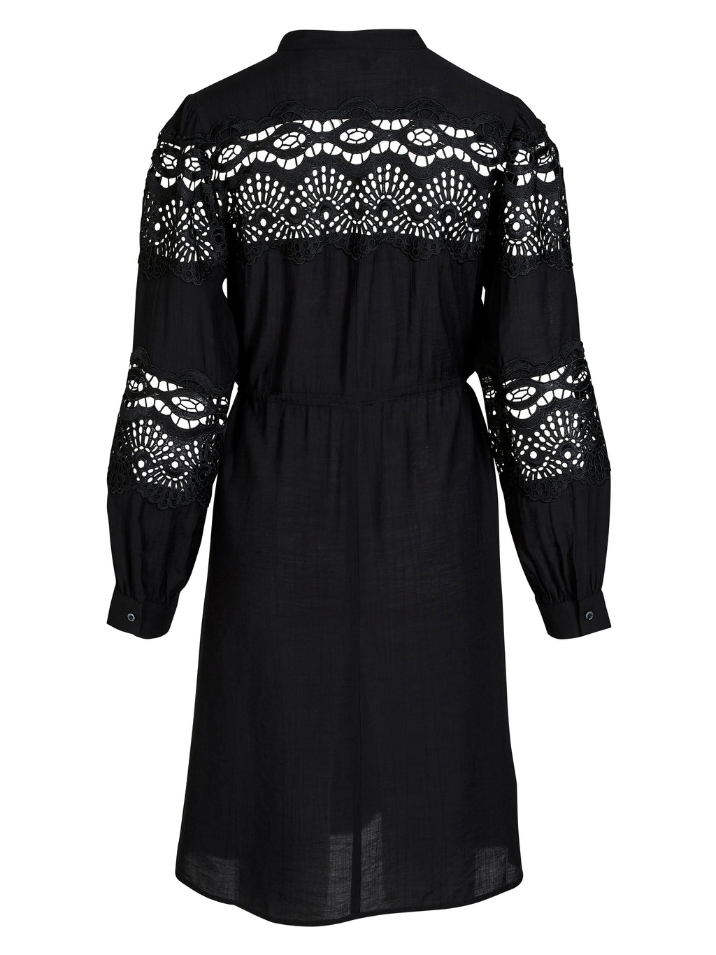 Dieses Kleid kombiniert romantische Details mit einer lockeren Silhouette. Die schönen Spitzenabschnitte über der Brust, den Schultern und Ärmeln erzeugen einen femininen Ausdruck, während der Taillengürtel eine verstellbare Passform ermöglicht. Die langen Ärmel sind mit Manschetten und Knöpfen verziert und verleihen dem Kleid eine klassische Note.