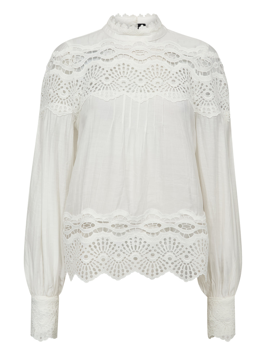 Erreichen Sie einen raffinierten und romantischen Ausdruck mit diesem wunderschönen Hemd, das klassische Schnitte mit dekorativen Spitzen-Details kombiniert. Die breiten Spitzenbänder zieren sowohl die Brust, den Rücken, die Manschetten und den Saum und schaffen ein elegantes Zusammenspiel zwischen Transparenz und Dichte. Der kleine Stehkragen und die Knopfleiste auf der Rückseite geben einen stilvollen Abschluss.