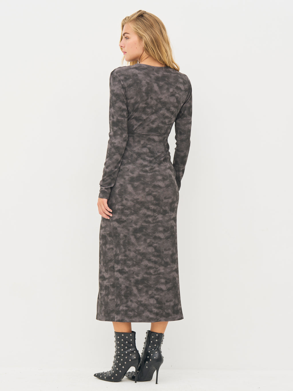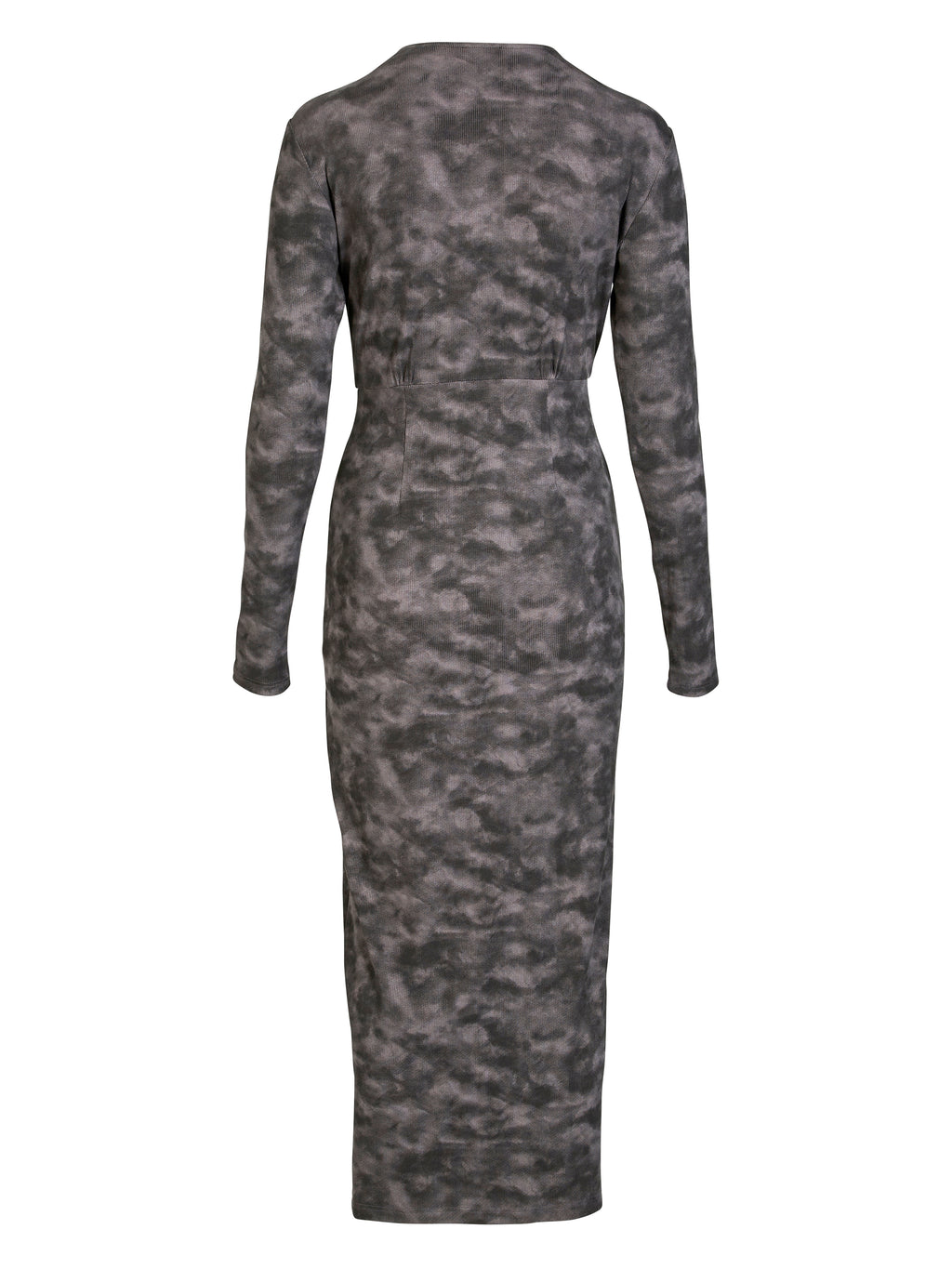 Dieses elegante Kleid verfügt über einen schmeichelhaften Wickel-Effekt und einen sanft drapierten Schnitt, was ihm einen femininen und formschönen Ausdruck verleiht. Das weiche Material umschmeichelt den Körper, während die langen Ärmel es sowohl für den Tag als auch für den Abend geeignet machen. Das dezente Muster verleiht dem schlichten Design Tiefe und Charakter.