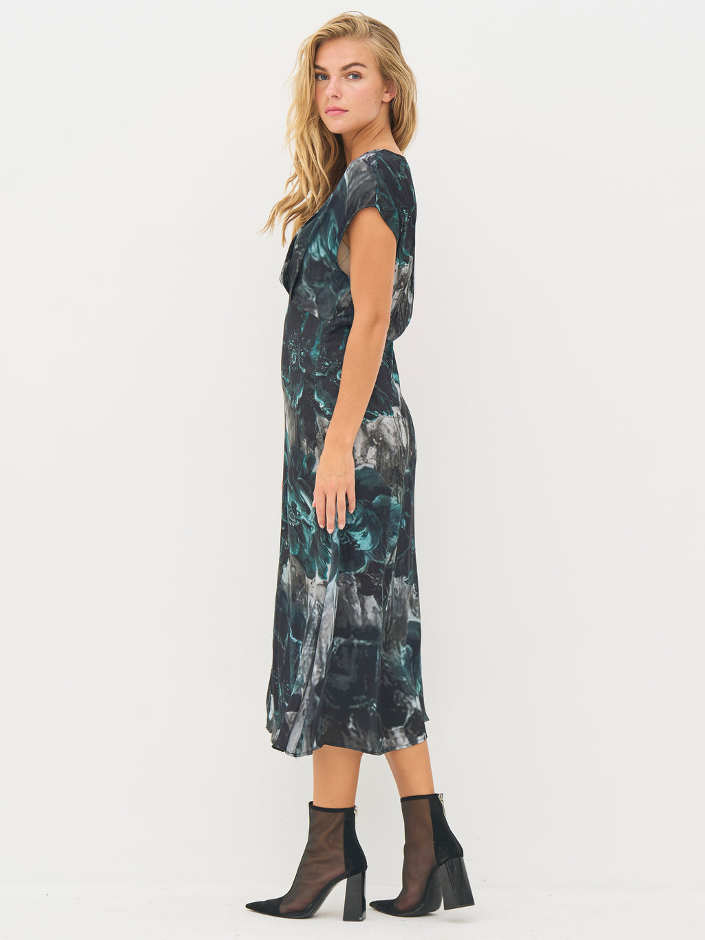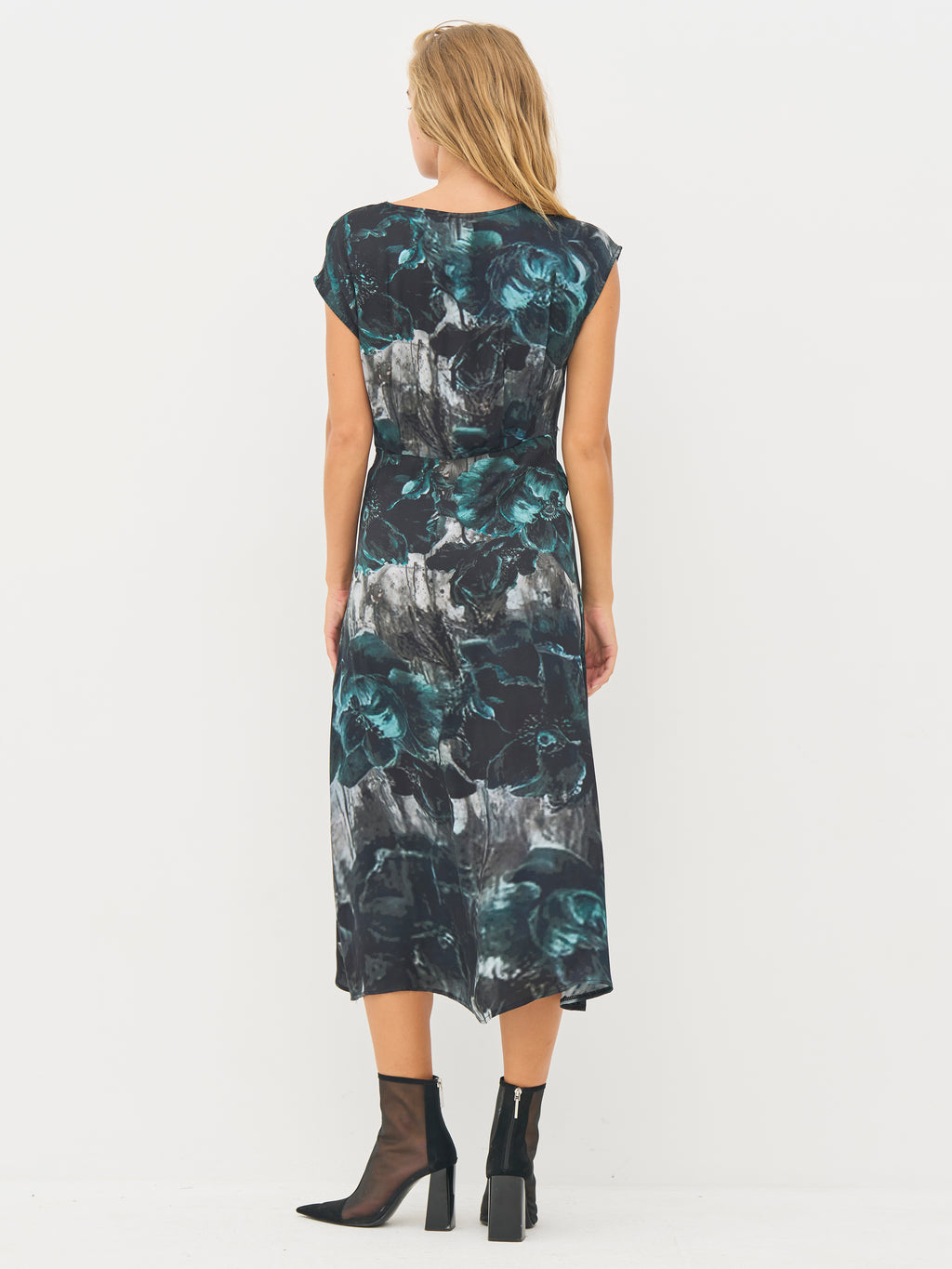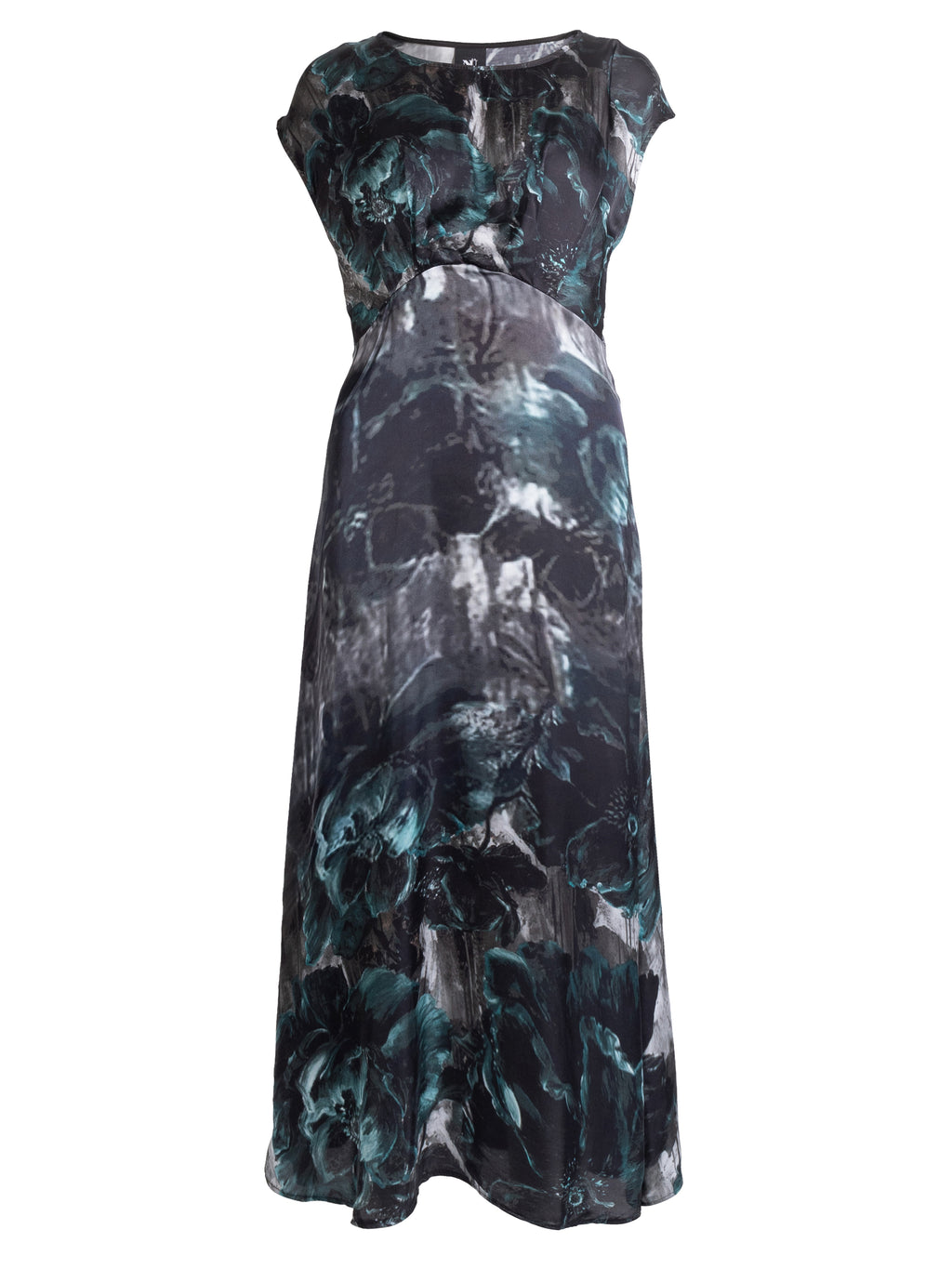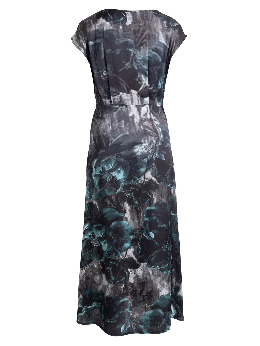 Eine elegante Wahl sowohl für den täglichen Gebrauch als auch für festliche Anlässe. Dieses lange Kleid hat einen wunderschönen Fall und einen femininen Schnitt mit einer leicht definierten Taille. Der weiche Stoff folgt dem Körper auf vorteilhafte Weise, während der auffällige Blumendruck Tiefe und Charakter in das Design bringt. Die kurzen Ärmel und der Rundhalsausschnitt verleihen dem Kleid einen einfachen und zeitlosen Ausdruck.