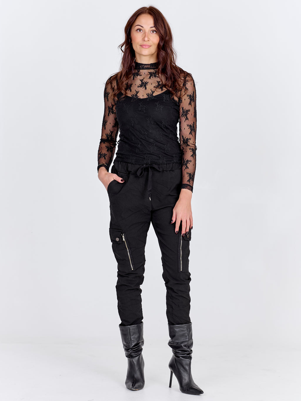 Eine feminine Spitzenbluse aus Mesh mit dekorativer Blumenstickerei auf der gesamten Fläche. Die figurbetonte Passform und der kleine Kragen verleihen einen eleganten Look, während die langen Ärmel das leichte und raffinierte Erscheinungsbild betonen. Die Bluse ist vorne und hinten gleich und kann in Kombination mit einem Strickoberteil oder allein mit einem Basistop darunter gestylt werden.