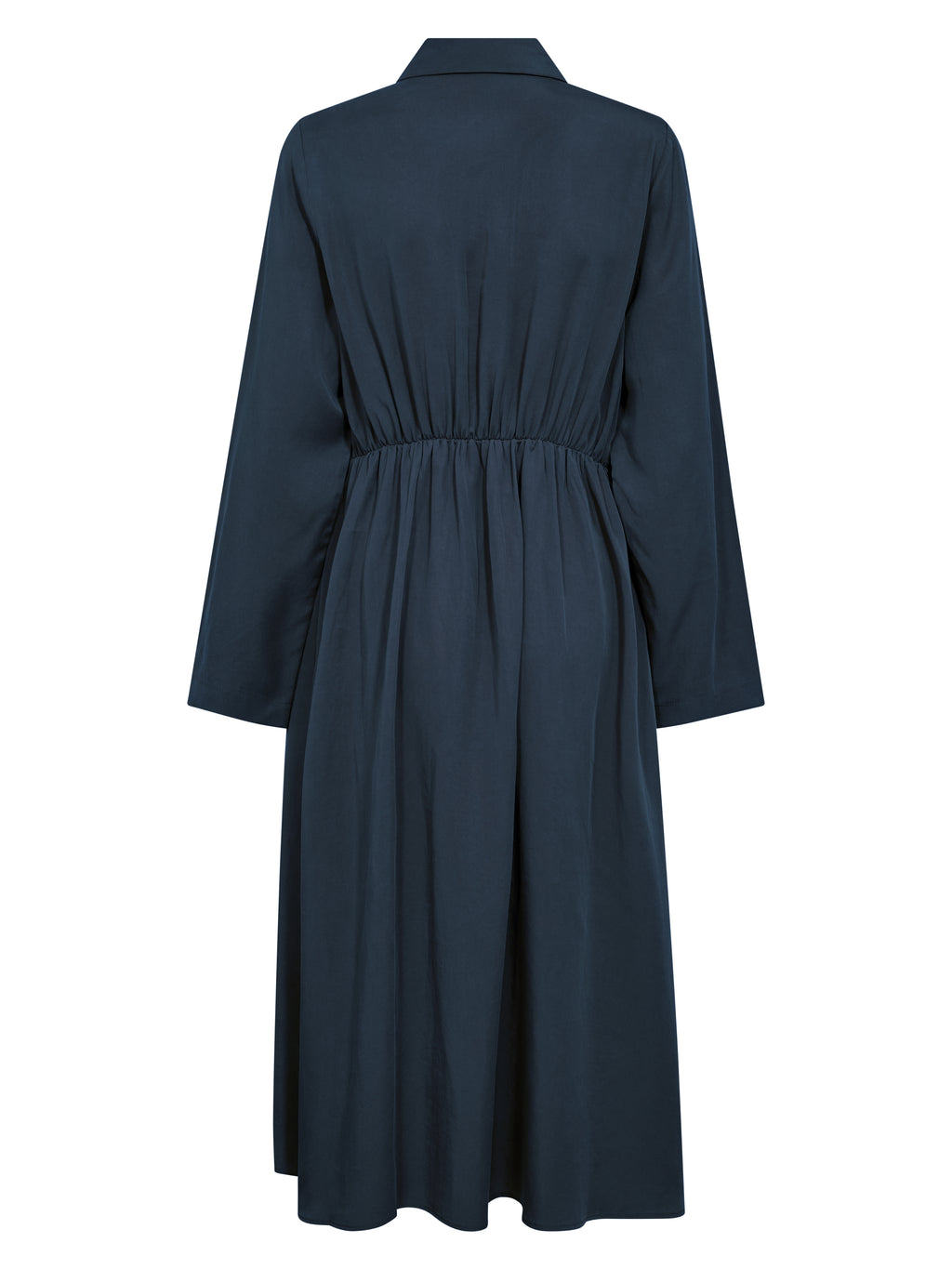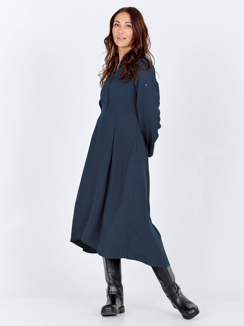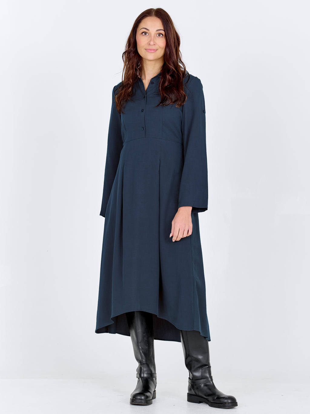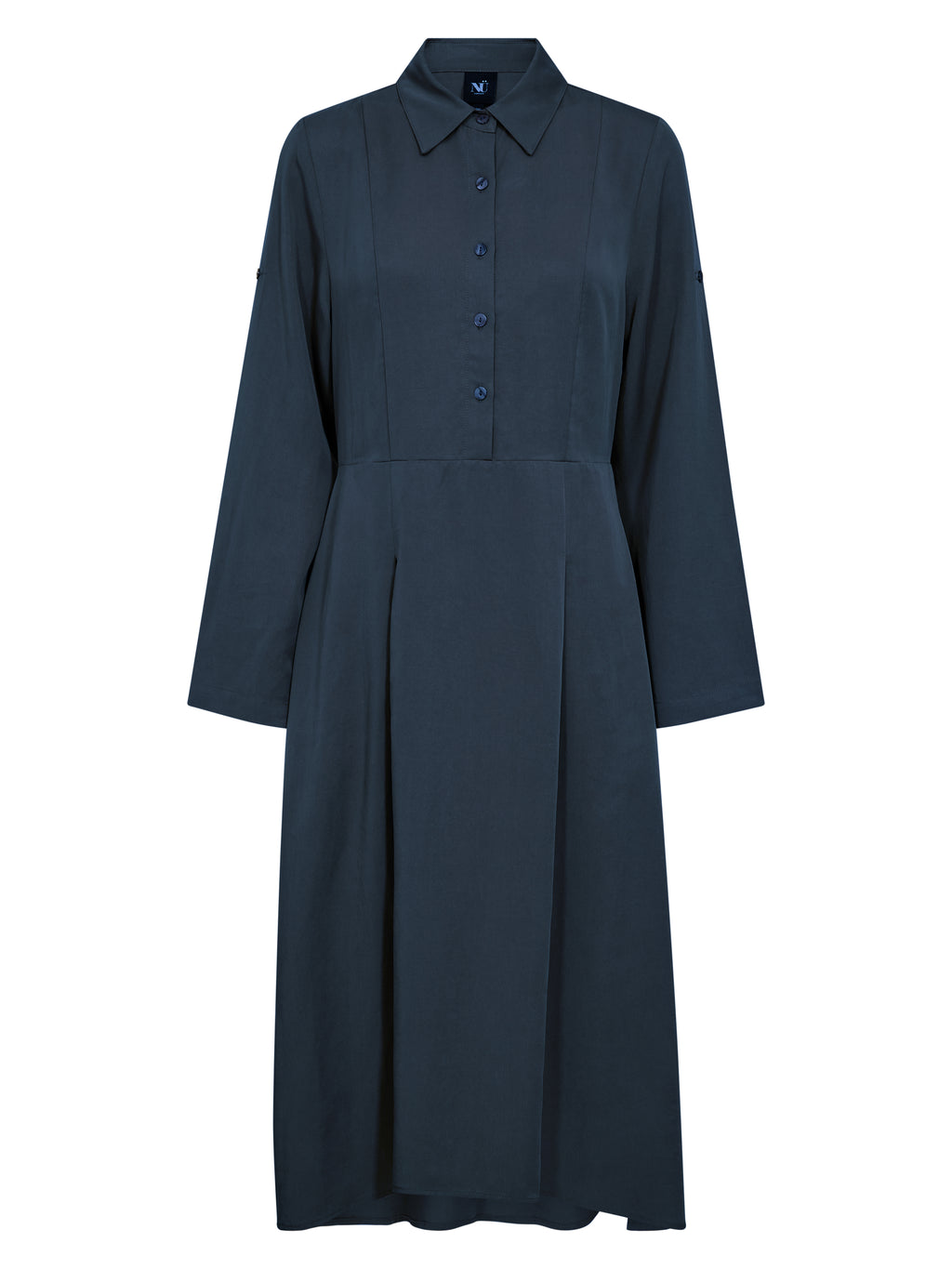 Dieses Kleid hat einen einfachen und zeitlosen Look mit seinem Hemdkragen, Knopfverschluss und klaren Linien. Vorne hat es feine Falten, die einen leichten Fall im Rock erzeugen, während der elastische Einsatz auf der Rückseite für eine bequeme und gut sitzende Passform sorgt. Die langen Ärmel runden das Design ab und machen das Kleid ideal für den täglichen Gebrauch und formellere Anlässe. Kombinieren Sie es mit Stiefeln für einen modernen Look oder mit flachen Schuhen für einen entspannteren Auftritt.