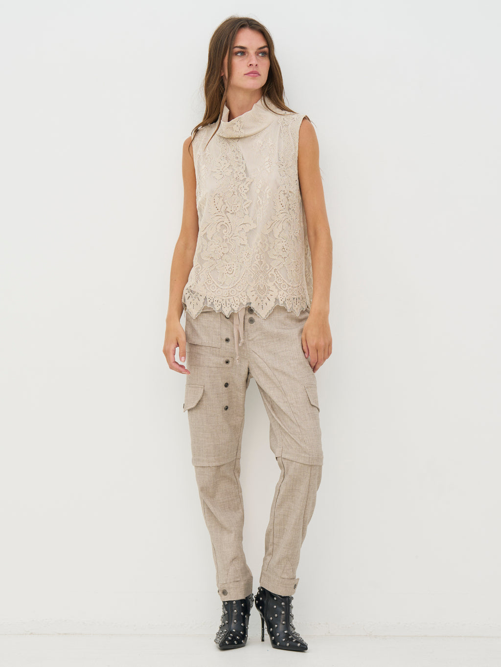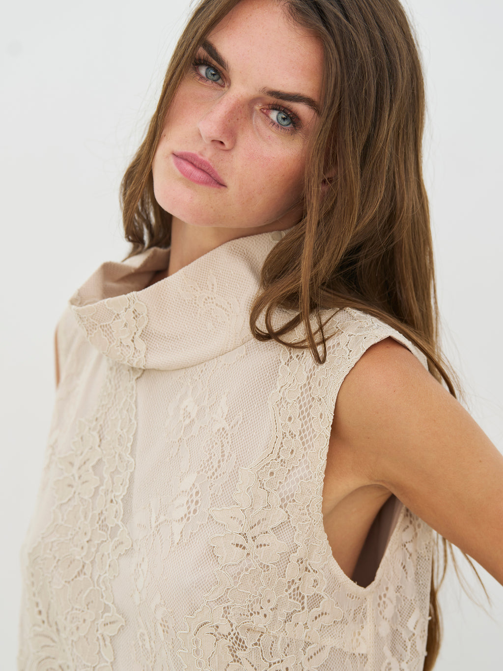 Dieses Oberteil ist aus Spitzenstoff gefertigt und hat einen femininen Look mit hohem Hals und ärmellosem Schnitt. Die Spitze sorgt für ein feines Spiel auf der Oberfläche, während der untere Saum leicht gewellt ist und das Design auf hübsche Weise abschließt. Der Ausdruck ist vorne und hinten gleichmäßig, so dass das Oberteil ruhig und leicht um den Körper fällt. Es ist einfach, das Oberteil sowohl für den täglichen Gebrauch als auch für festlichere Anlässe zu stylen. Kombinieren Sie das Oberteil mit einer Hose, einem Rock oder unter einer Jacke oder einem Blazer.