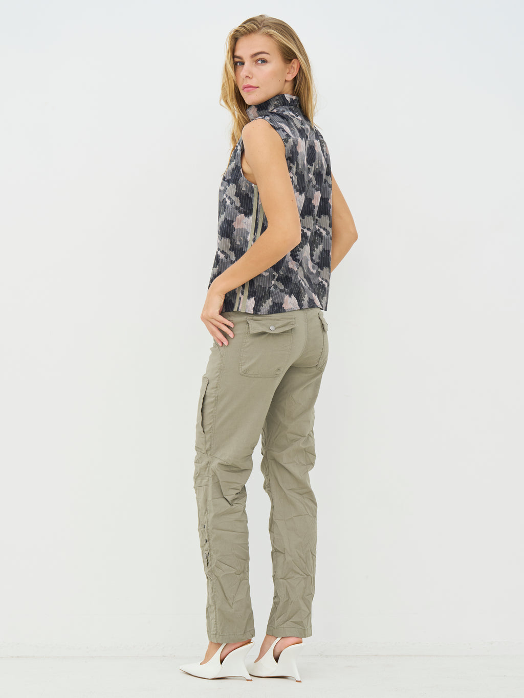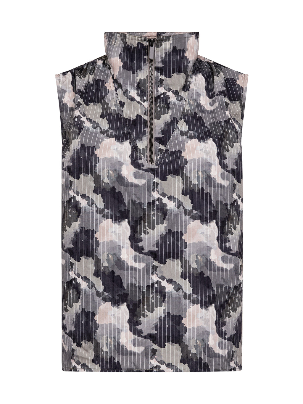 Dieses Top hat einen lässigen und modernen Look mit einer geraden Passform und hohem Kragen, der vorne mit einem kurzen Reißverschluss geschlossen wird. Die Vorderseite ist ruhig gehalten, während der Schnitt am Hals eine schöne V-Form erzeugt, die eine dezente Kante verleiht. Der Stoff fällt weich und macht das Oberteil angenehm zu tragen, und die Rückseite ist schlicht und ohne Details. Kombinieren Sie es mit der passenden Hose für ein komplettes Set oder stylen Sie es mit Jeans oder Shorts für einen legeren Alltagslook.