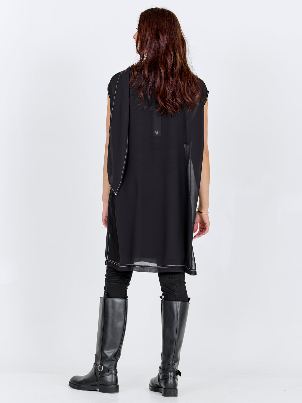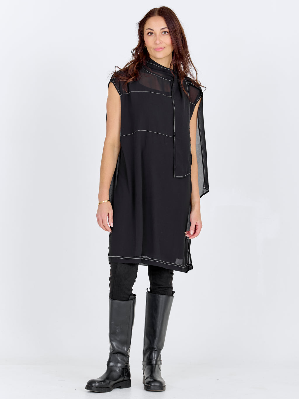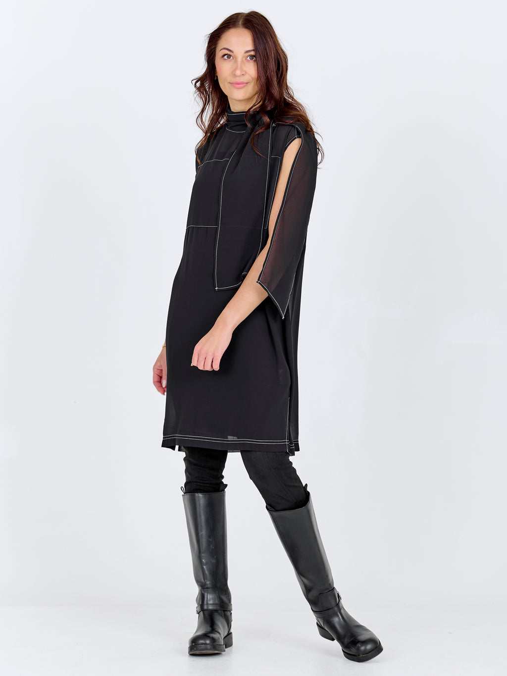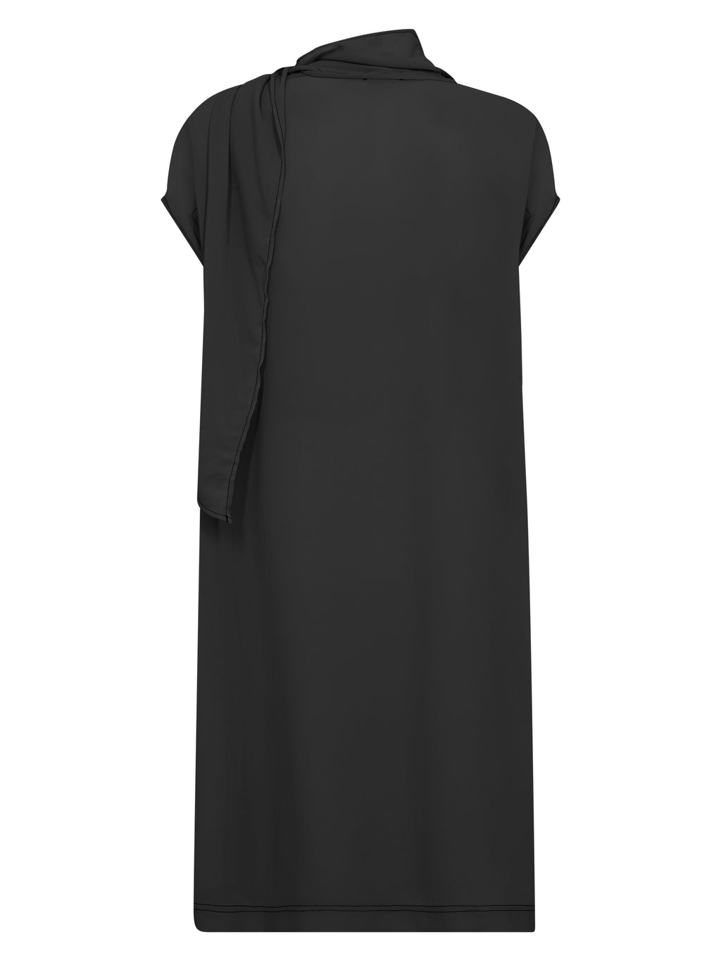 Dieses Kleid besticht durch einen einfachen und eleganten Ausdruck mit einer geraden Passform, die schön am Körper entlang fällt. Die kurze Ärmellänge verleiht ein luftiges Aussehen, während der locker sitzende Schal um den Hals Bewegung und ein hübsches Detail hinzufügt, das auf vielfältige Weise gestylt werden kann. Die dezenten Nähte erzeugen eine ruhige Struktur und verleihen dem Kleid einen durchdachten Look. Die Rückseite ist sehr schlicht und betont die klare Silhouette. Tragen Sie das Kleid mit flachen Schuhen für den Alltag oder mit Absätzen und Schmuck für formellere Anlässe.