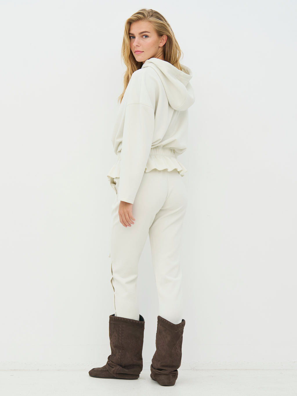 Diese Hose ist aus einem weichen und dehnbaren Material gefertigt, was sie besonders angenehm zu tragen macht. Die Passform ist schmal mit einem elastischen Bund und Kordelzug, sodass sie leicht angepasst werden können, während Rippstrick an den Knöcheln für ein entspanntes und elegantes Aussehen sorgt. Die Vorderseite ist schlicht gestaltet, und auf der Rückseite folgen die Hosen dem Körper, ohne einzuengen. Perfekt sowohl für zu Hause als auch für den täglichen Gebrauch, wo Komfort im Mittelpunkt steht. Kombinieren Sie sie mit einem passenden Oberteil, Strickware oder einem T-Shirt.