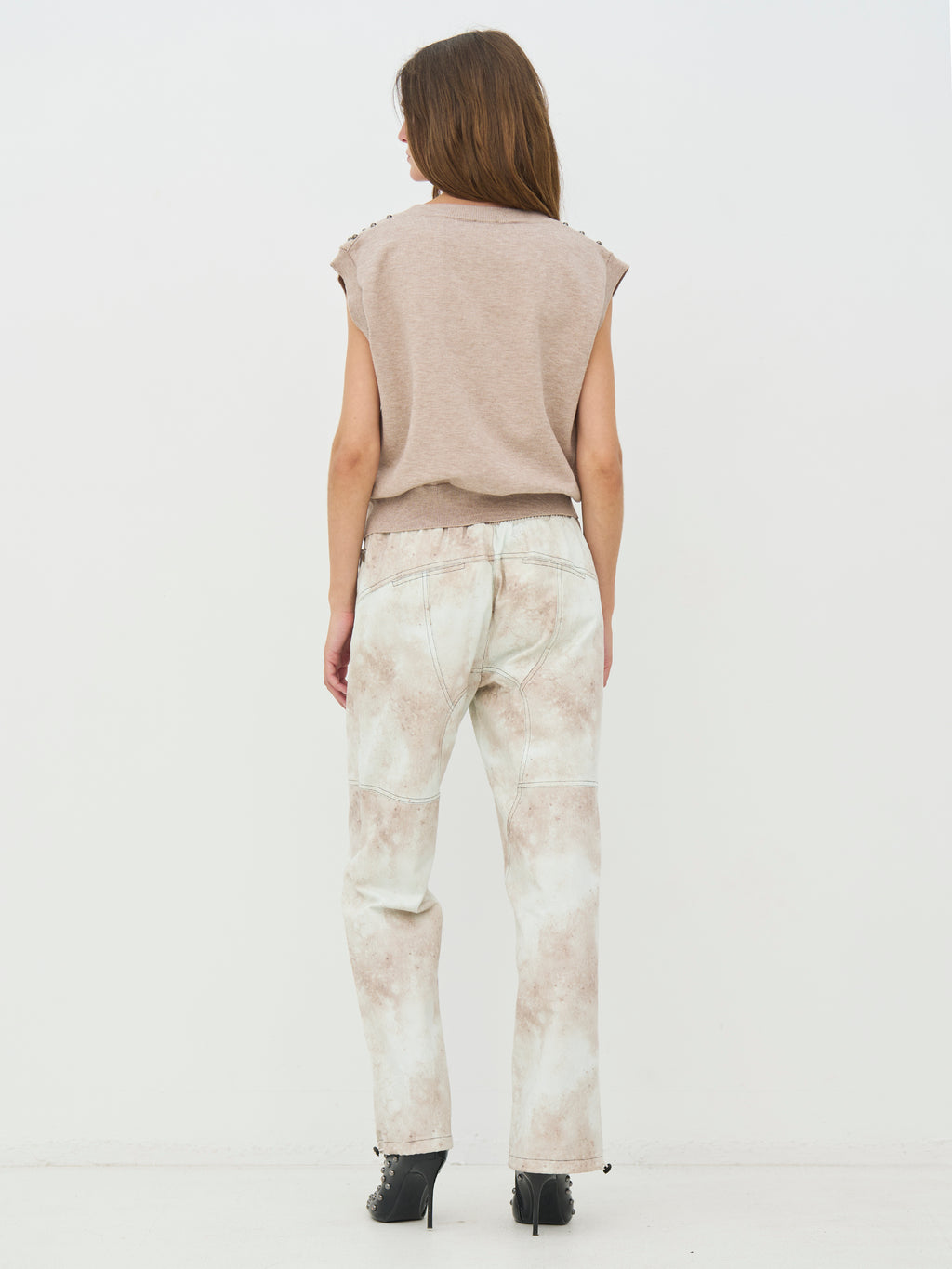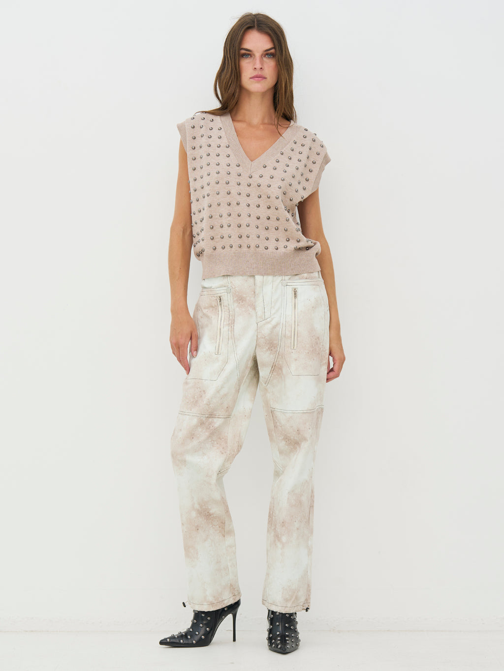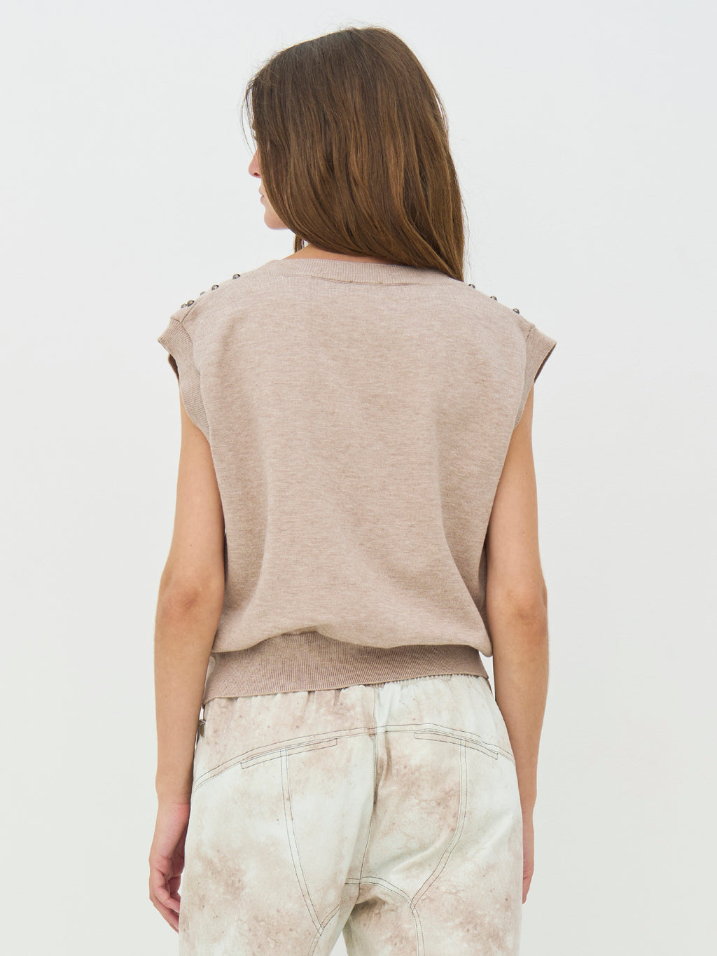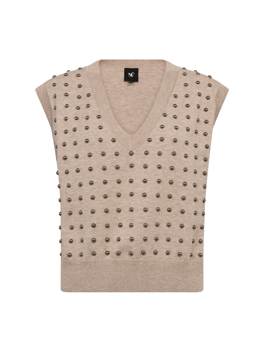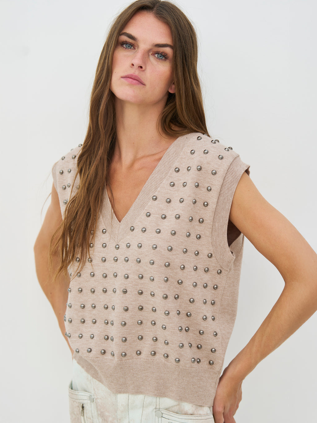 Diese Strickweste hat einen einfachen Look mit V-Ausschnitt und einer geraden Passform, was sie einfach zu stylen macht. Die kleinen Nieten verleihen der Weste eine kantige und etwas rauere Optik, ohne übertrieben zu wirken. Sie ist ärmellos und funktioniert sowohl alleine als auch über einem Hemd oder Top gut. Die Rückseite ist ruhiger und hält das Erscheinungsbild ausgeglichen. Tragen Sie sie zu Jeans, Hosen oder Röcken für einen entspannten, aber durchdachten Look.