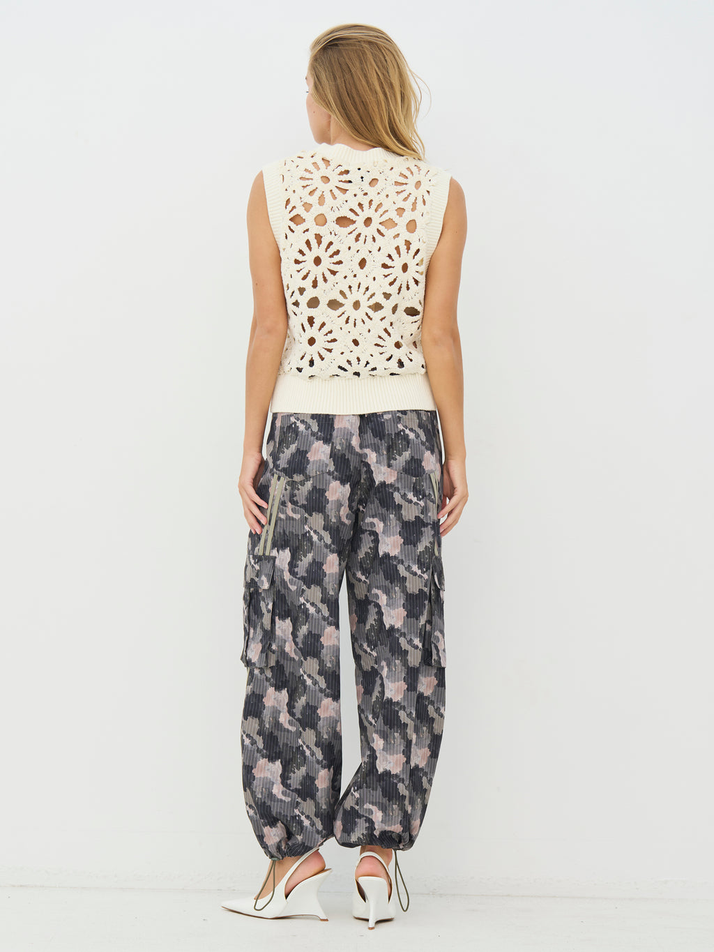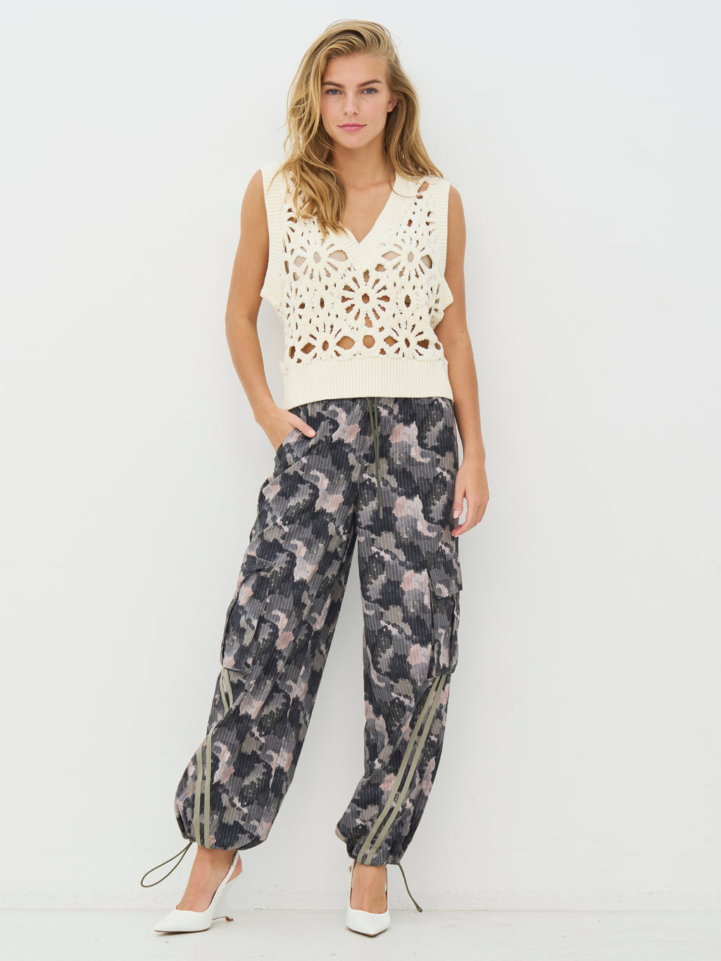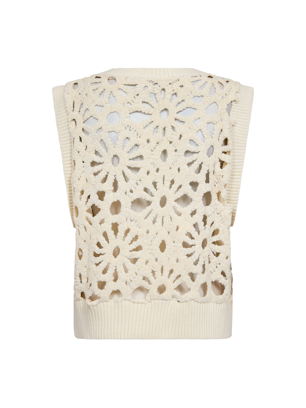 Dieses gehäkelte Weste verfügt über ein dekoratives Lochmuster, das einen leichten und detailreichen Ausdruck bietet. Vorne hat es einen tiefen V-Ausschnitt und breite Rippenkanten, die für ein ordentliches Finish sorgen, während die Rückseite das gleiche Muster für ein einheitliches Aussehen folgt. Die ärmellose Passform macht die Weste einfach als zusätzliche Schicht zu tragen. Kombinieren Sie sie über einer Bluse oder einem einfachen Top für einen lässigen Alltagslook oder tragen Sie sie mit einem leichten Kleid für einen feminineren Ausdruck.