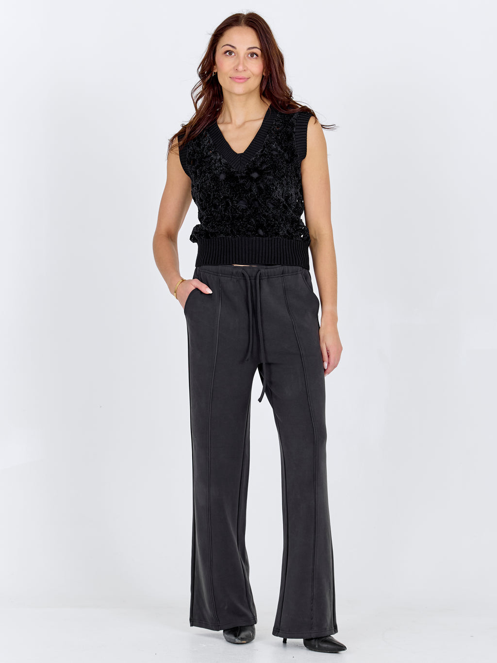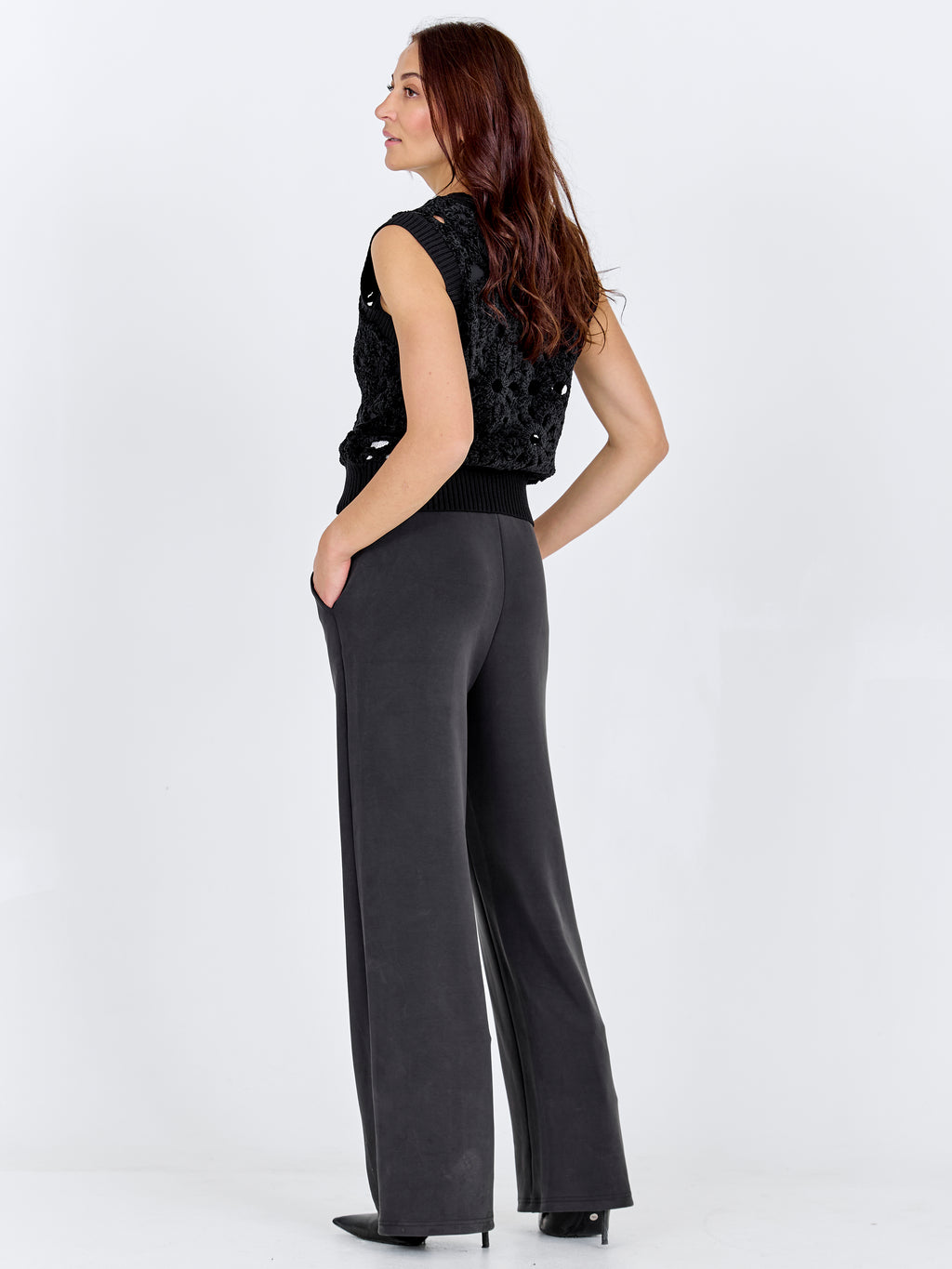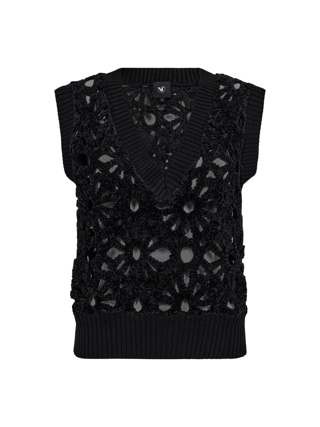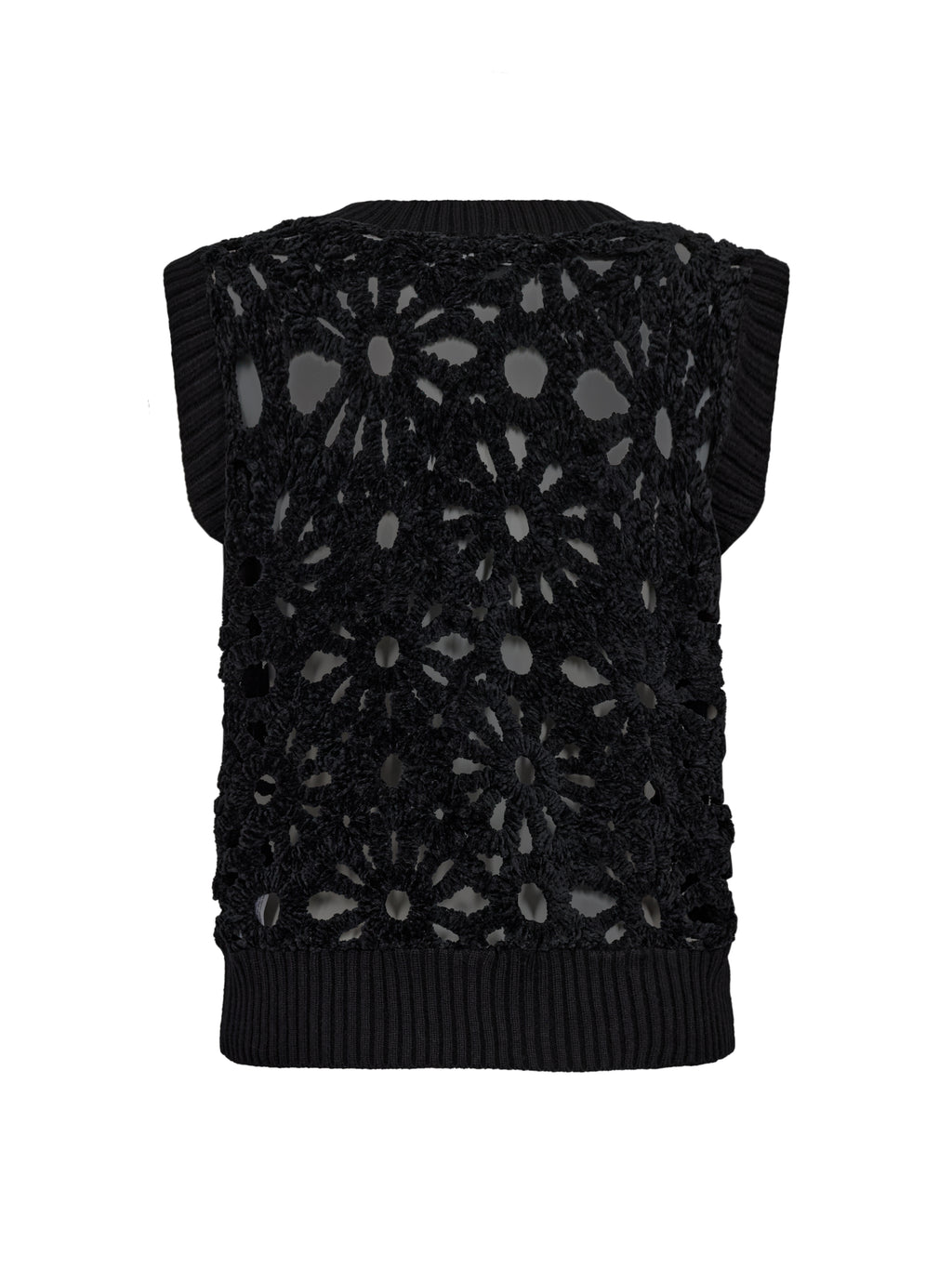 Dieses gehäkelte Weste verfügt über ein dekoratives Lochmuster, das einen leichten und detailreichen Ausdruck bietet. Vorne hat es einen tiefen V-Ausschnitt und breite Rippenkanten, die für ein ordentliches Finish sorgen, während die Rückseite das gleiche Muster für ein einheitliches Aussehen folgt. Die ärmellose Passform macht die Weste einfach als zusätzliche Schicht zu tragen. Kombinieren Sie sie über einer Bluse oder einem einfachen Top für einen lässigen Alltagslook oder tragen Sie sie mit einem leichten Kleid für einen feminineren Ausdruck.