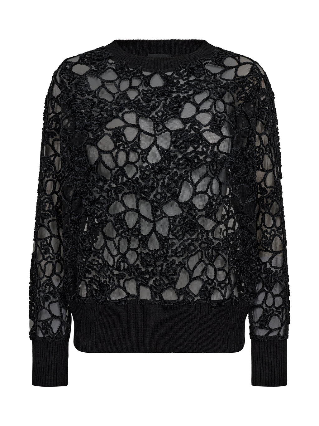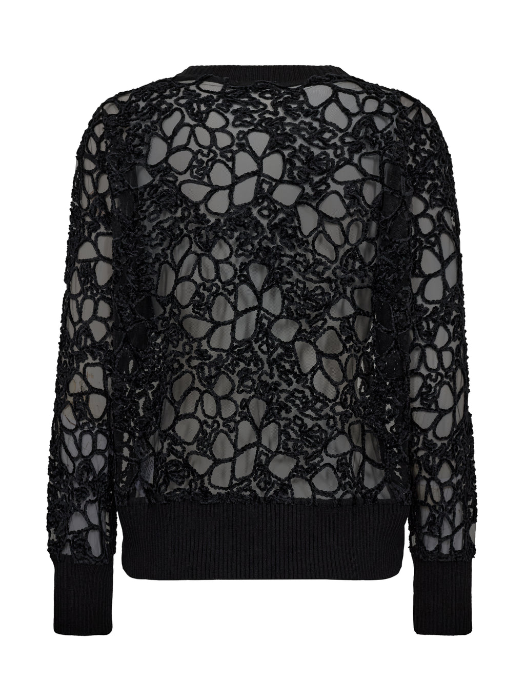 Diese Bluse hat einen leichten und transparenten Ausdruck mit einem blumigen Lochmuster, das ein feines Spiel ergibt. Die Vorderseite ist schlicht mit rundem Halsausschnitt und langen Ärmeln, während die Rückseite demselben Muster folgt und ein einheitliches Ganzes bildet. Kombinieren Sie sie über einem einfachen Oberteil und mit weiten Hosen oder einem Rock für einen lässigen, aber dennoch raffinierten Alltagslook.