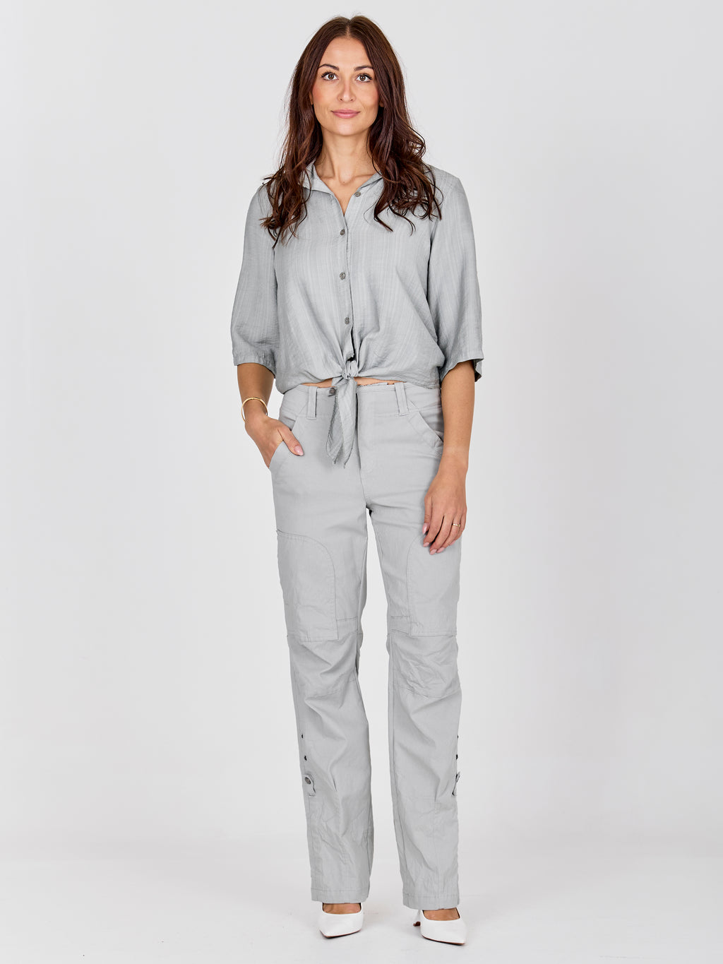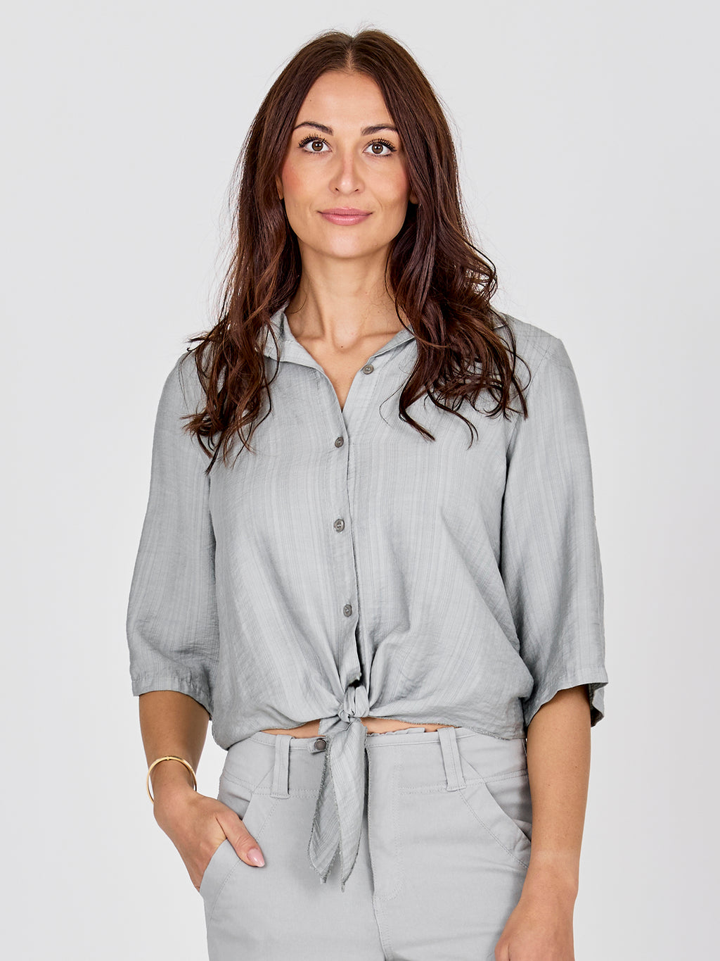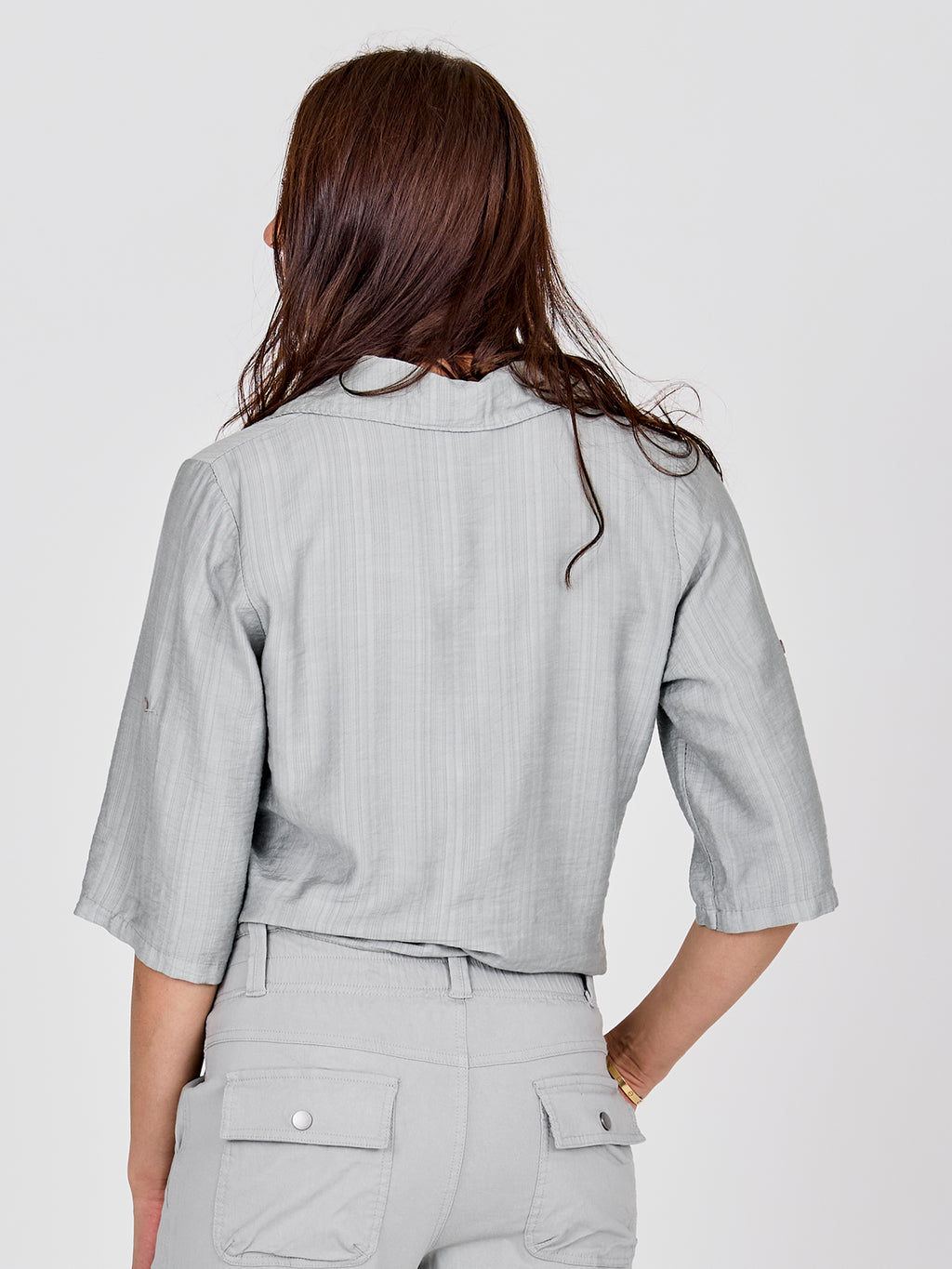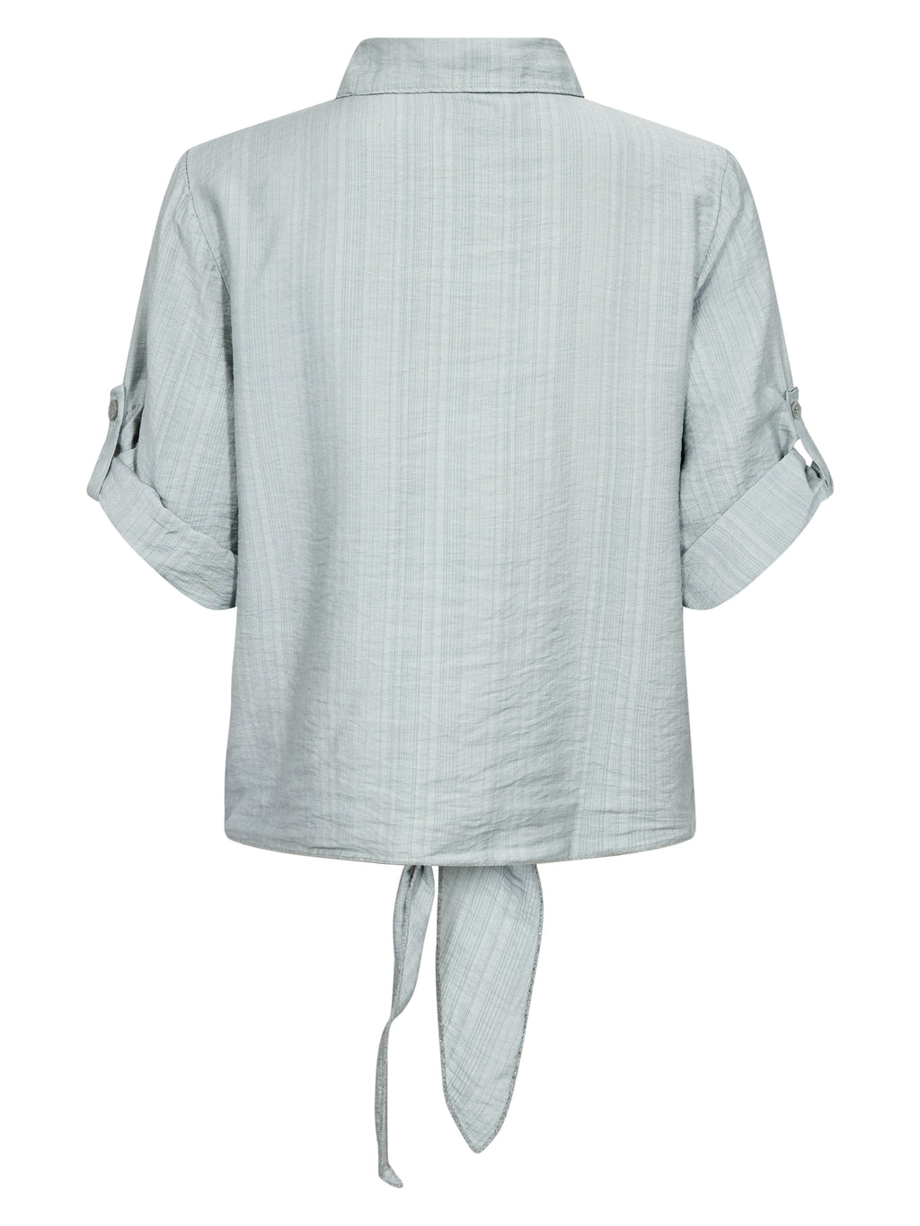 Dieses Hemd hat einen leichten und entspannten Look mit kurzen Ärmeln, die hochgekrempelt und mit einer Schlaufe befestigt werden können. Es schließt vorne mit Knöpfen und endet mit einem dekorativen Bindedetail für einen femininen Touch. Der Rücken ist einfach und gerade geschnitten. Kombinieren Sie das Hemd mit weiten Hosen, einem Rock oder Shorts für einen lässigen Alltagslook, oder tragen Sie es offen über einem einfachen Top an warmen Tagen.