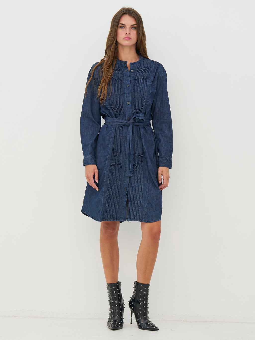 Dieses Jeanskleid hat einen femininen und ausgewogenen Look mit langen Ärmeln und einer Knopfleiste vorne. Die feinen Falten auf der Vorderseite sorgen für Struktur, während der Taillengürtel die Passform auf natürliche Weise betont. Das Rückenteil ist schlicht und fällt schön am Körper entlang. Kombinieren Sie das Kleid mit Stiefeln für den Alltag oder mit flachen Schuhen für einen legeren Look.