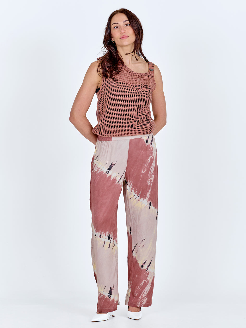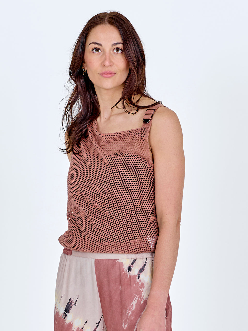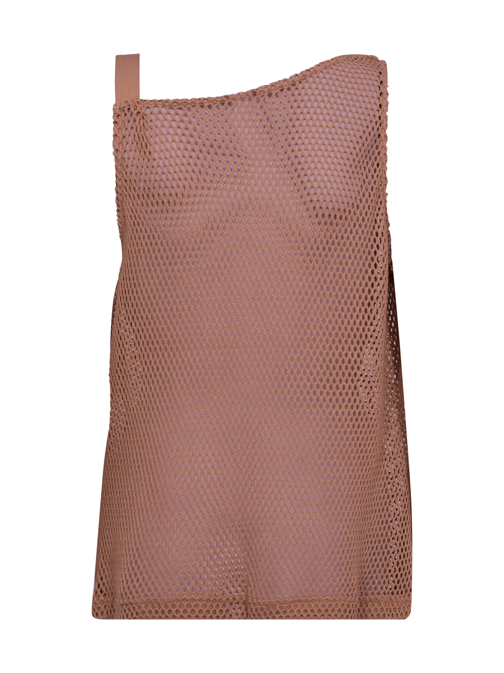 Dieses Oberteil hat einen leichten und einfachen Look mit einem Lochmuster und einem lockeren, asymmetrischen Schnitt. Es fällt sanft über den Körper und hat einen breiten Träger, der ihm ein entspanntes, aber durchdachtes Aussehen verleiht. Die Rückseite ist schlicht und leicht transparent. Tragen Sie es über ein Top oder unter einem Blazer für einen markanten Look.